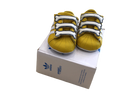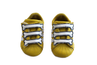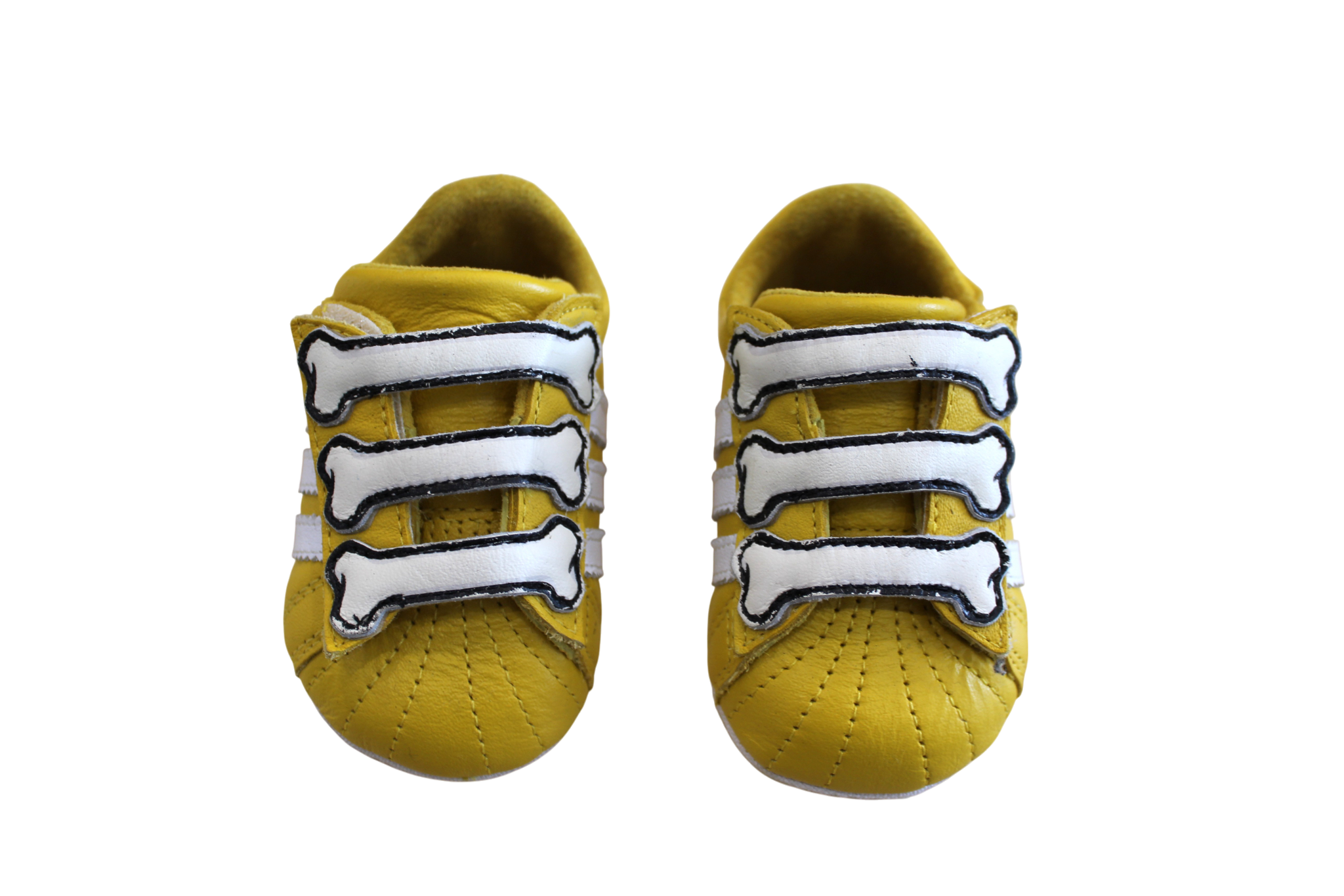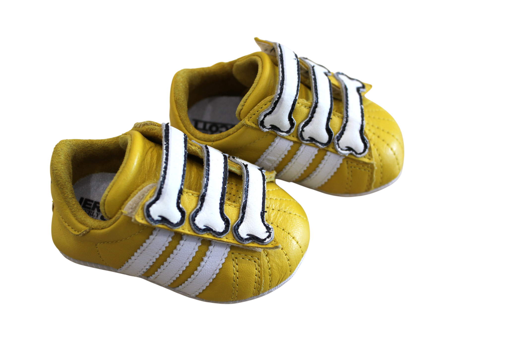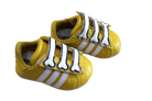 Soft sole leather baby booties. with a felcro foot strap and three bone style details. These classic three-striped shoes with a bright yellow sure to look cool on any bub.