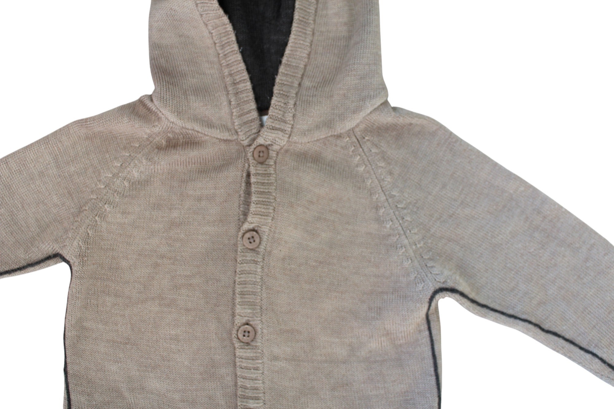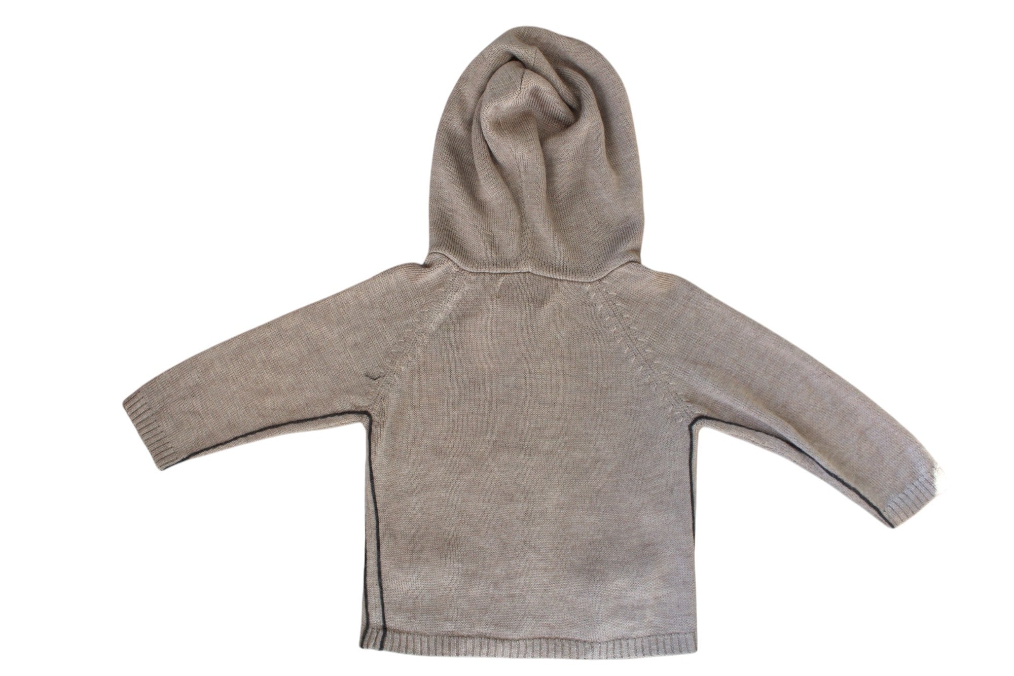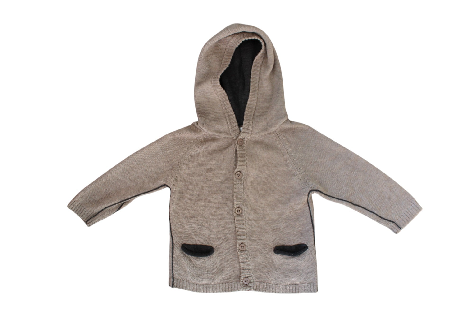 Bebe hooded knitted size 1 cardigan. Features soft taupe yarn with pockets and contrast chain stitch side stripes in charcoal. 75% Acrylic 25% Wool.