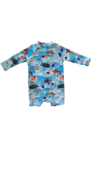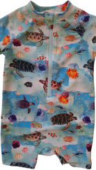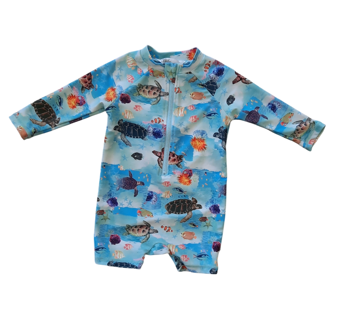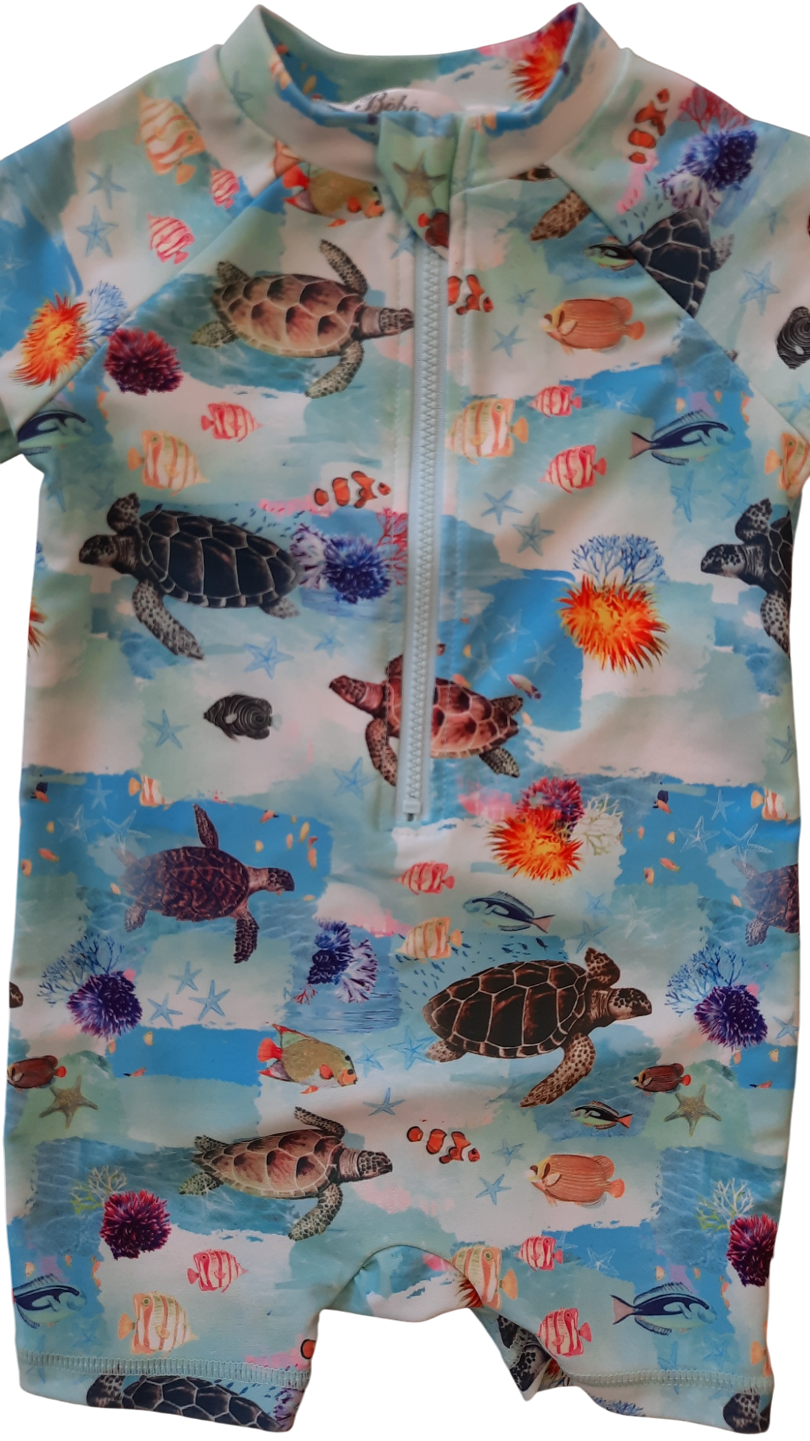 Dive into summer fun with this adorable baby sunsuit featuring a charming turtle pattern. Designed for little swimmers, this one-piece combines sun protection with comfort, keeping your bub safe during beach days and pool time. Size 0.