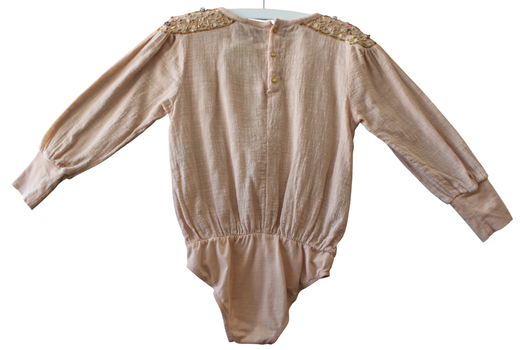 is crafted from very light woven cotton, perfect for keeping you cool and protected under the sun. Featuring charming embroidered shoulders and a button-down neck at the back, it blends playful style with practicality. The elasticated wrists ensure a snug fit, while the leotard bottom keeps everything comfortably in place for all-day fun.