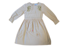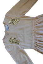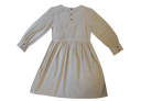 This dress features a beautiful light fabric with patterened detailing, gold embroidered beads and tassels on the waistband. Designed for comfort and ease of movement.