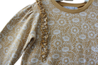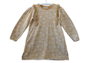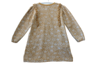 In mustard adorned with delicate white floral prints and charming ruffles, this light sweater dress offers cozy comfort and playful style. Perfect worn alone or layered with tights in cooler months. Side slits add easy movement for all-day fun and freedom.