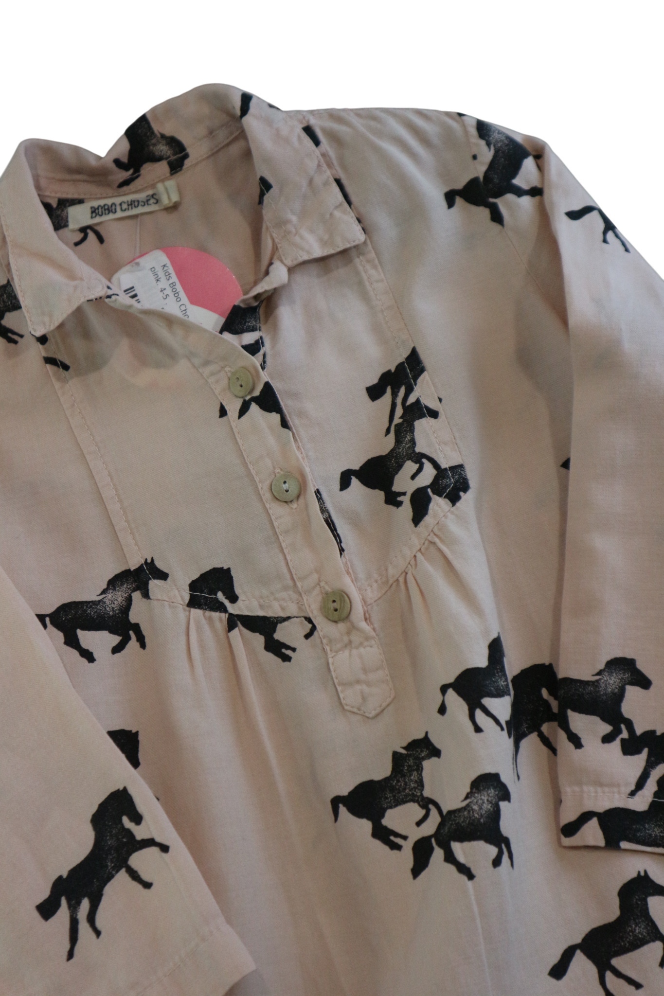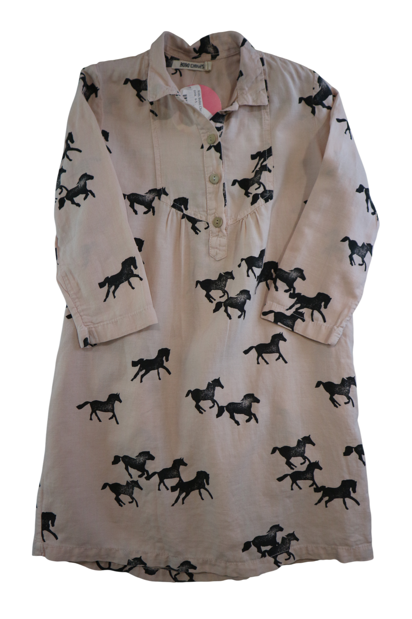 Gallop into style with this charming Bobo Choses long-sleeve dress featuring an adorable horse print. Perfect for little adventurers, the soft pink hue and whimsical equestrian design spark imagination and joy. The long sleeves provide comfort and coverage for year-round wear, while the playful aesthetic makes getting dressed fun. Ideal for everyday adventures, playdates, or special occasions, this dress combines comfort with character that kids love. Very good condition.