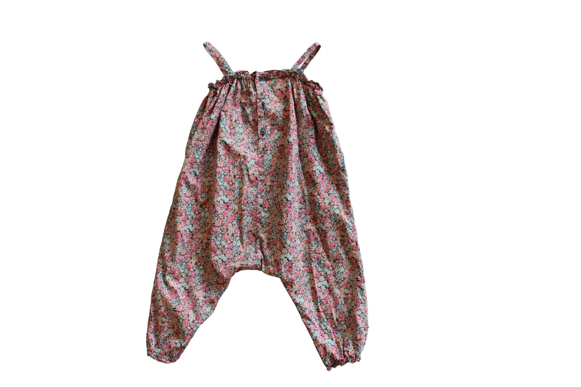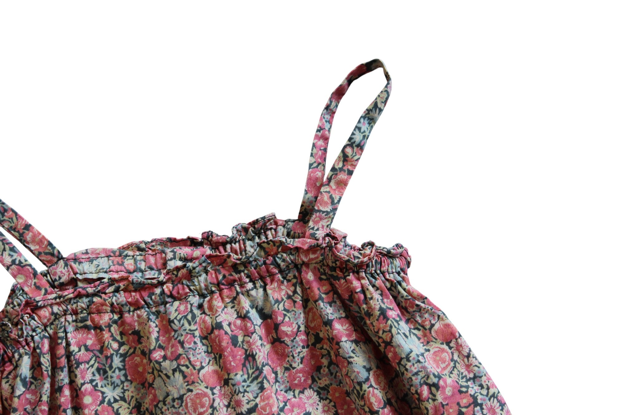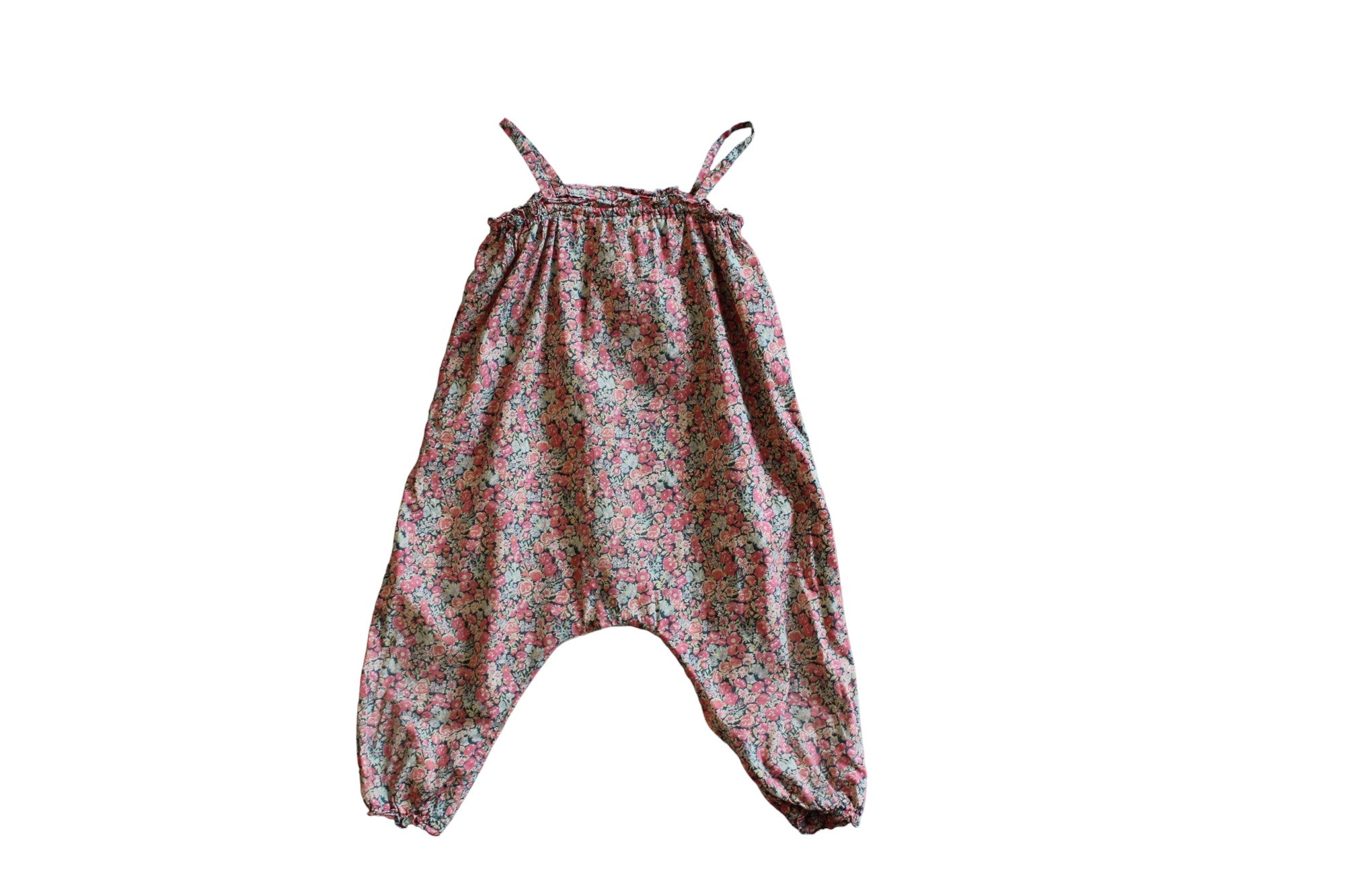 Gathered straight neckline singlet long playsuit in beautiful lightweight cotton floral fabric. with three-button-up back opening, gathered hem pant bottoms.