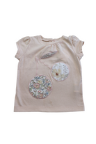 Bonpoint pink t-shirt with floral cherry print applique, size 6m (00). Made in Portugal. 100% cotton.