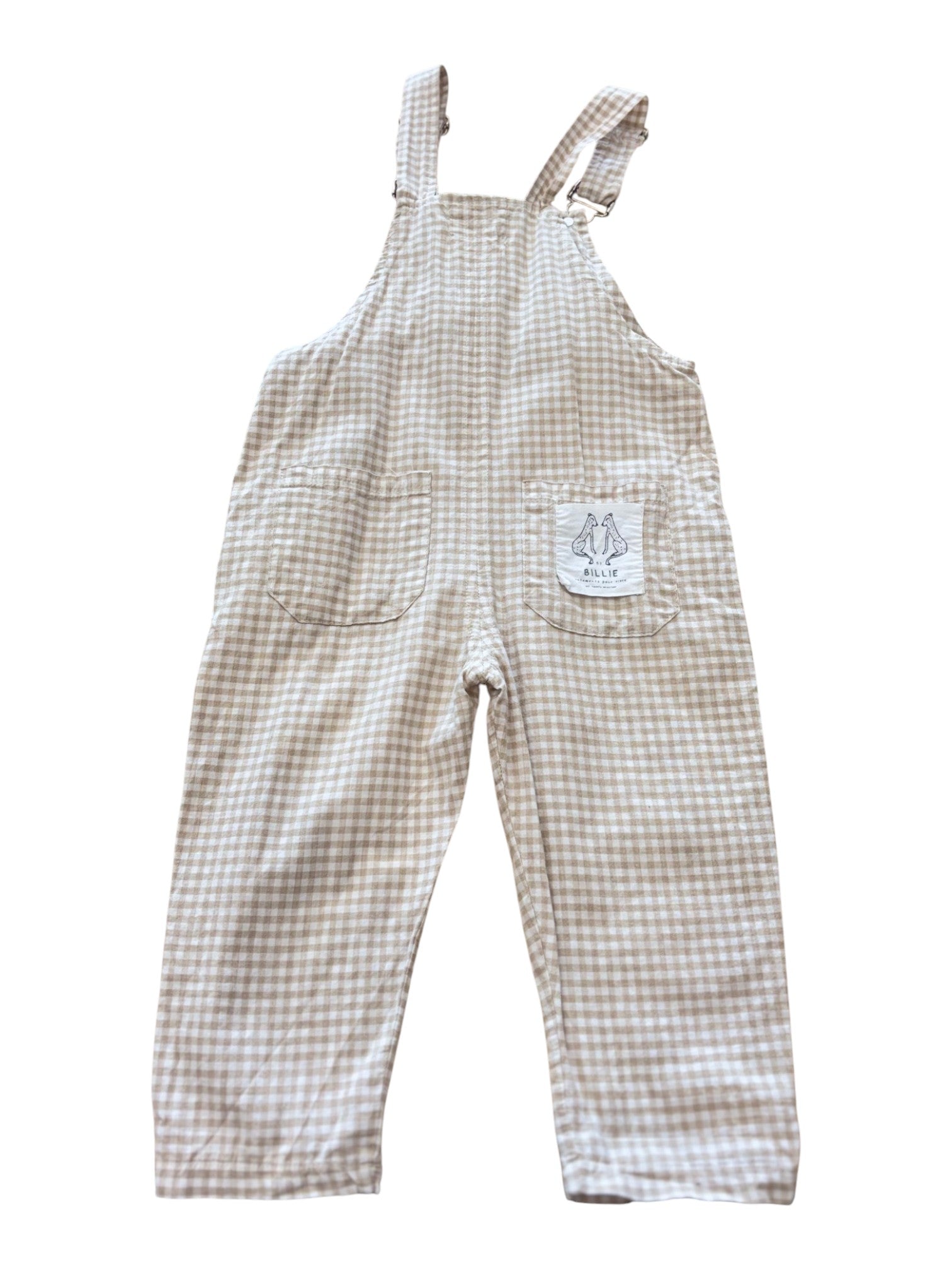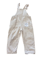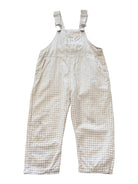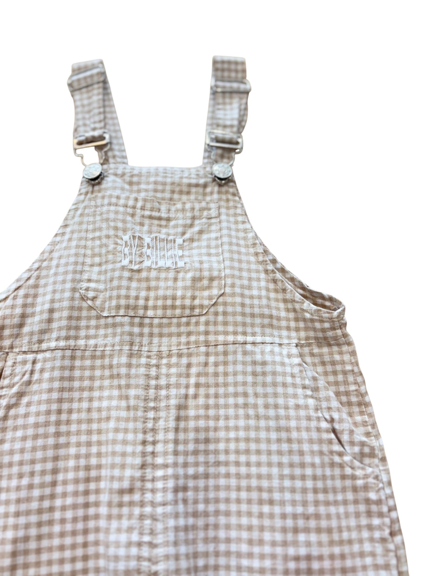 Adorable beige and white gingham overalls designed for toddlers size 1. Lightweight fabric, adjustable straps, and handy pockets make these By Billie overalls perfect for playtime adventures.