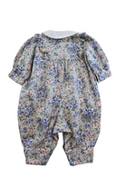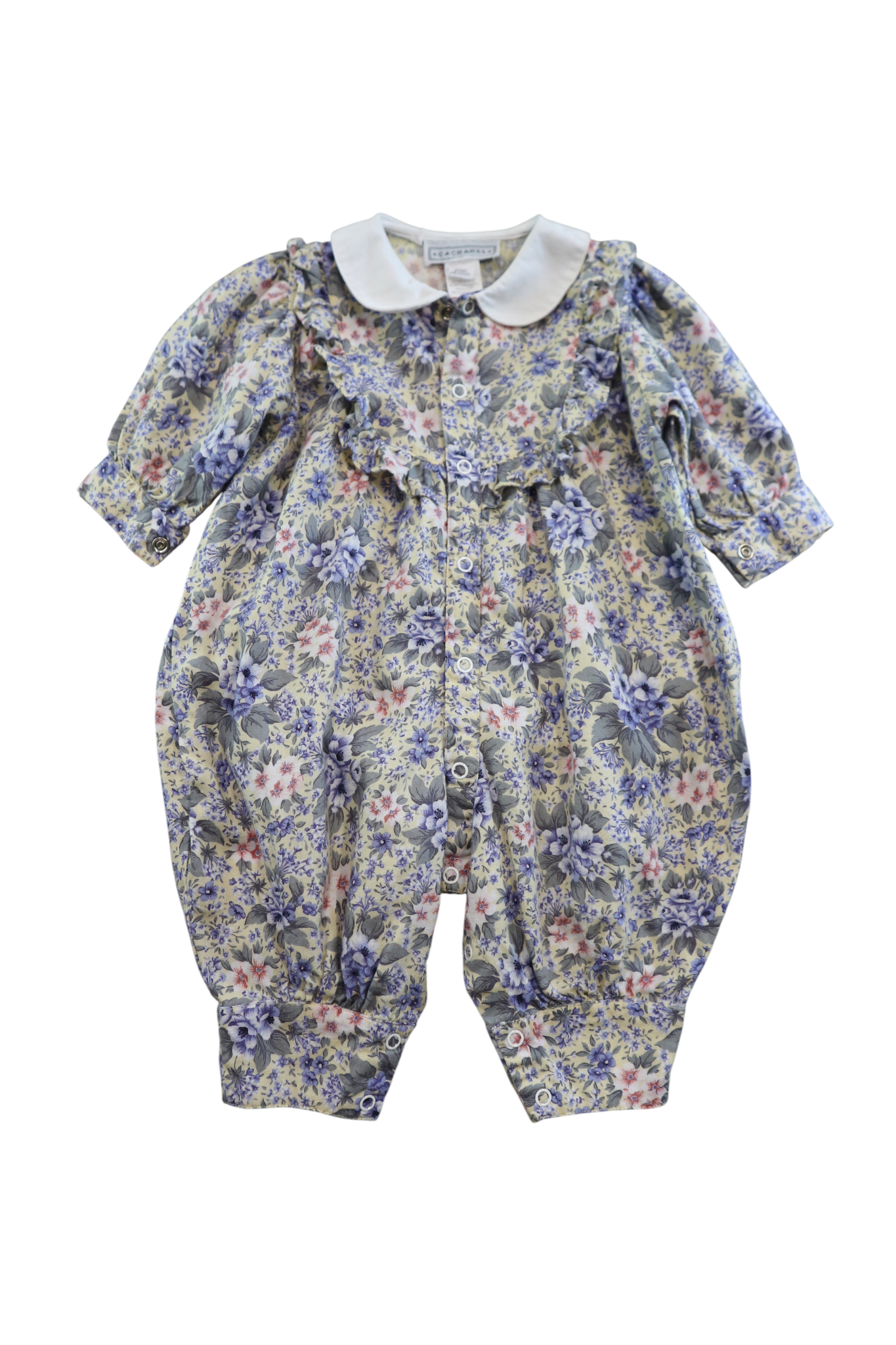 Cacharel vintage playsuit in yellow with floral print. Snap button front closures and collar. Approx size 00-0. Made in France.