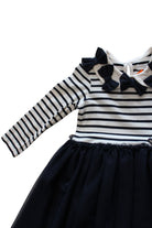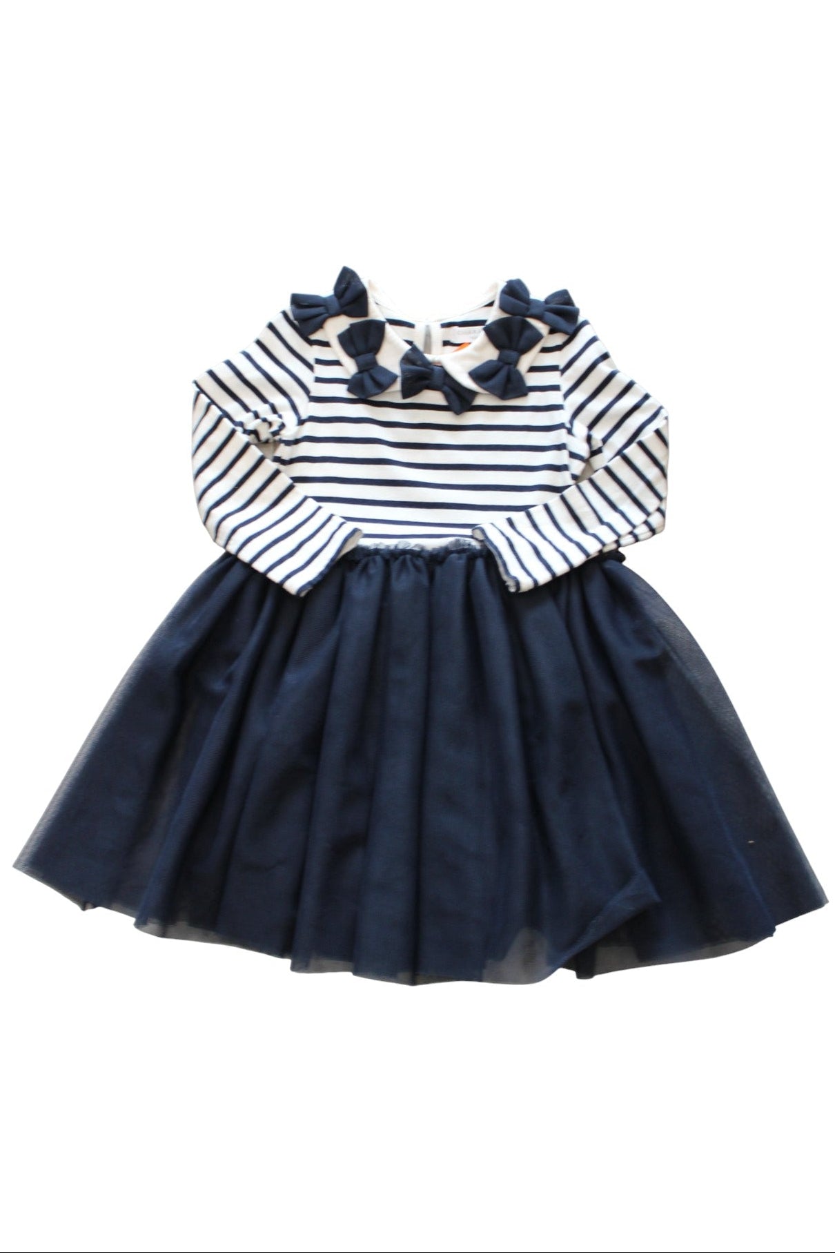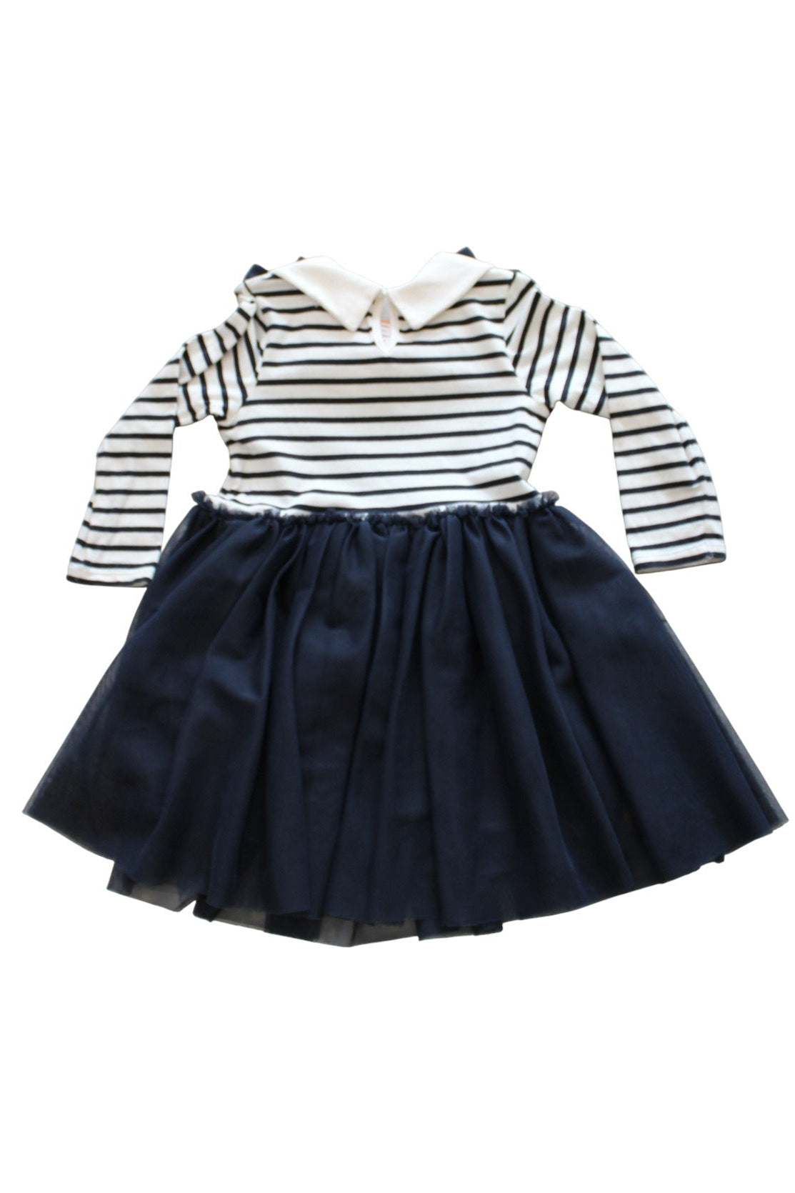 Refined elegance meets playful charm in the Charabia Dress, sized for 4. This sophisticated piece features a navy base with crisp white stripes, elevated by delicate tulle skirt that adds an air of understated luxury. Perfect for special occasions or everyday moments that deserve a touch of grace, it's a timeless investment in quality and style.