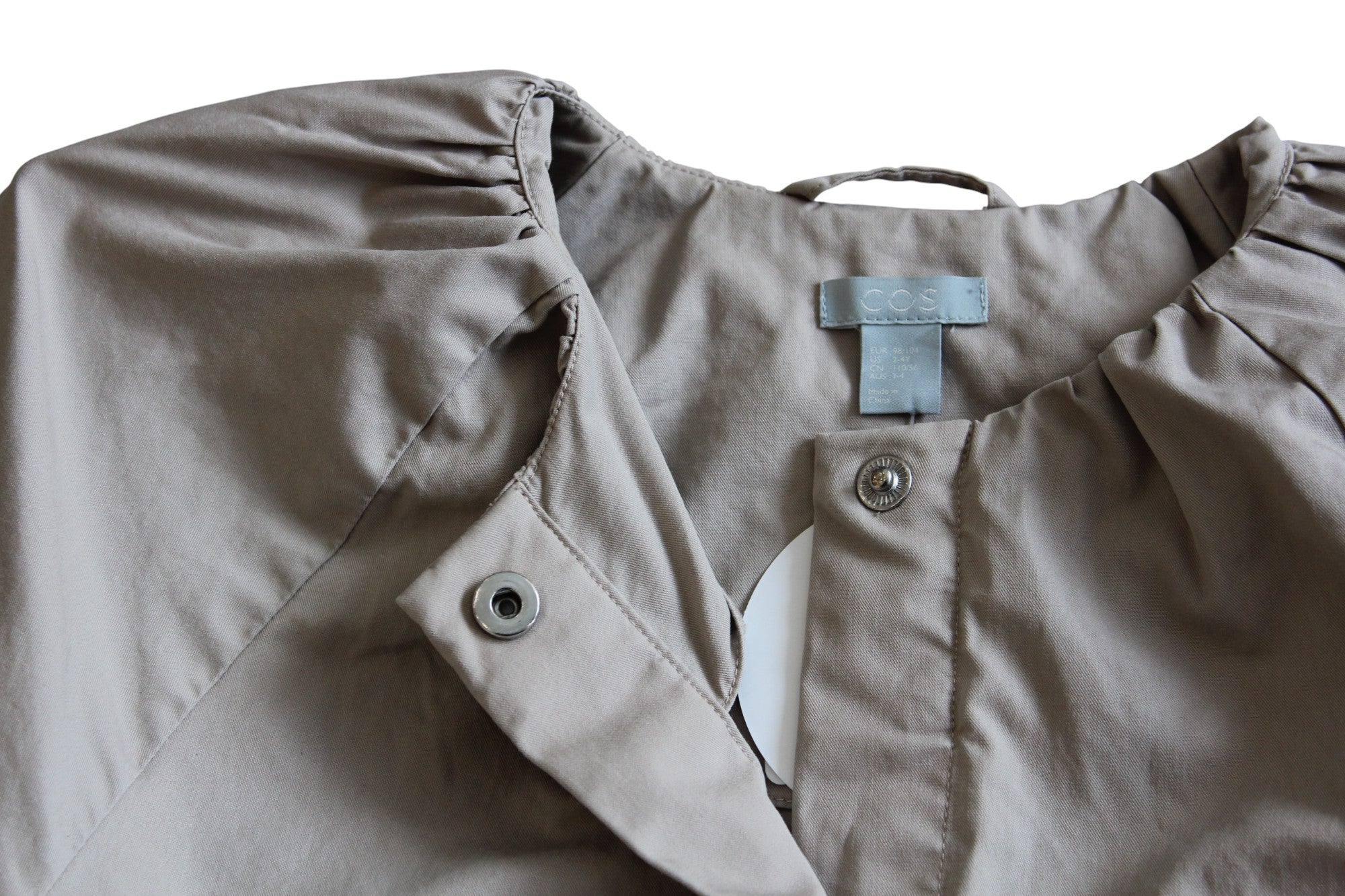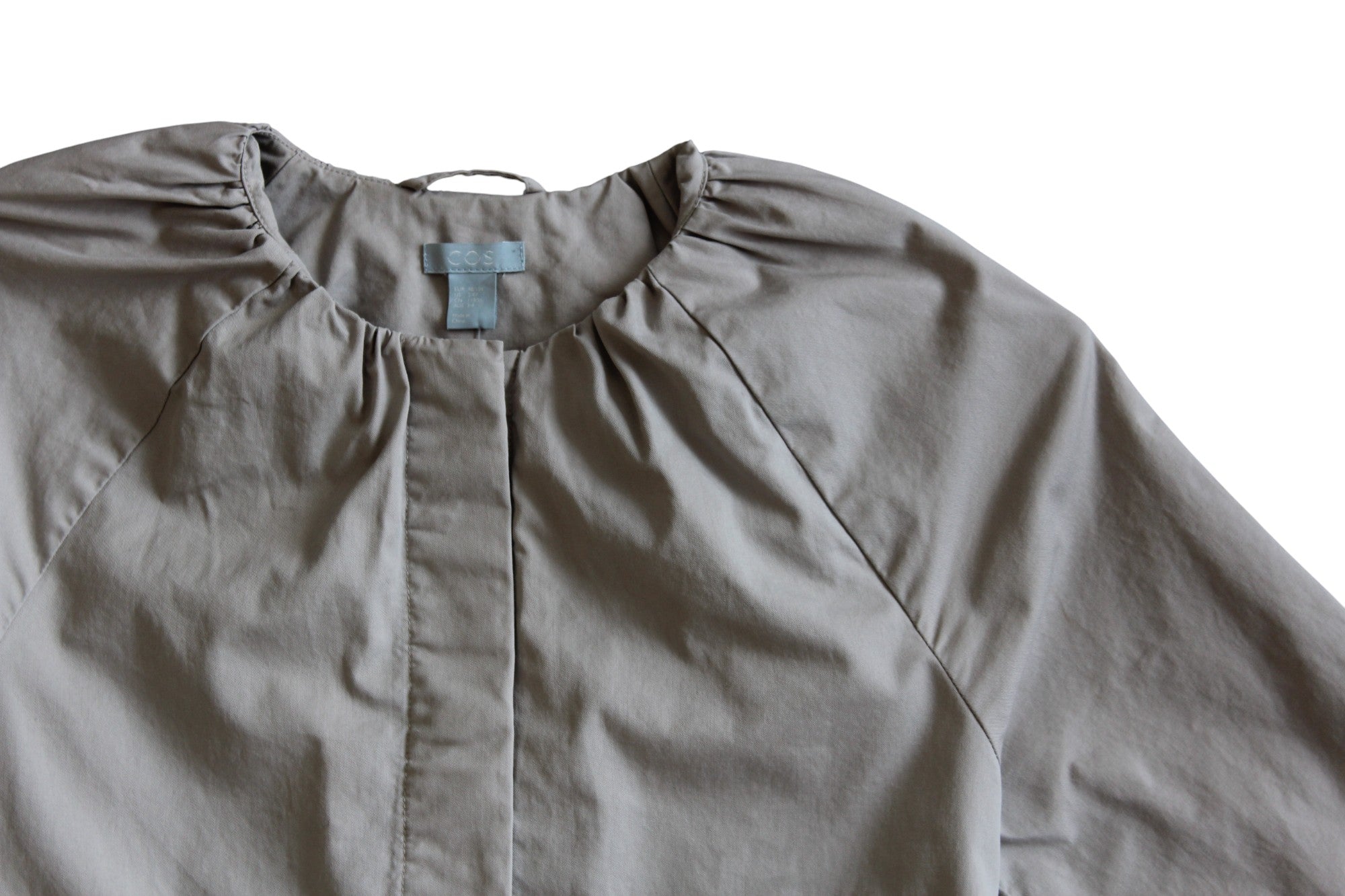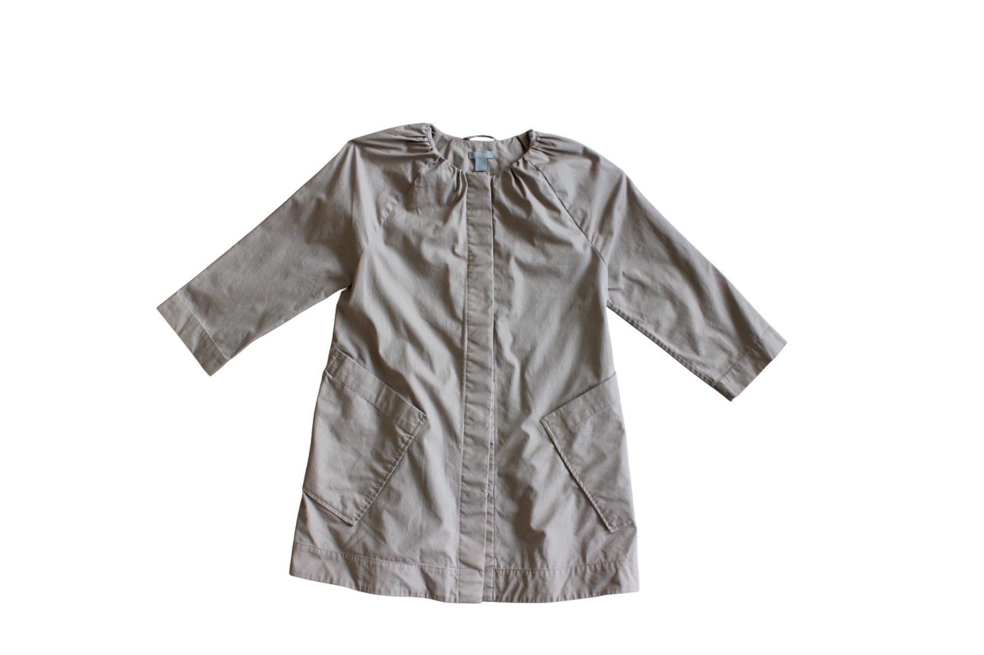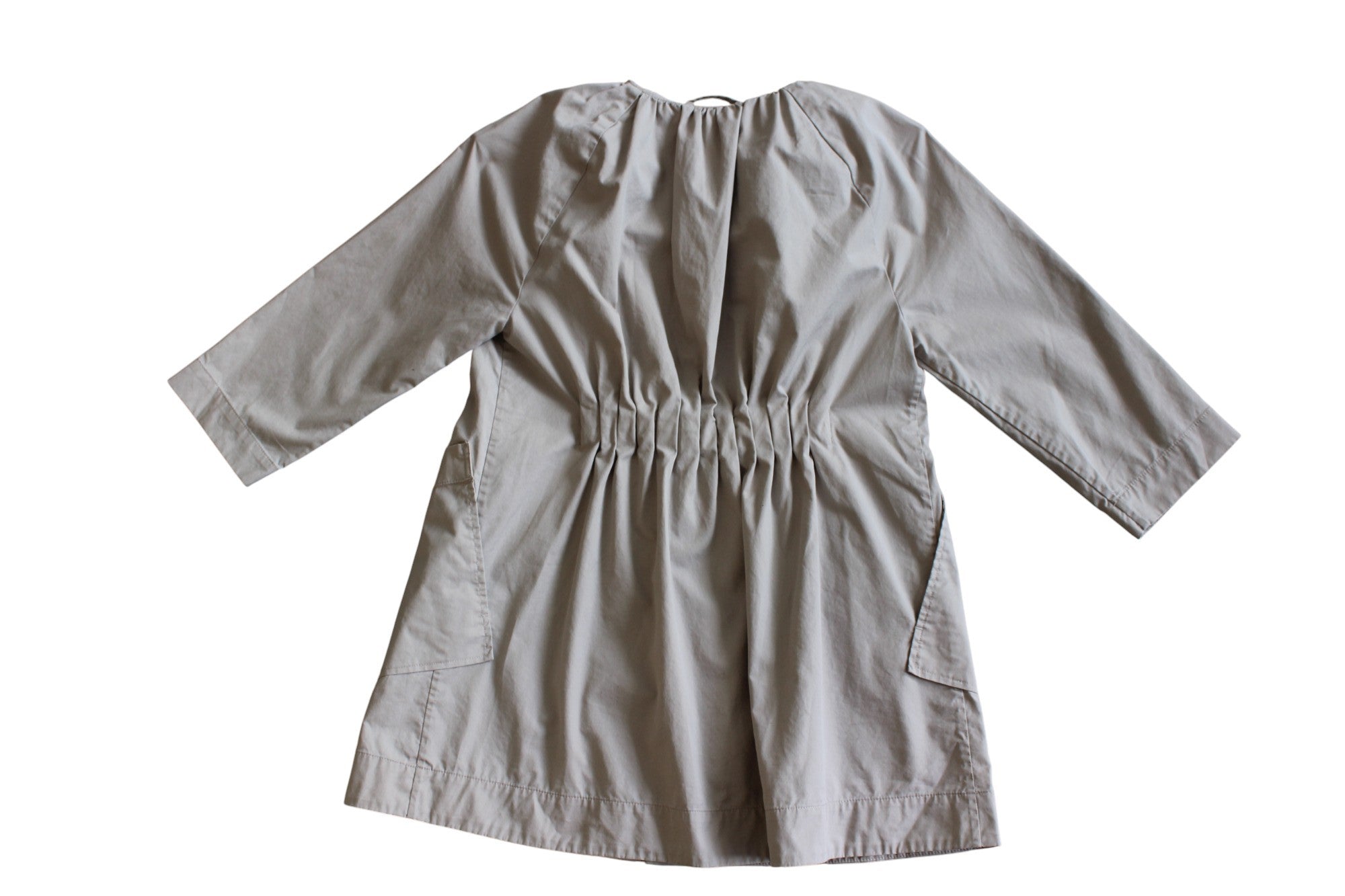 Overcoat-style dress with two angled front pockets and a popper-front opening. Centre back gathered waist for shaping and raglan sleeves. Great for layering over, or wear open with another dress.