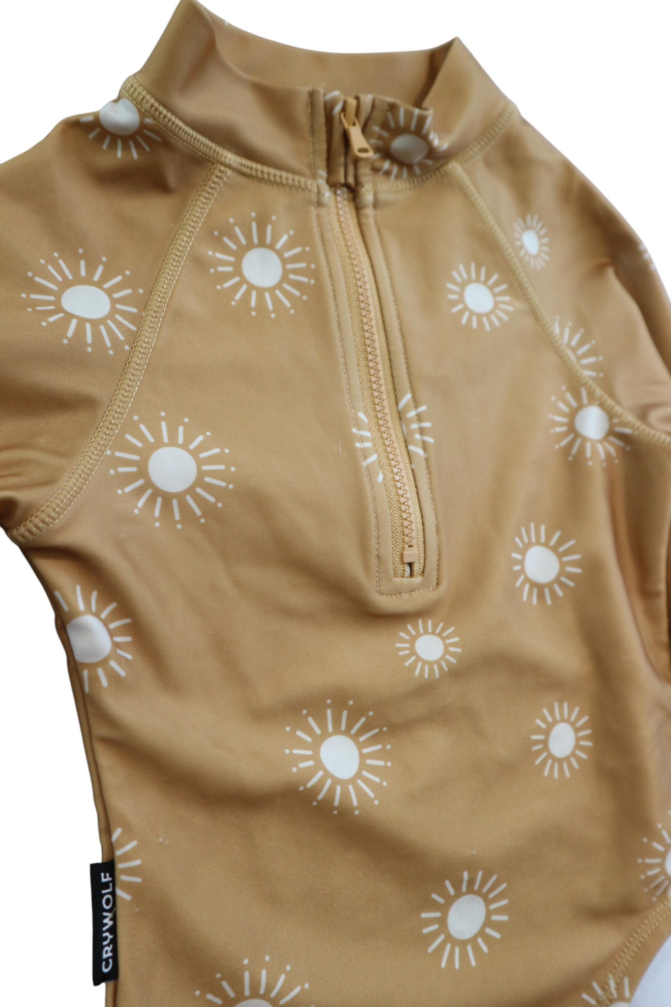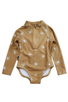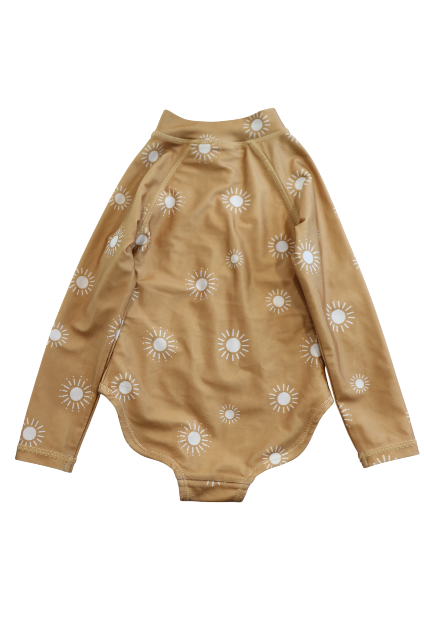 Cry Wolf long-sleeved swimsuit in mustard with all-over sun print, size 1. Recycled polyester/spandex.
