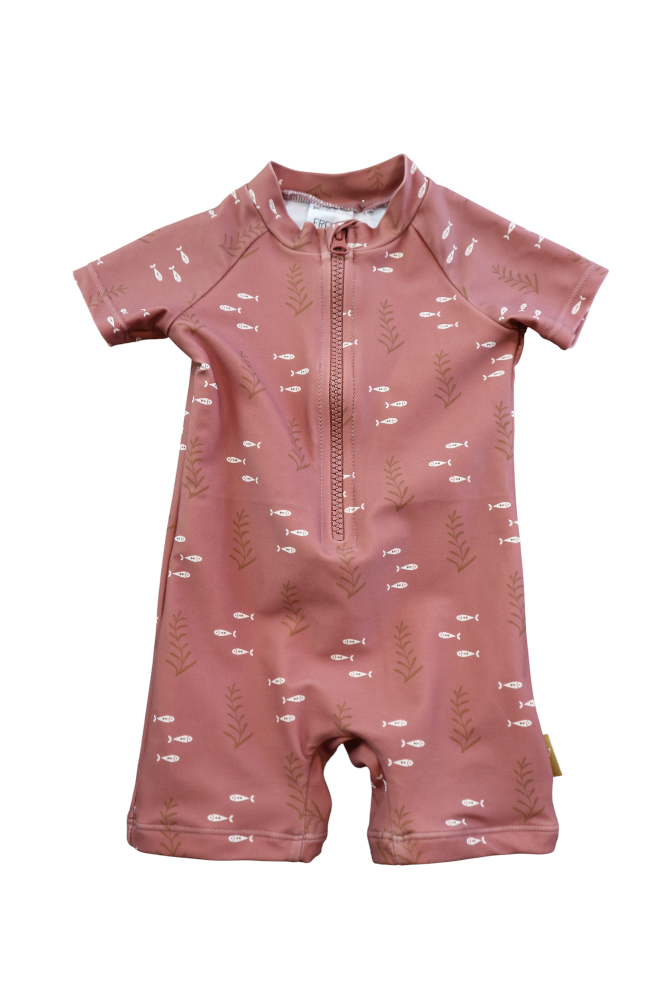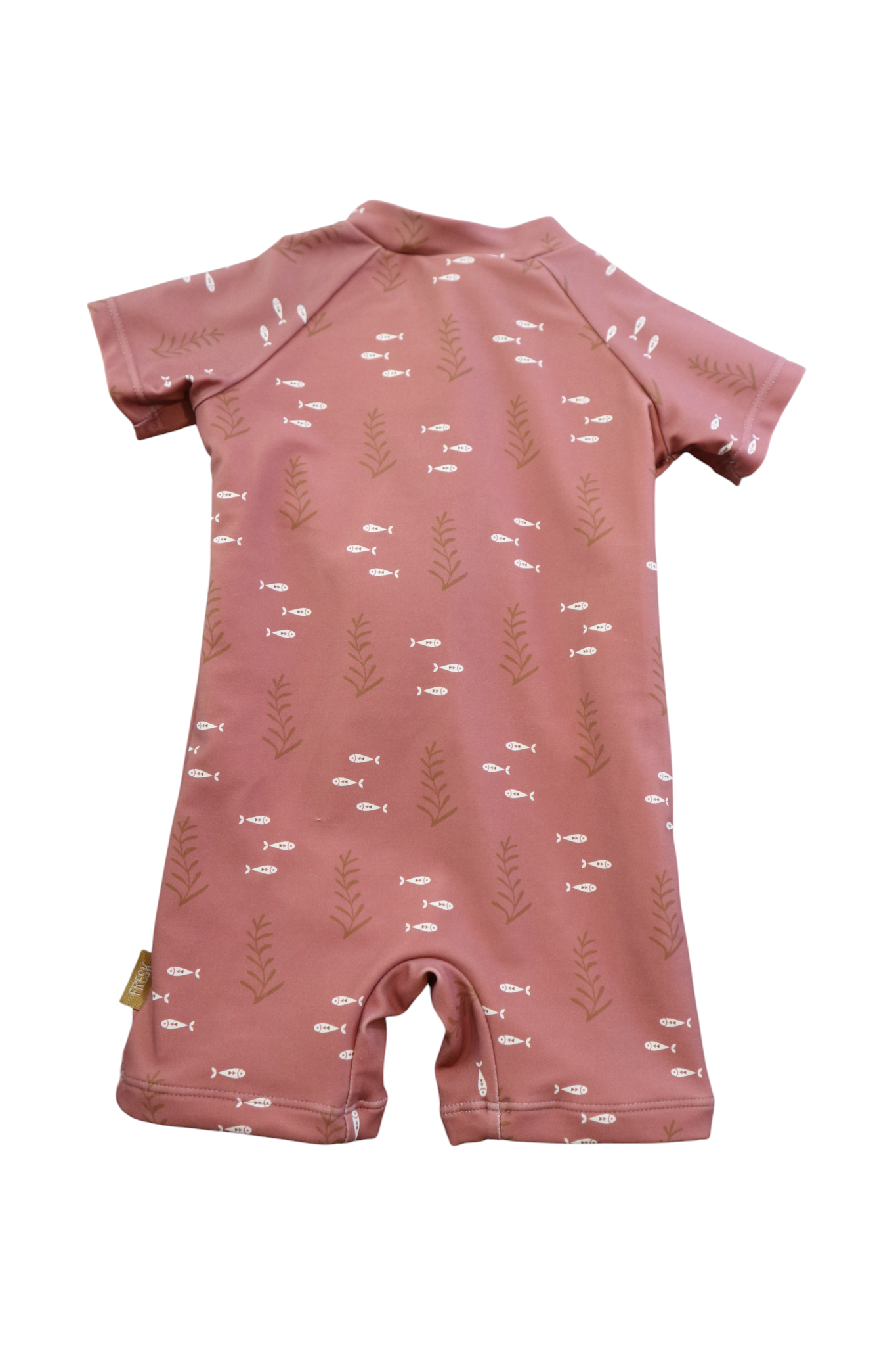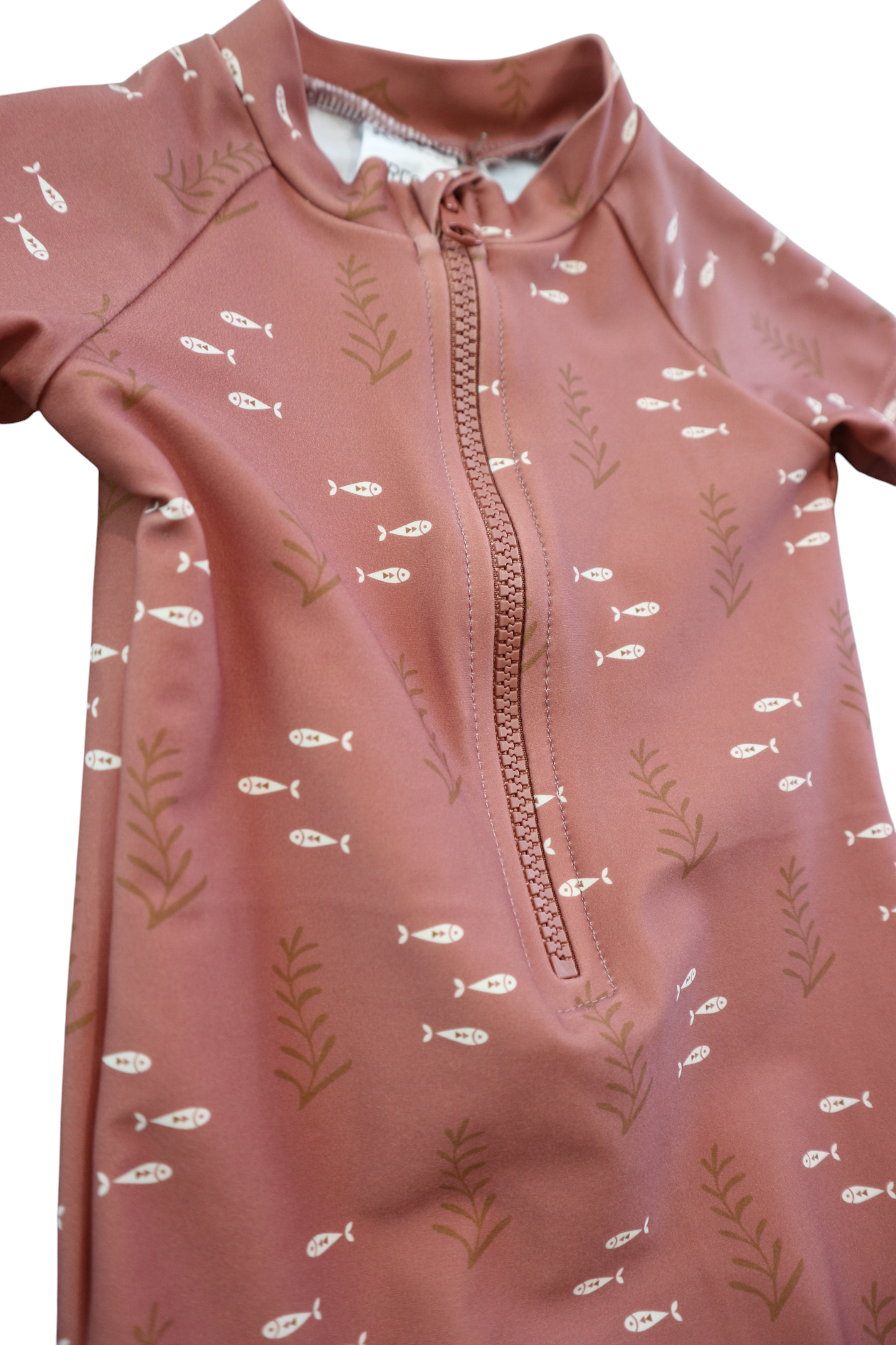 Fresk zip sunsuit in mauve with fish print, size 0. Recycled nylon/spandex/polyester.