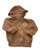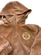 Cosy meets cool in this brown corduroy hoodie! The oversized fit is perfect for layering, while the ruched waist adds a fun silhouette. A quarter-zip makes it easy to slip on, and practical pockets keep little hands happy. The cute yellow embroidered Goldie & Ace logo adds that signature charm.