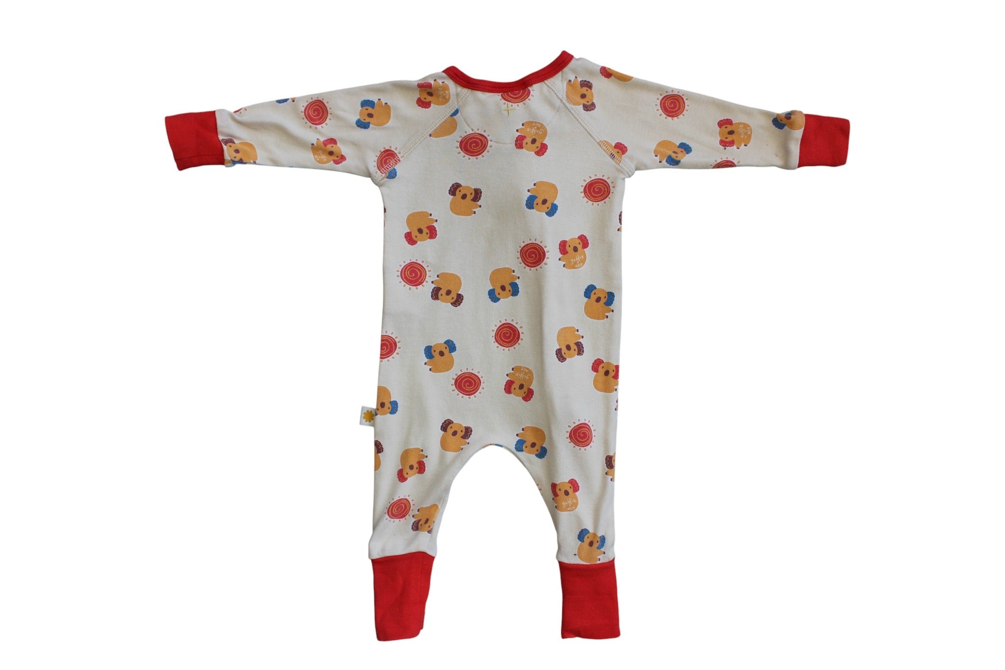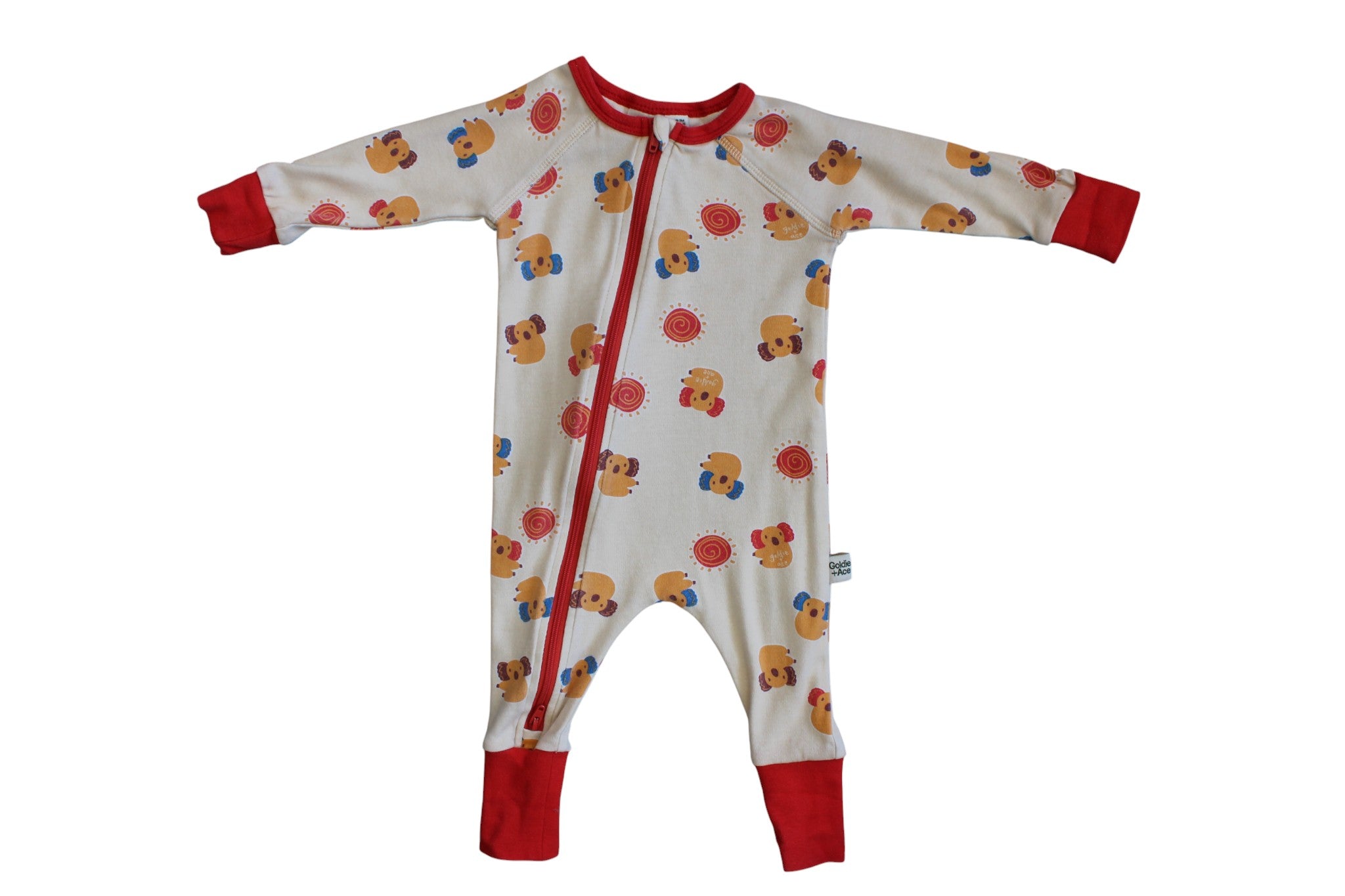 Aussie Koala red, orange and cream print jumpsuit. Red two-way zip up front, foldable ribbed sleeve and foot finishing. Comfy raglan sleeve for arm movement and bound neckline.