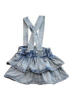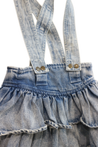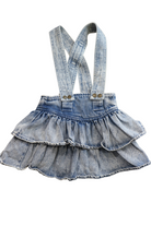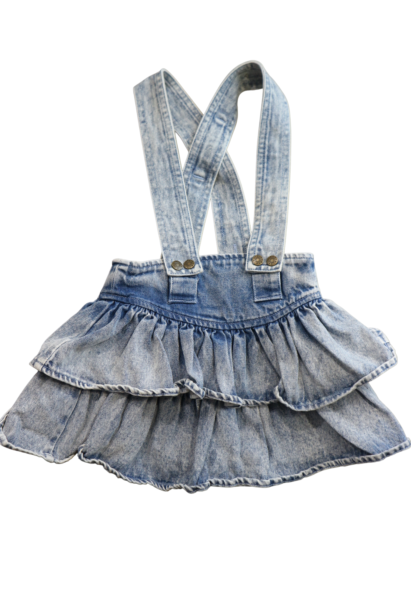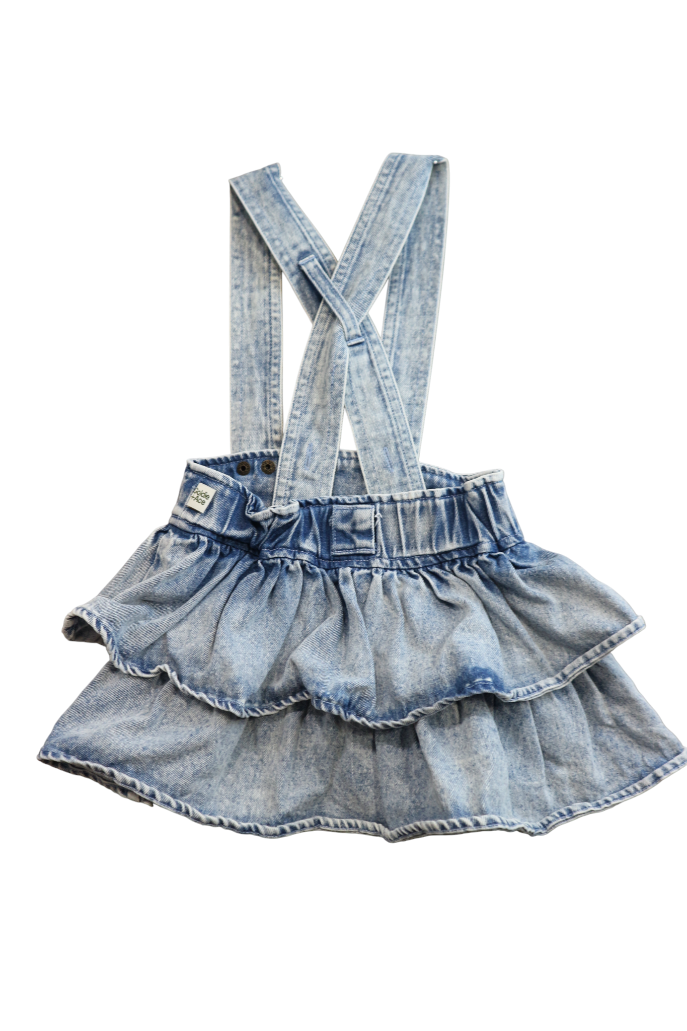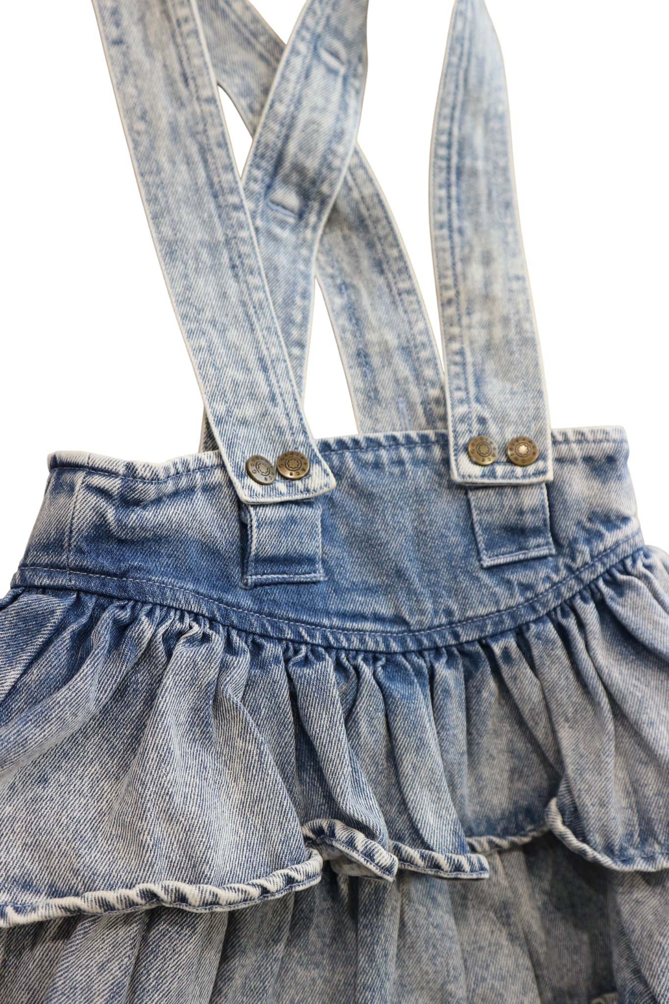 Goldie & Ace blue denim pinafore with ruffle skirt, size 2. Cotton.