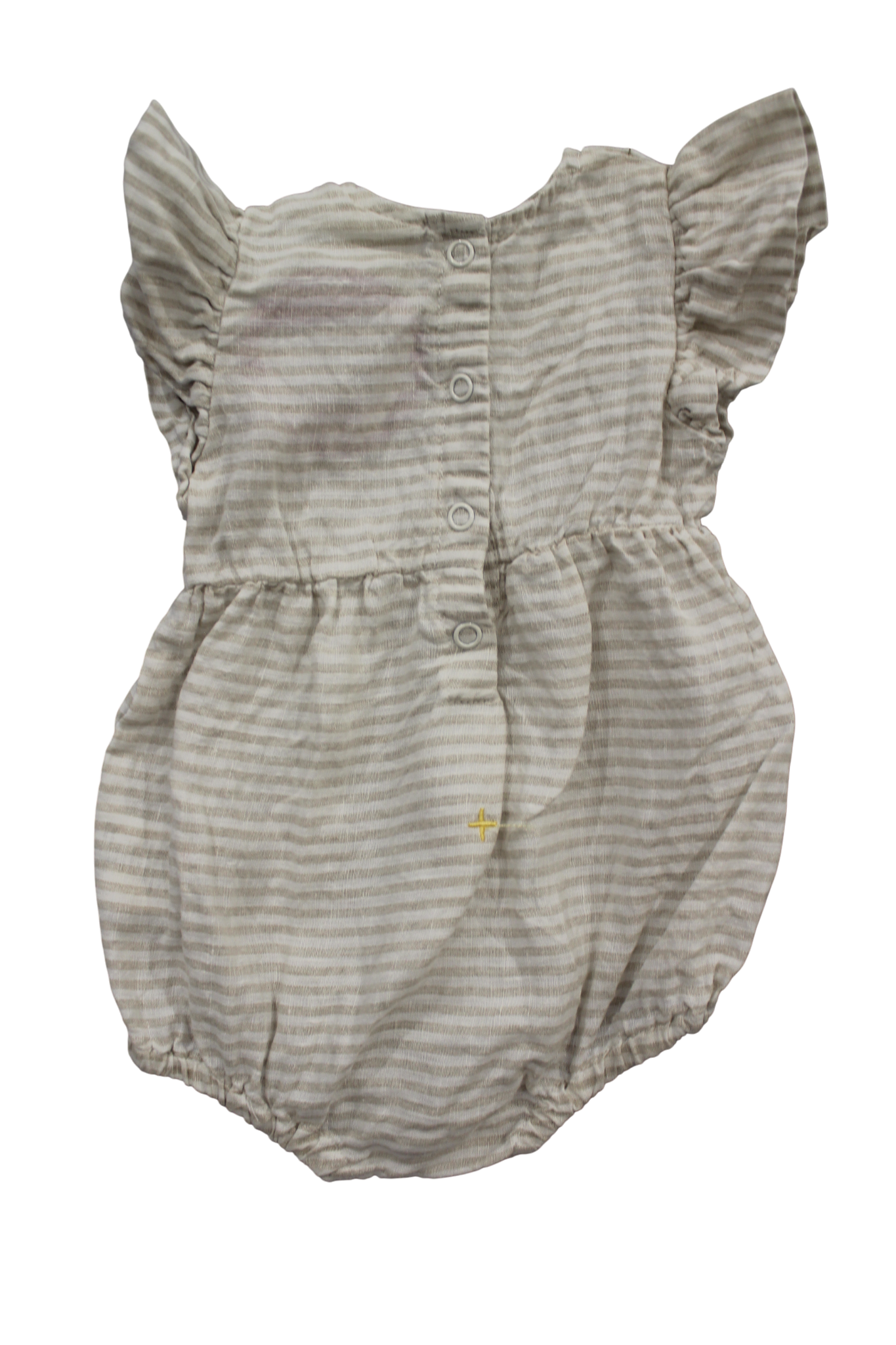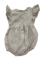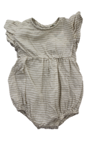 Adorable linen stripe baby romper perfect for warm weather adventures. Crafted from breathable linen, this charming one-piece keeps little ones cool and comfy all day long. The classic stripe pattern adds a touch of timeless style, while the easy snap closures make nappy changes a breeze. Ideal for playdates, family outings, or lazy summer days at home. Very good condition.