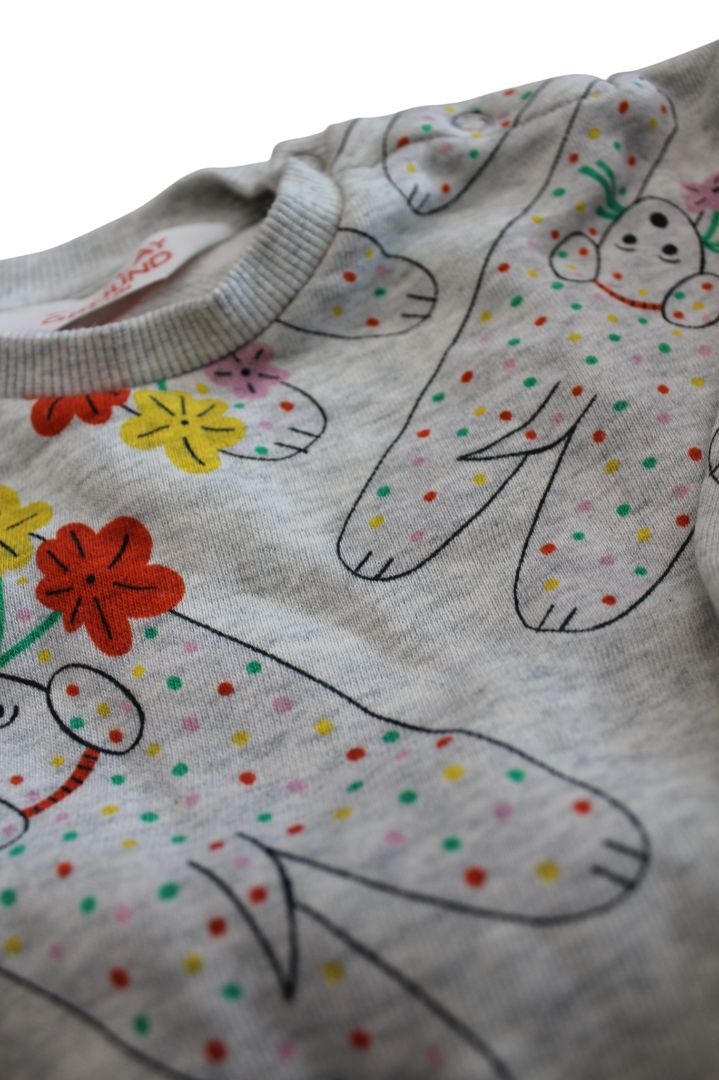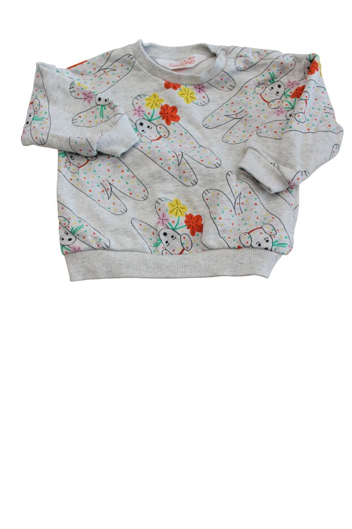 Cosy and charming, this grey marle baby jumper features an adorable dog print that'll have little ones smiling. The soft fabric keeps your baby comfortable all day long, while the playful design adds personality to their wardrobe. Perfect for layering through cooler months or wearing on its own. A delightful choice for parents who love quality basics with character. Good preloved condition.