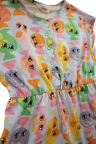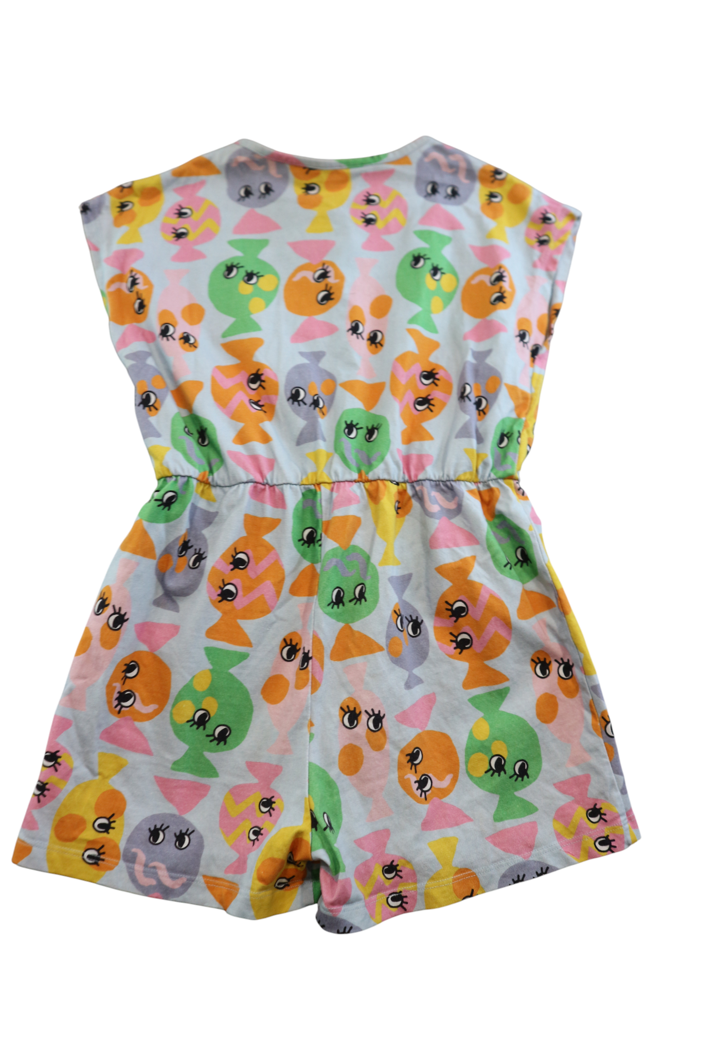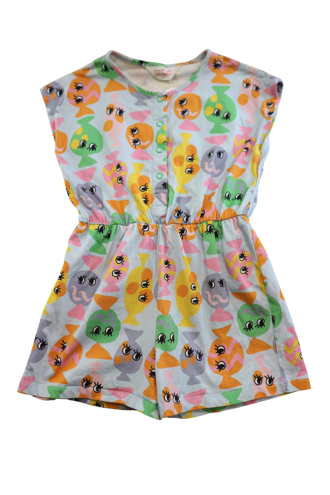 Gorman Playground blue playsuit with all-over lolly print, size 6-7yrs. Organic cotton.