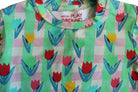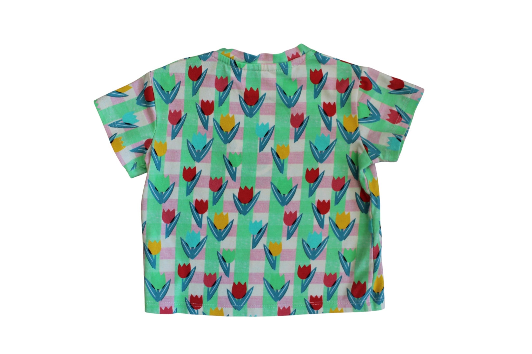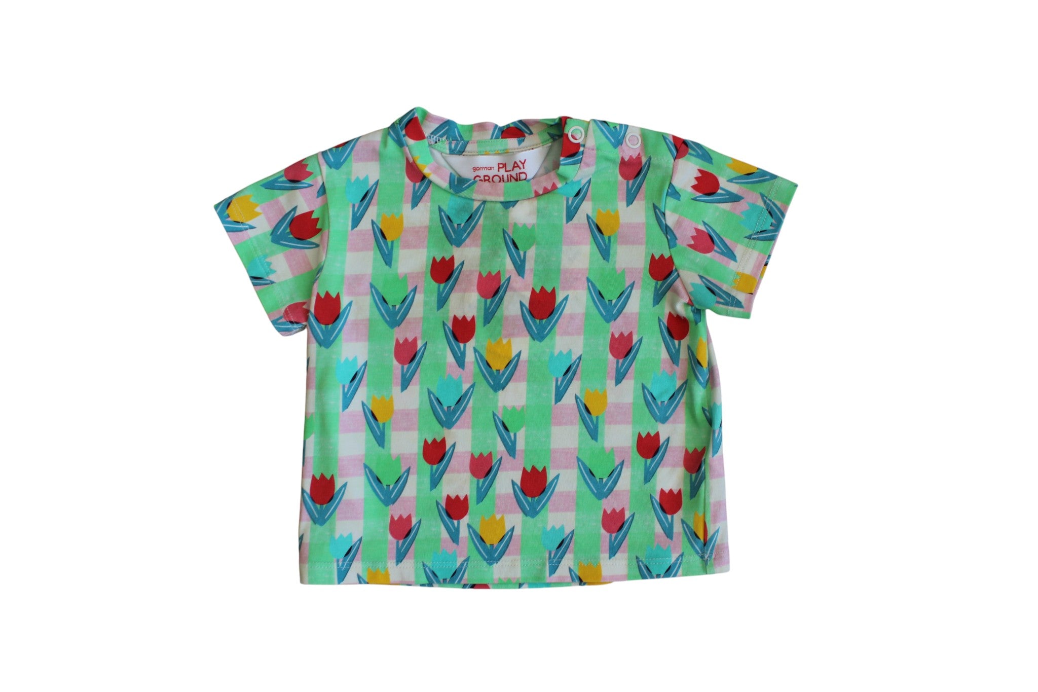 Green and pink graphic print tea with overlay flowers. Light-weight cotton and two poppers on the shoulder.