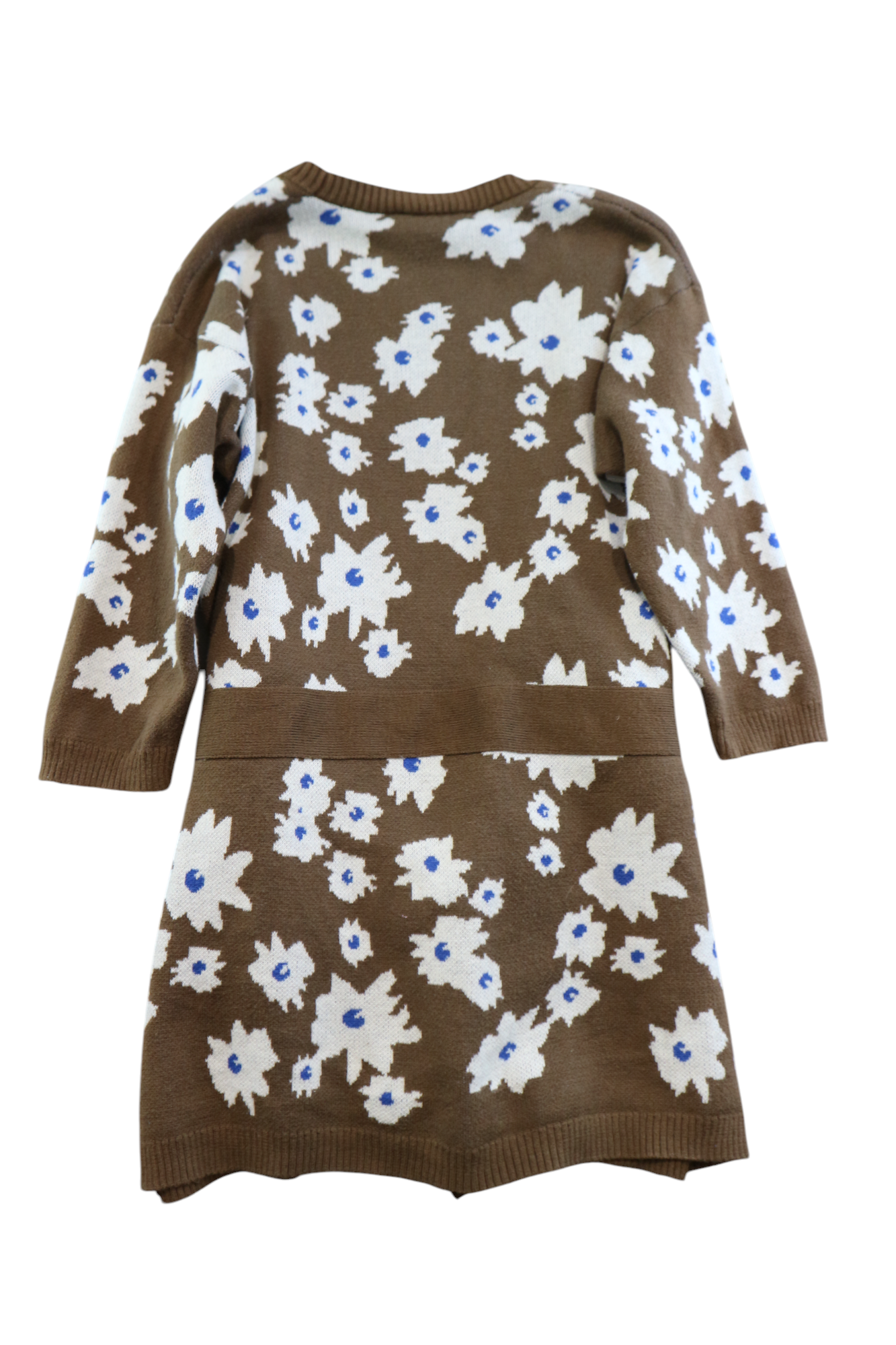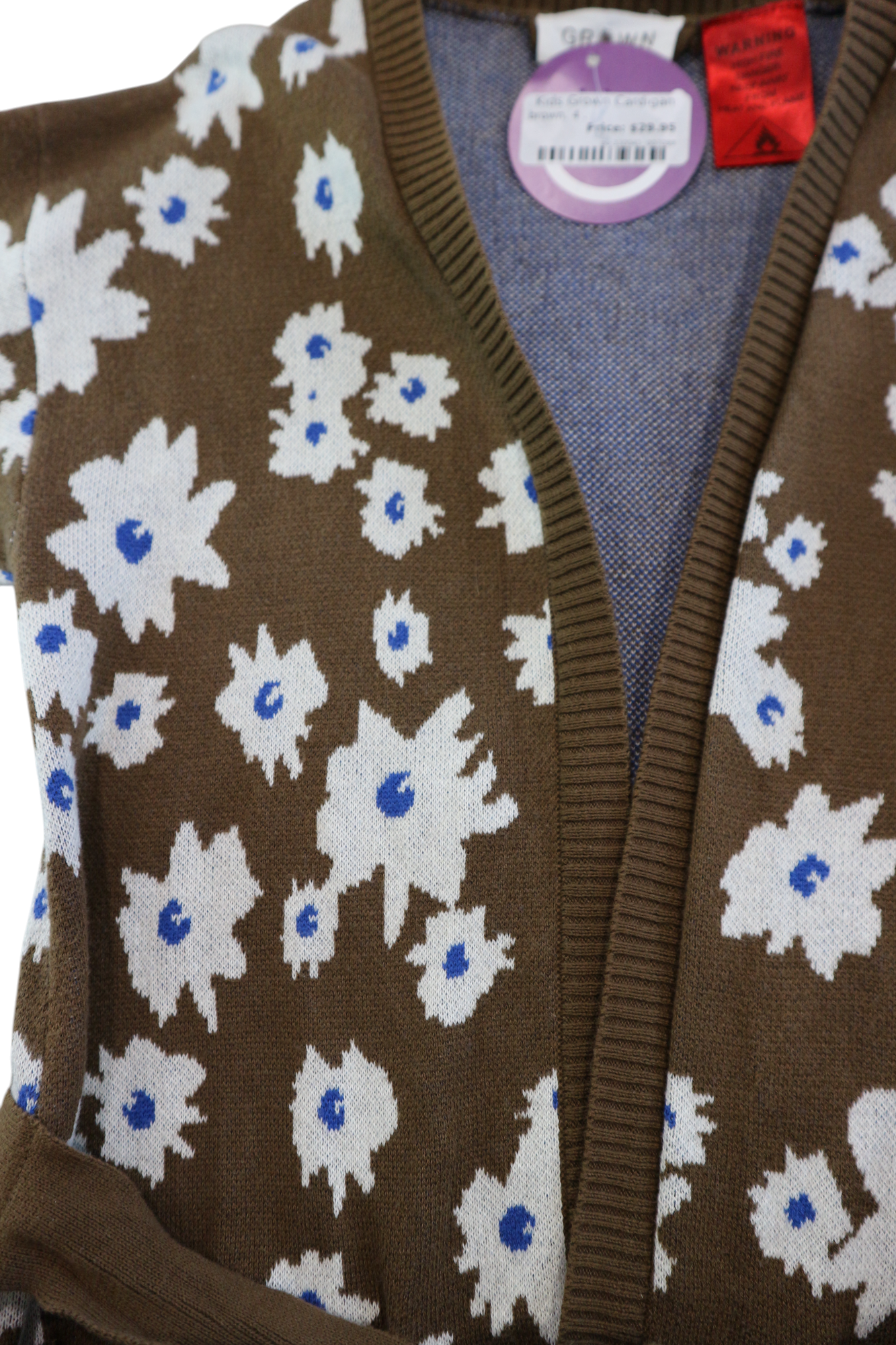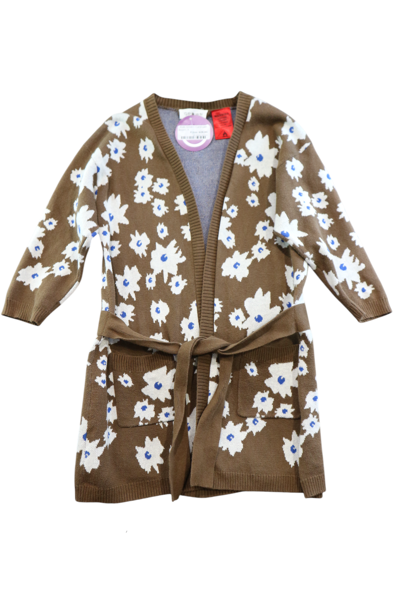 Grown longline tie front knit cardigan in brown with flower print, size 4. 100% organic cotton.