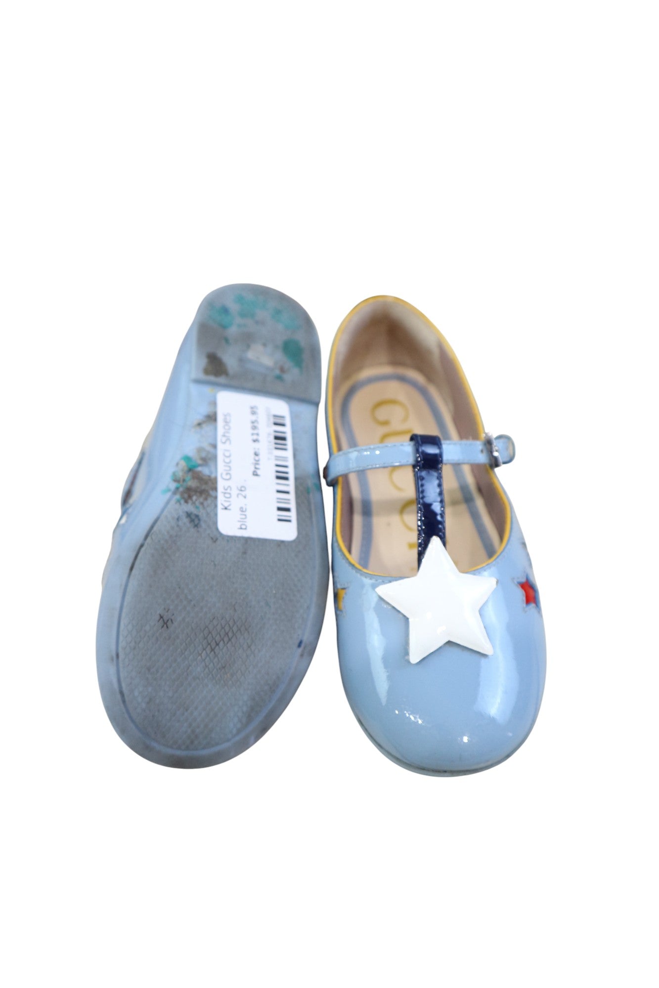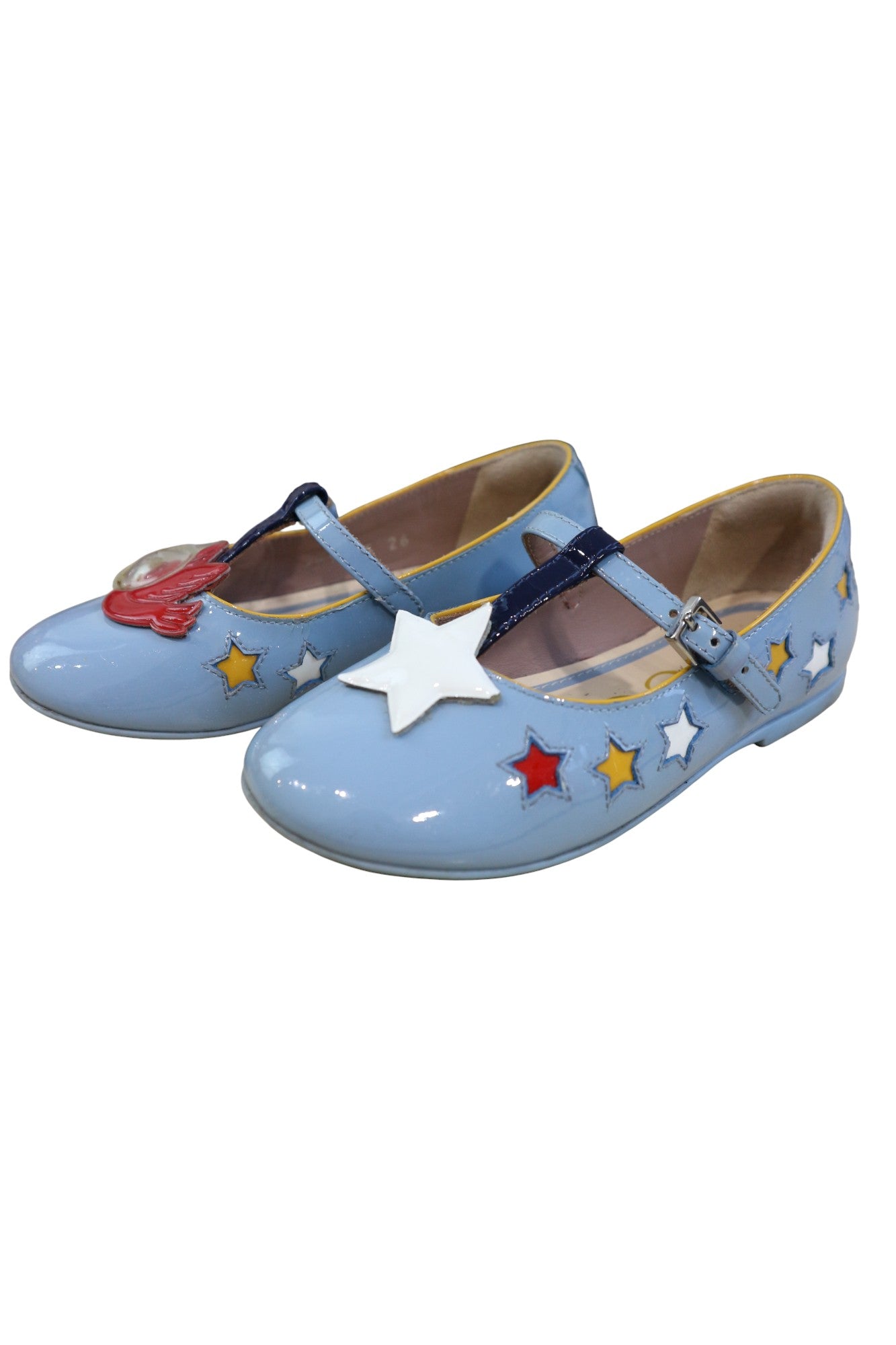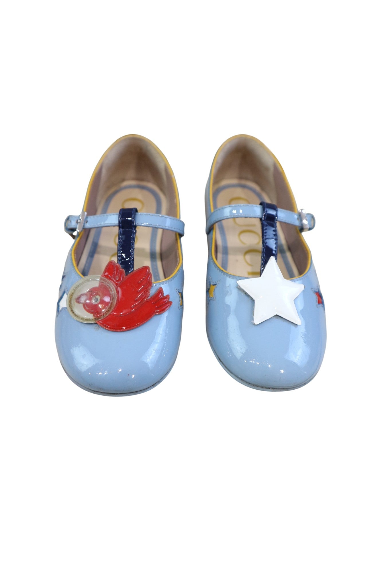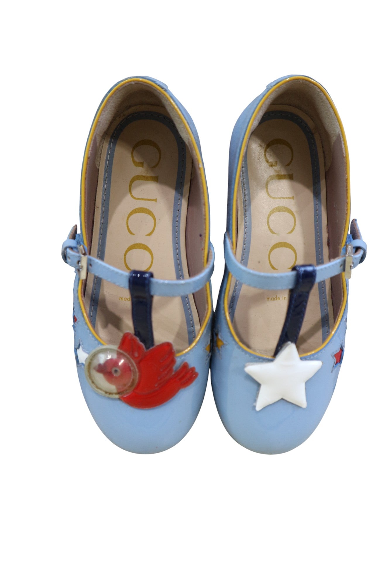 GUCCI blue patent leather t bars with bird and star features, size 26.