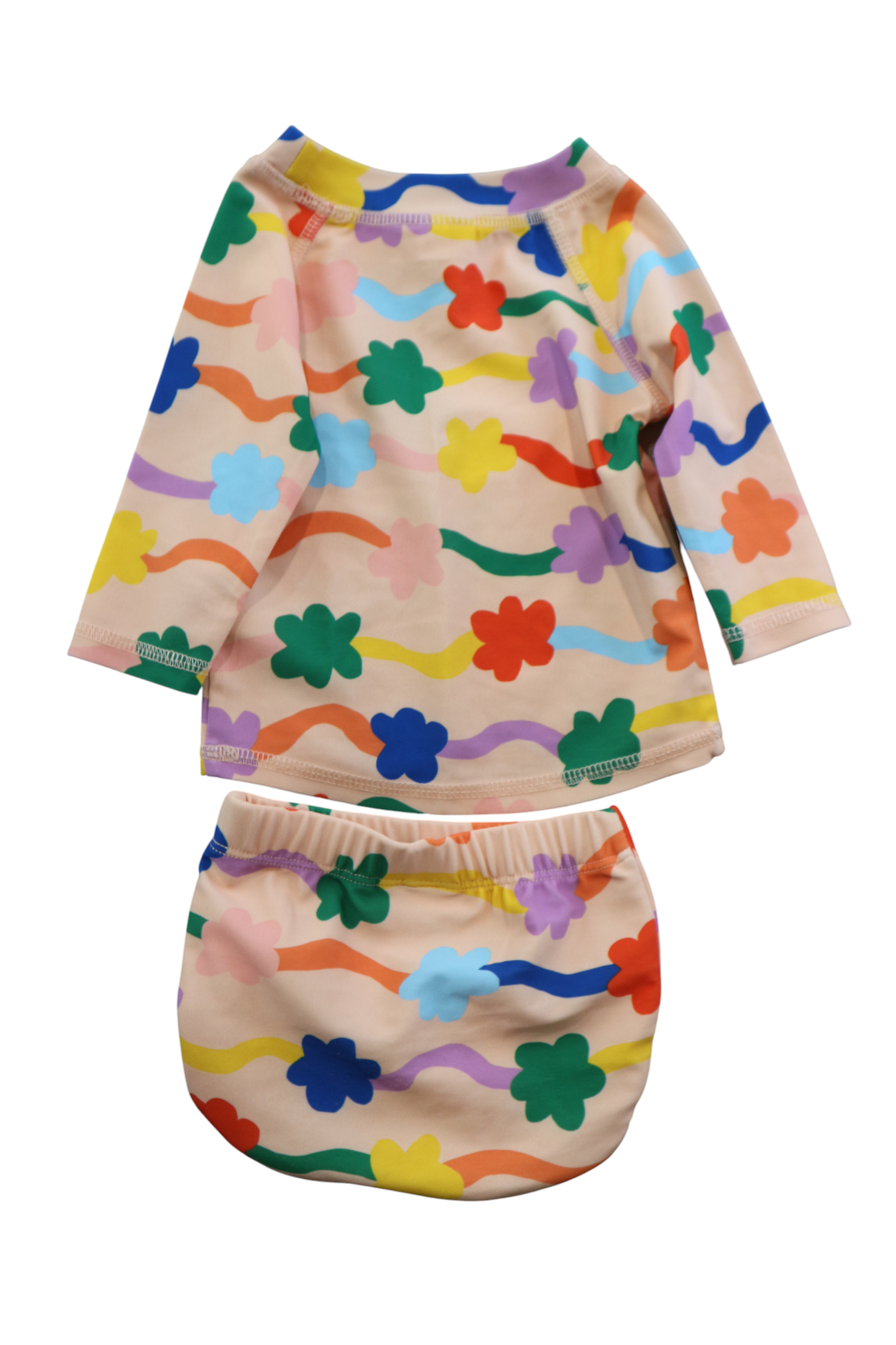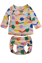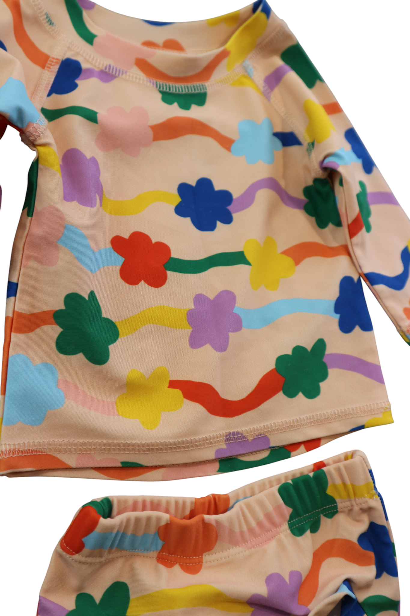 Halcyon Nights swim set - rashie and swim trunks - in peach with colourful print, size 000. Polyester/elastane.
