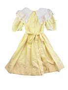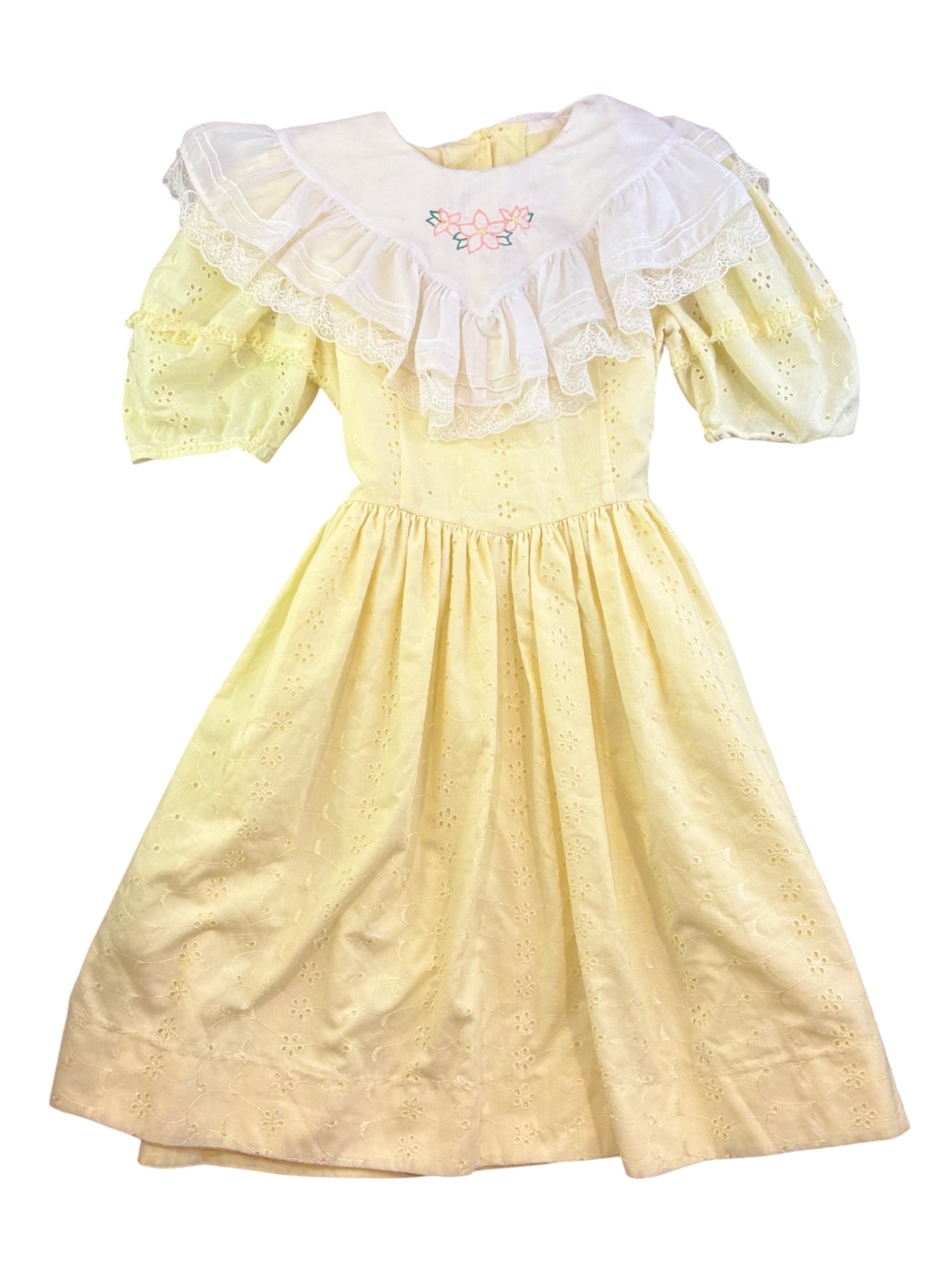 This delightful vintage dress brings timeless charm in sunny yellow broidery with embroidered flowers and a crisp white lace-trim collar. Puff sleeves and a tie-waist create a playful, classic look perfect for special moments.