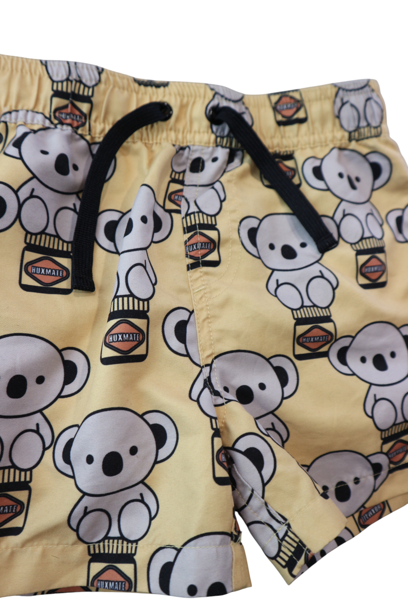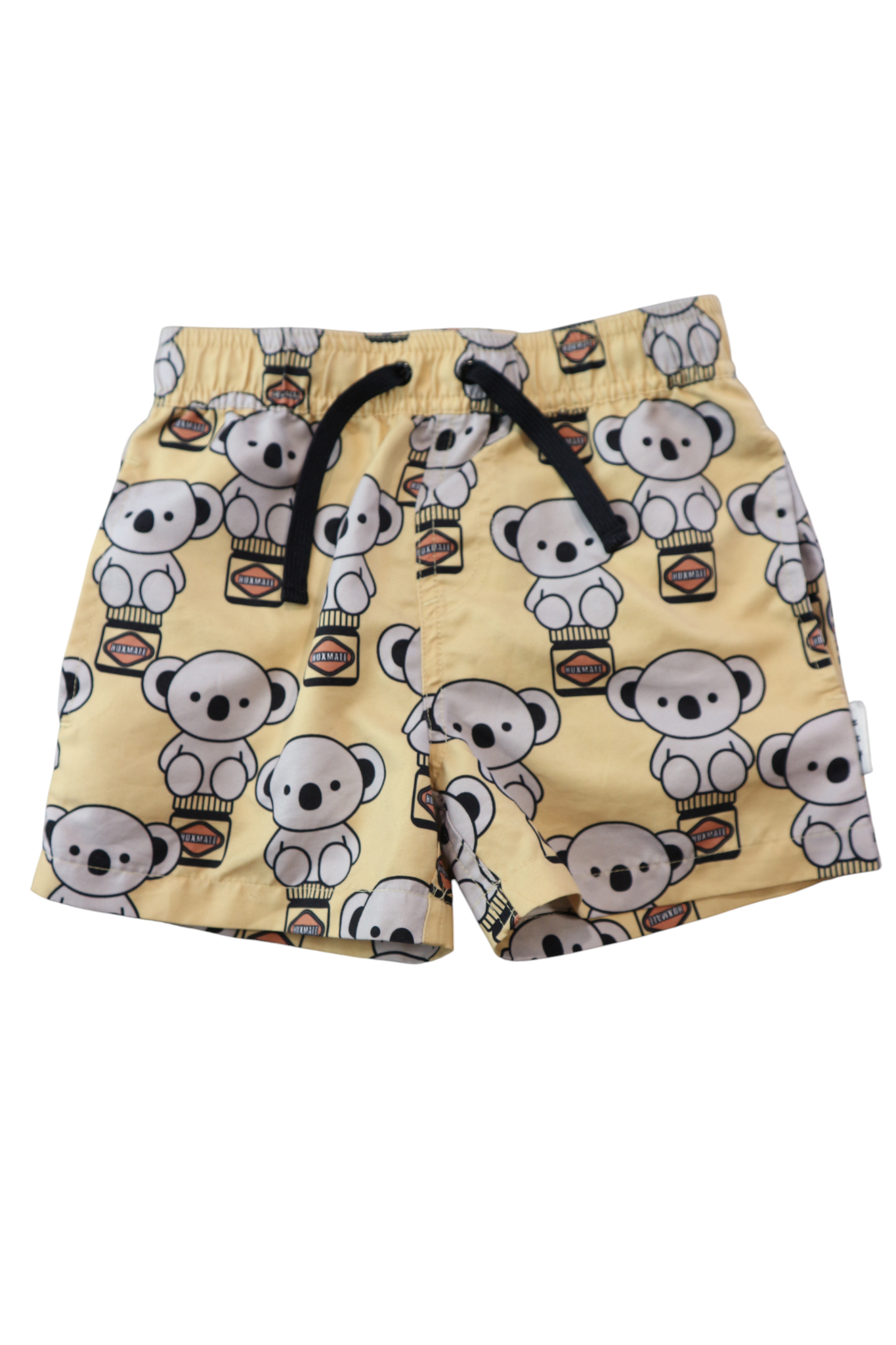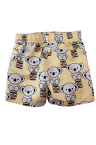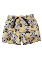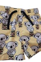 Hux boardshorts in yellow with koala 'huxmate' print, size 5. Recycled polyester.