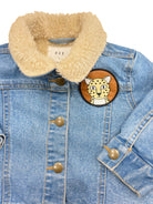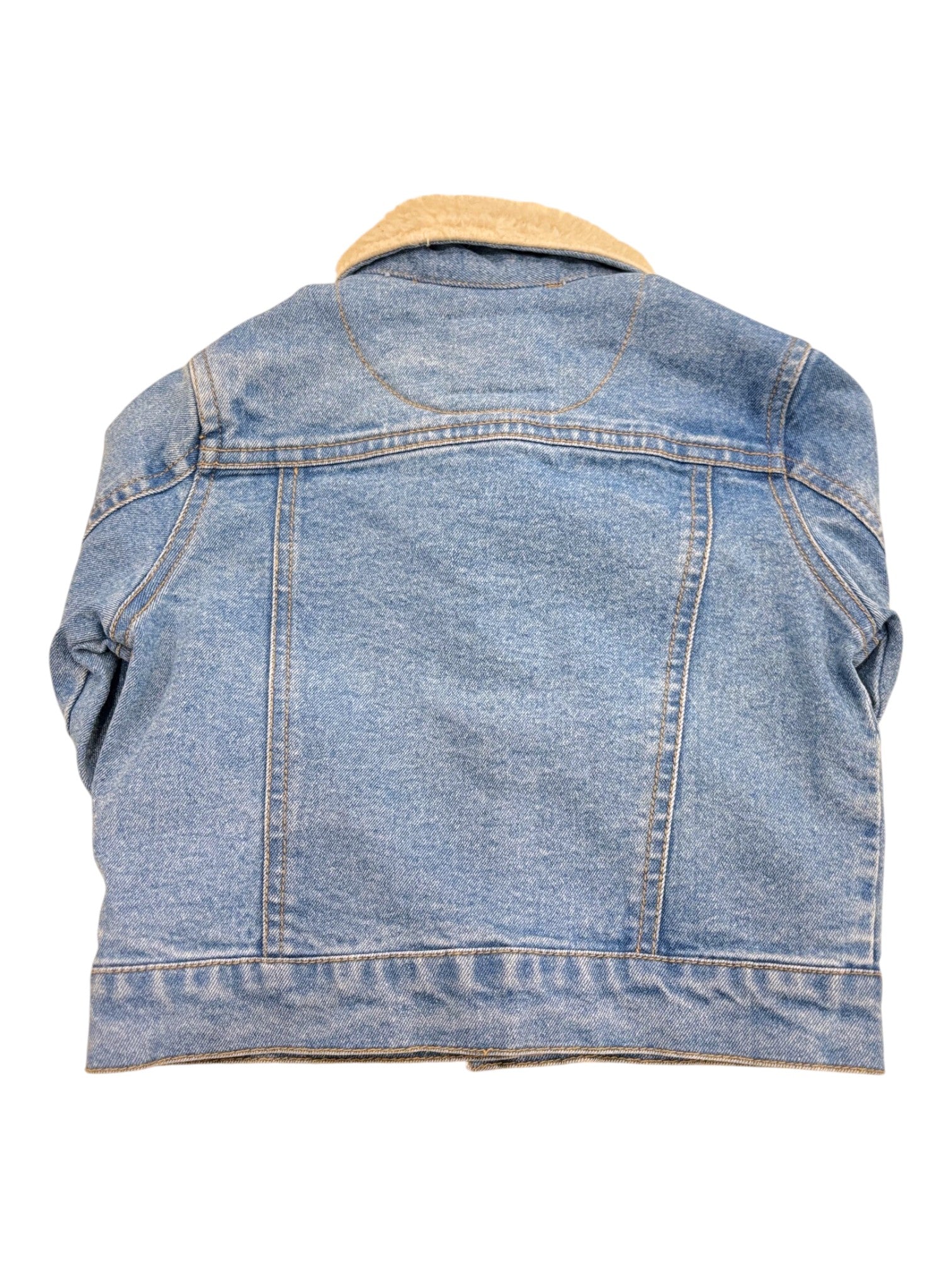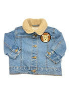 This denim jacket in size 1 features a cosy sherpa-look collar and a cool leopard emblem. Made from a soft cotton and elastane blend, it offers both comfort and playful style for your little one. Excellent condition.