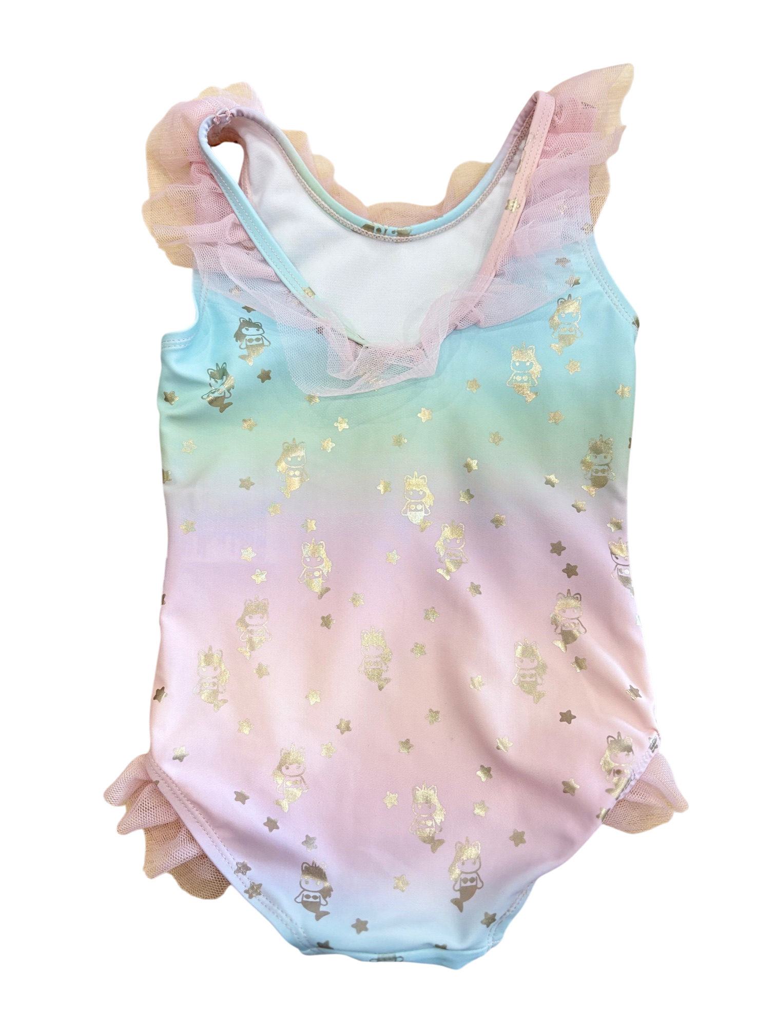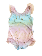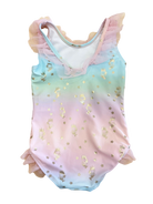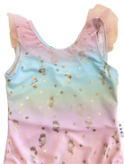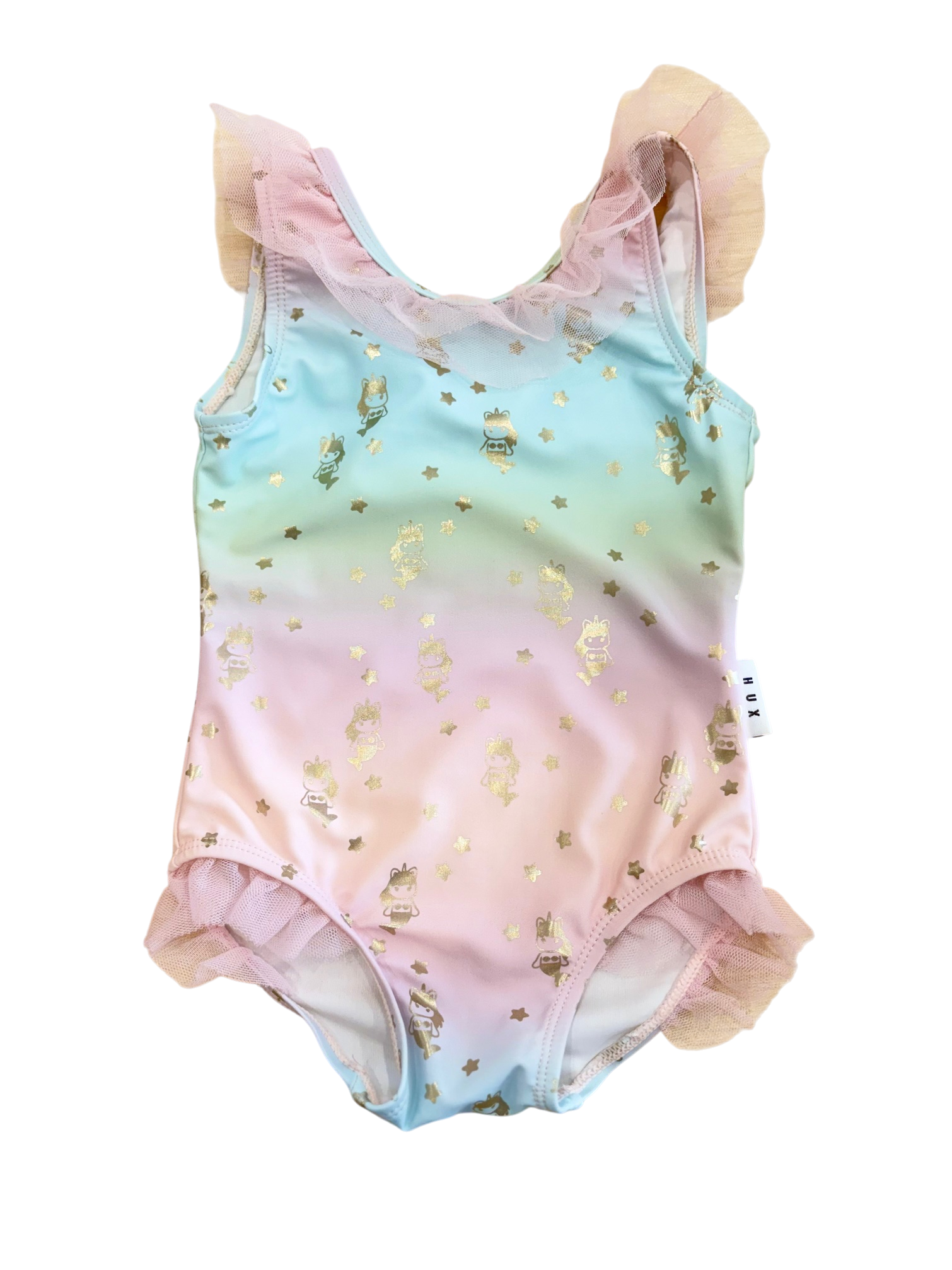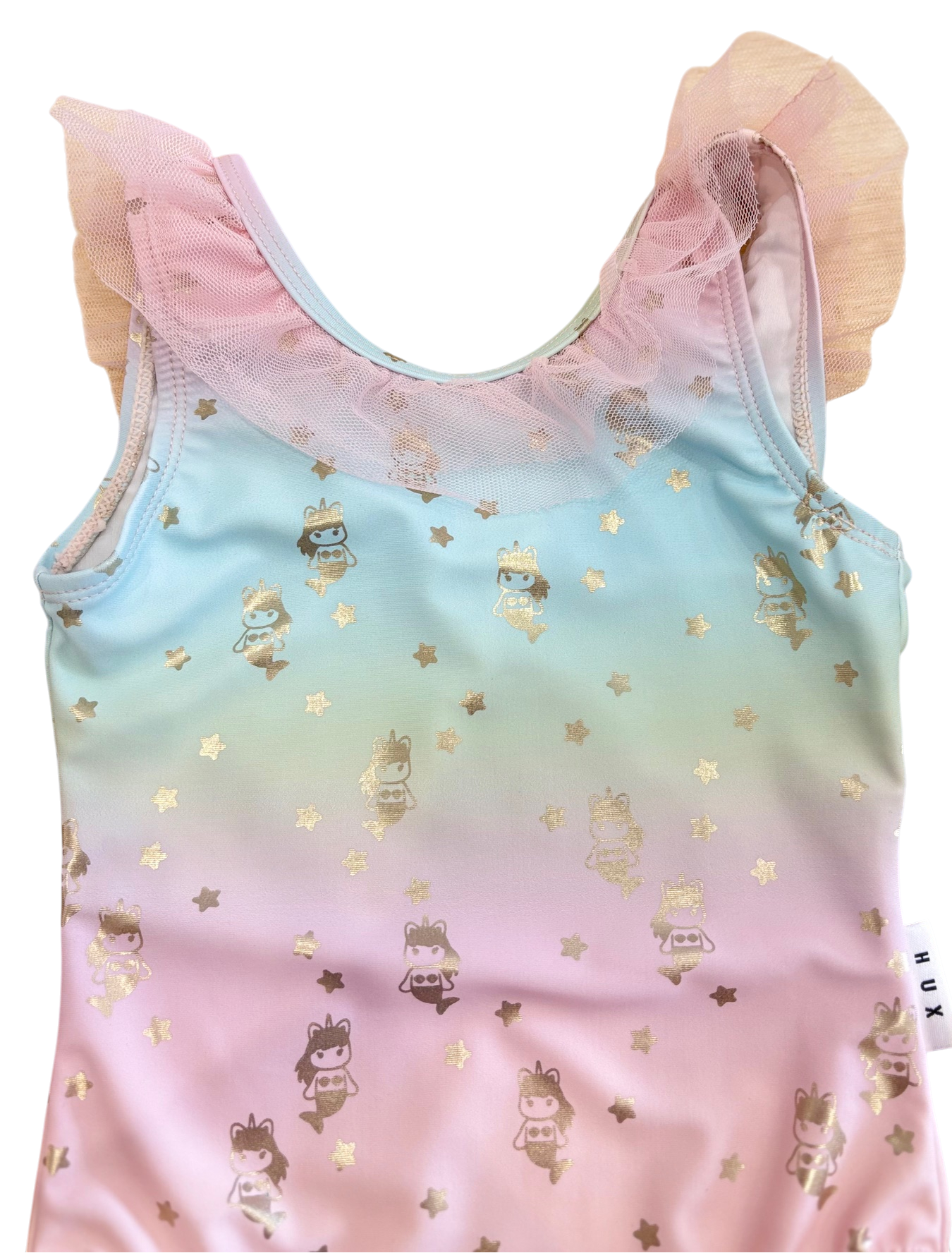 This Huxbaby one-piece ballet swimsuit combines vibrant rainbow tones with an elegant gold foil star mermaids. The tulle frills adorning the neckline add a playful finish. Perfect for young swimmers seeking both style and comfort.