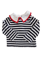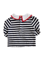 Classic navy and white striped baby top with a crisp white collar that's equal parts sweet and sophisticated. This timeless design works beautifully for everyday wear or special occasions, pairing easily with any bottoms in your little one's wardrobe. The soft, breathable fabric keeps babies comfortable all day long, while the charming collar detail adds a touch of preppy charm. Perfect for creating those picture-perfect moments or simply dressing your bub in style. Very good preloved condition.