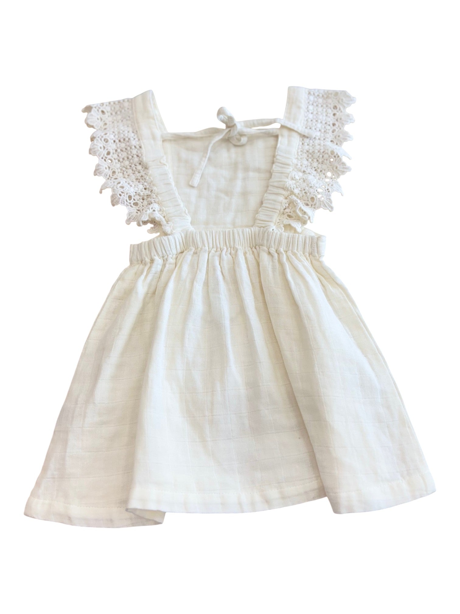 Breezy organic cotton pinafore with a charming cream ruffle and stretchy waistband that moves with your little one. Perfect for layering over tees all summer long!