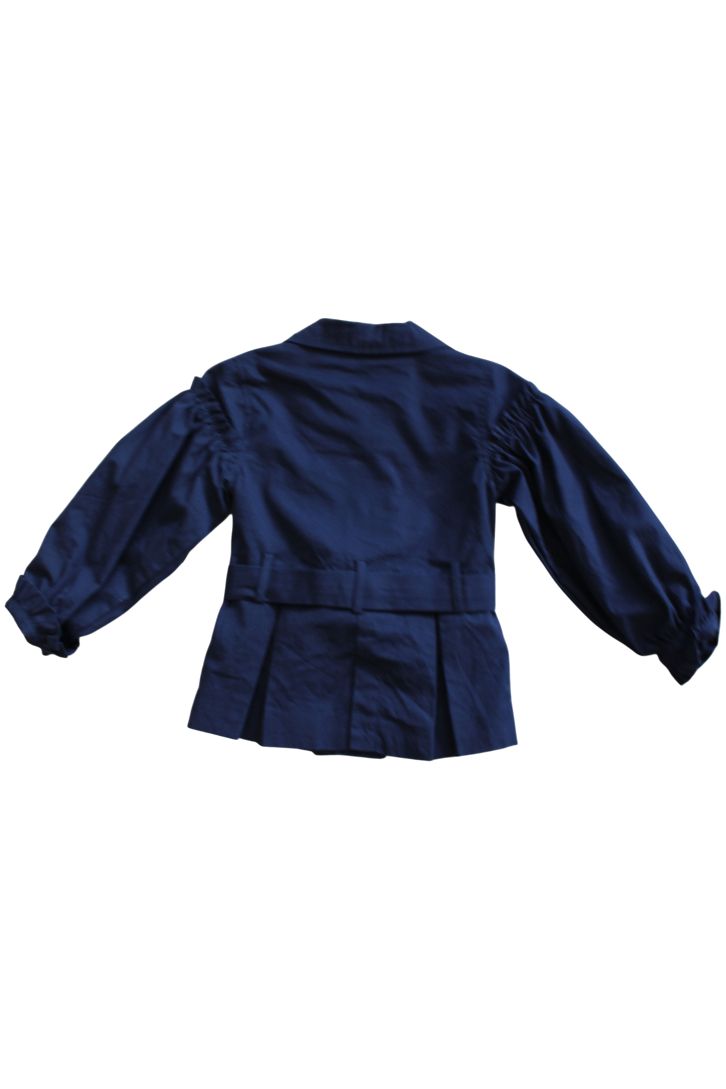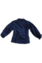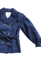 A double-breasted tailored jacket is the perfect transitional layering jacket. with 6 working button closures, and intricate box pleat designed pockets, gathered shoulder and sleeve frills. With a waist tie and collar. Fully lined.