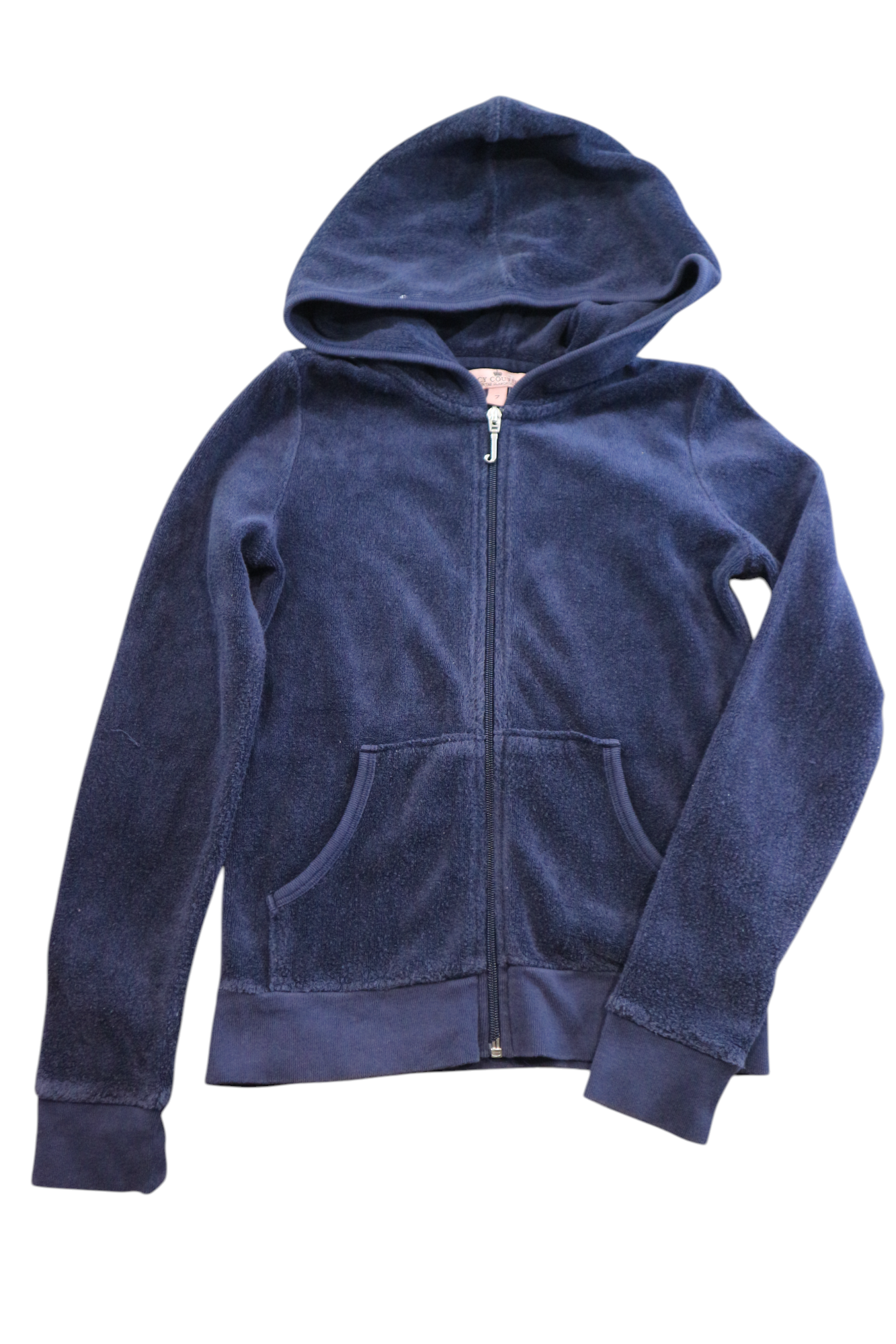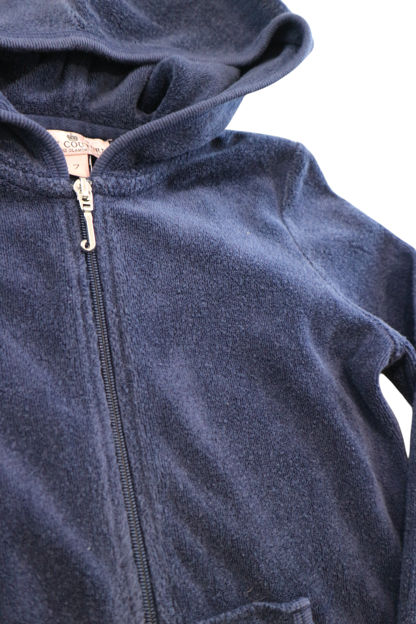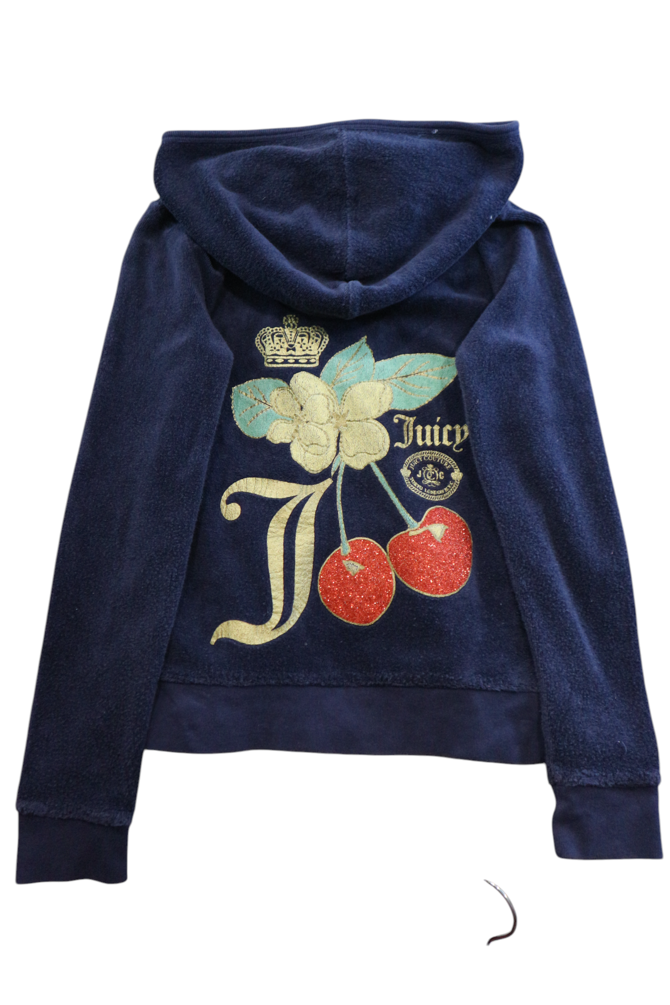 Juicy Couture terry zip hoodie in navy with cherry print at back, size 7. Cotton/polyester.