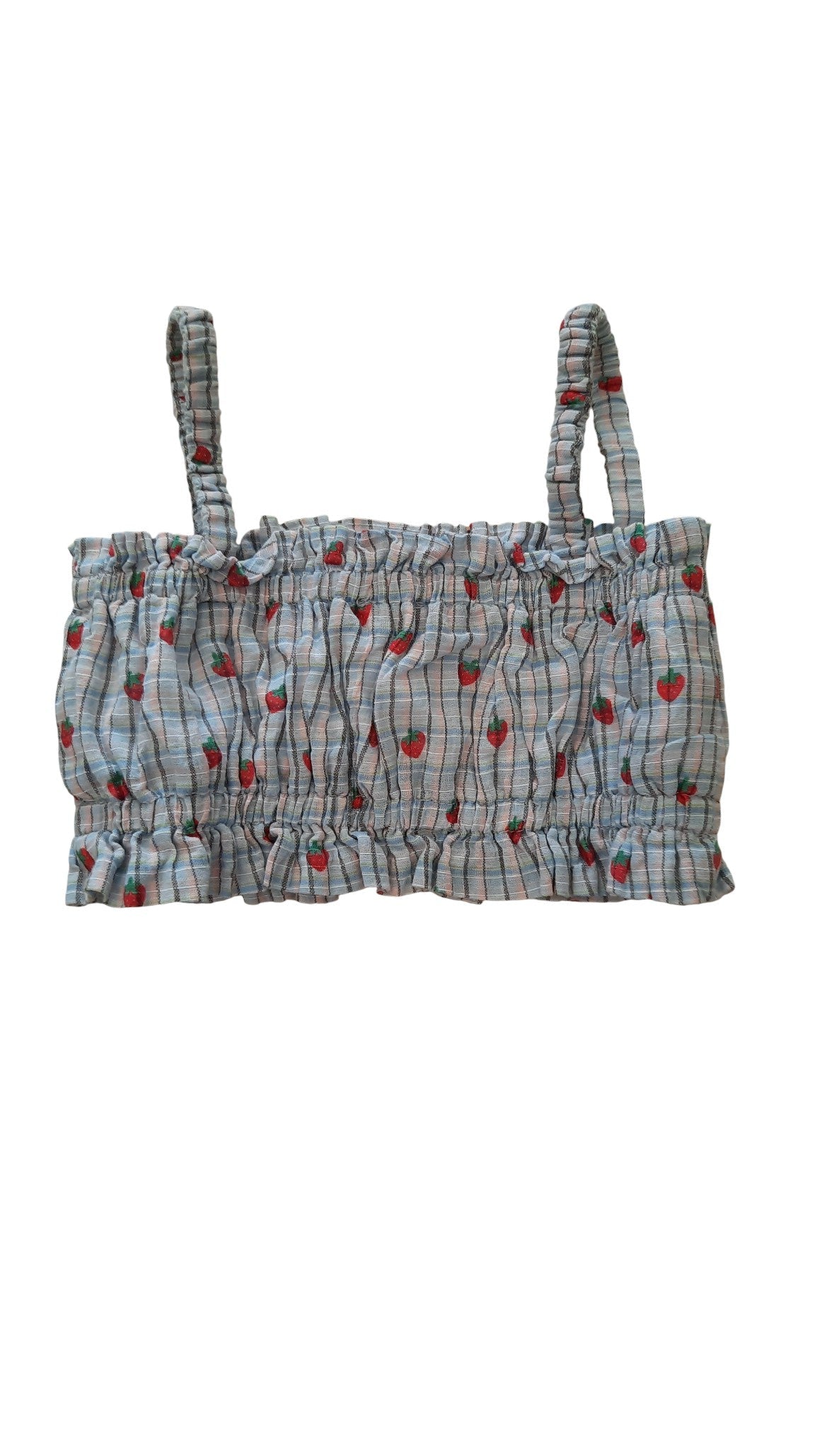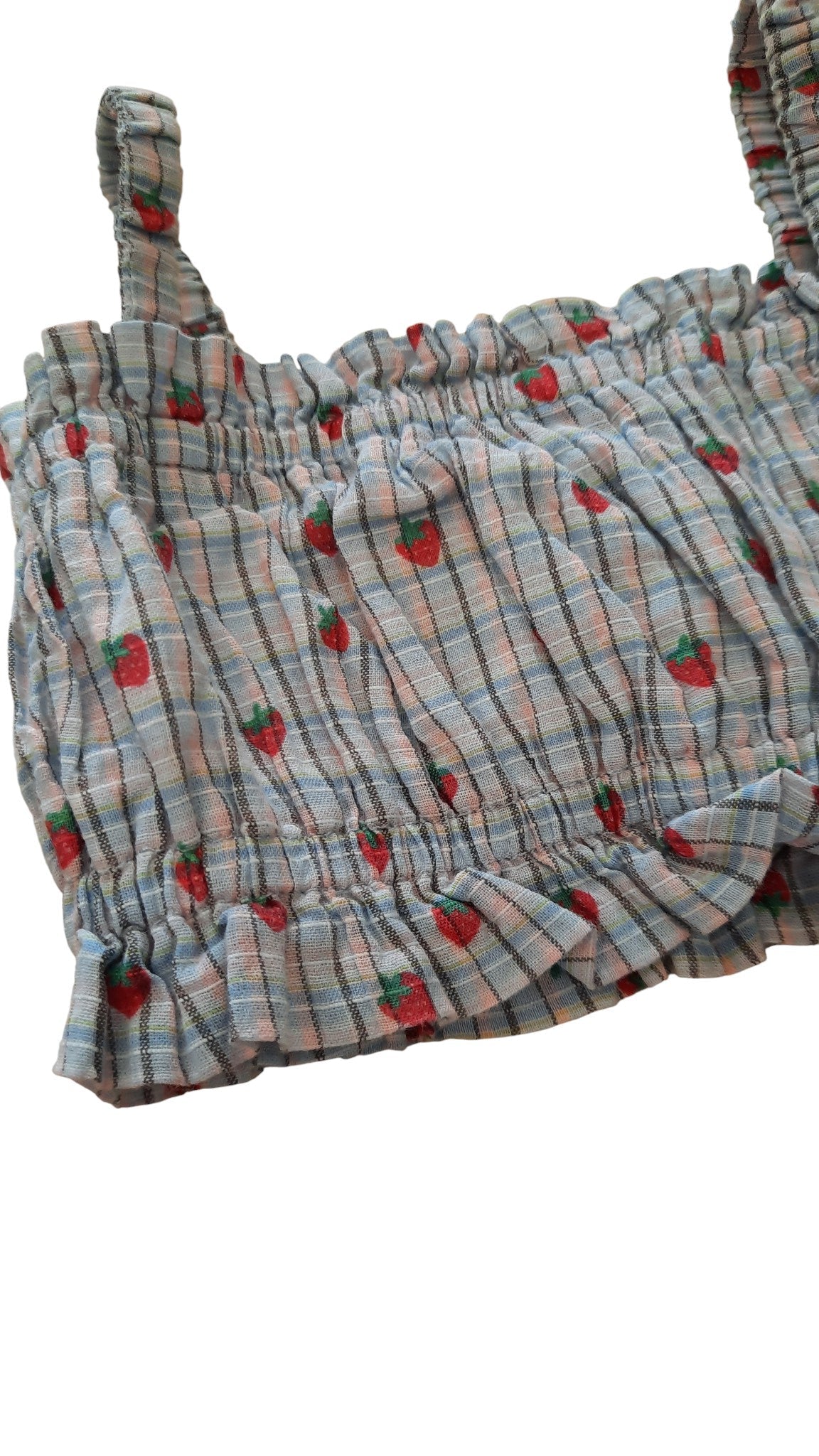 Juni Jnr gingham shirred crop top with all-over strawberry print, in size 1. 100% cotton.