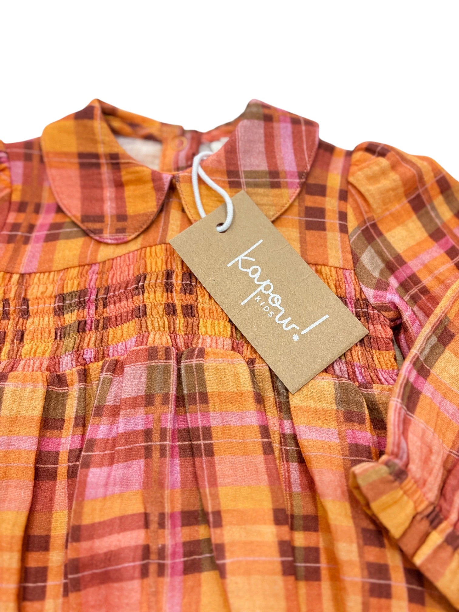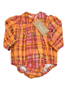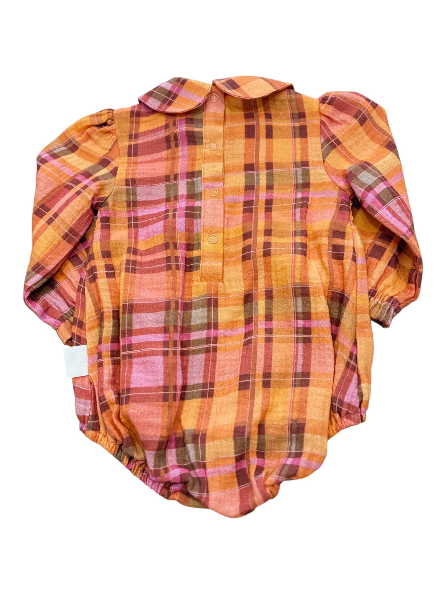 Vintage charm meets modern comfort! Orange plaid collared playsuit with long sleeves and a shirred bodice. Crafted from 100% cotton for softness and breathability.
