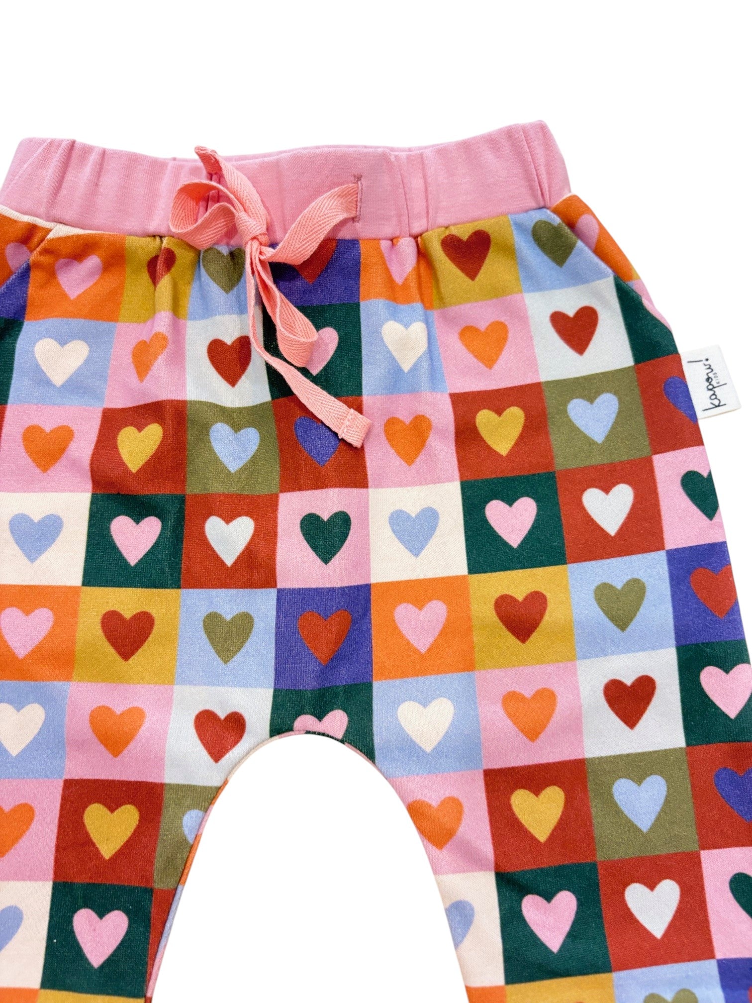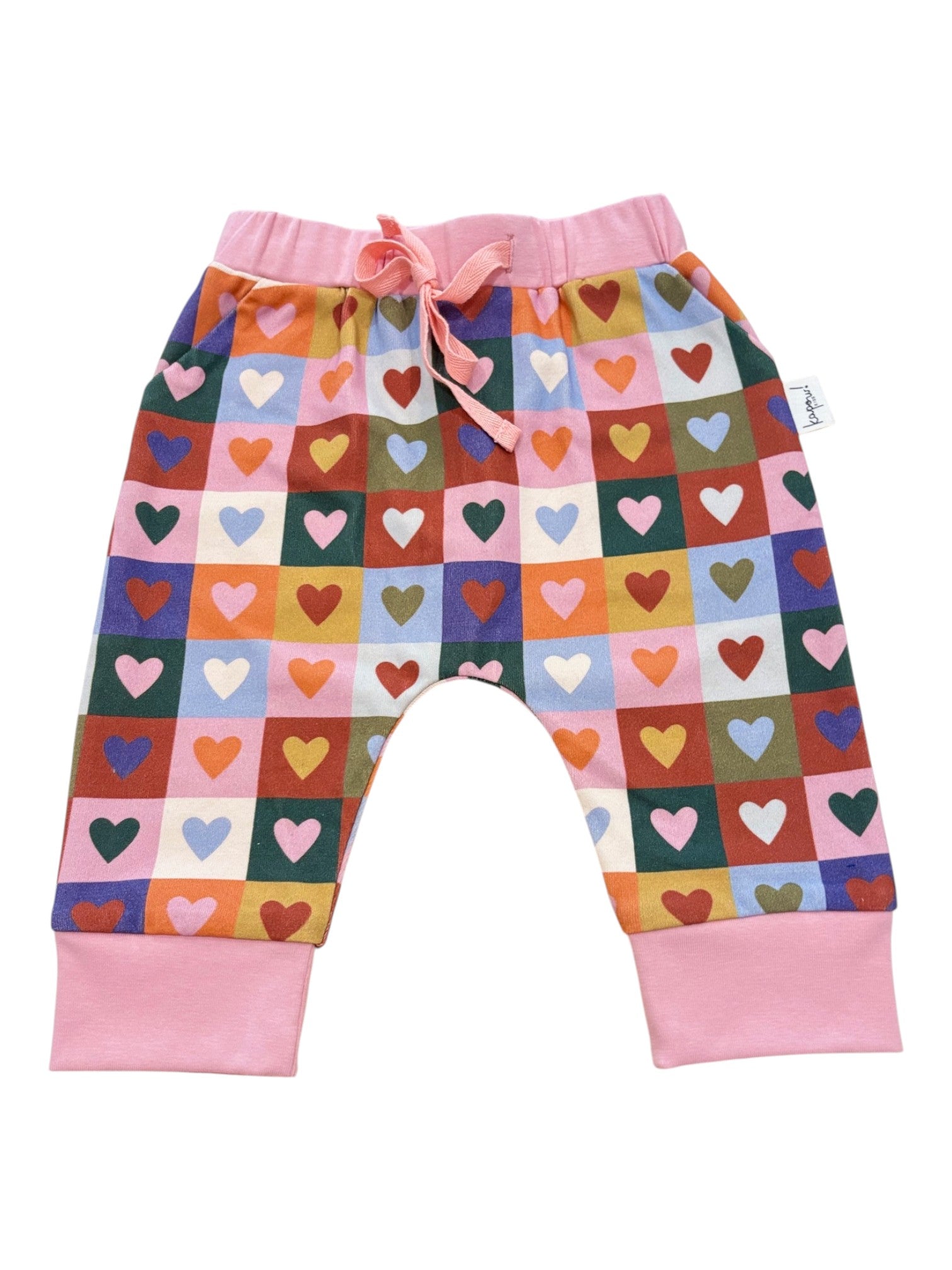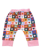Cosy pink tracksuit pants with a funky multicoloured heart print! Relaxed fit and elastic drawstring waist offer comfort and easy adjustability. Soft cotton and spandex blend keeps little ones snug. Size 0 comfort that's perfect for playtime and cuddles!