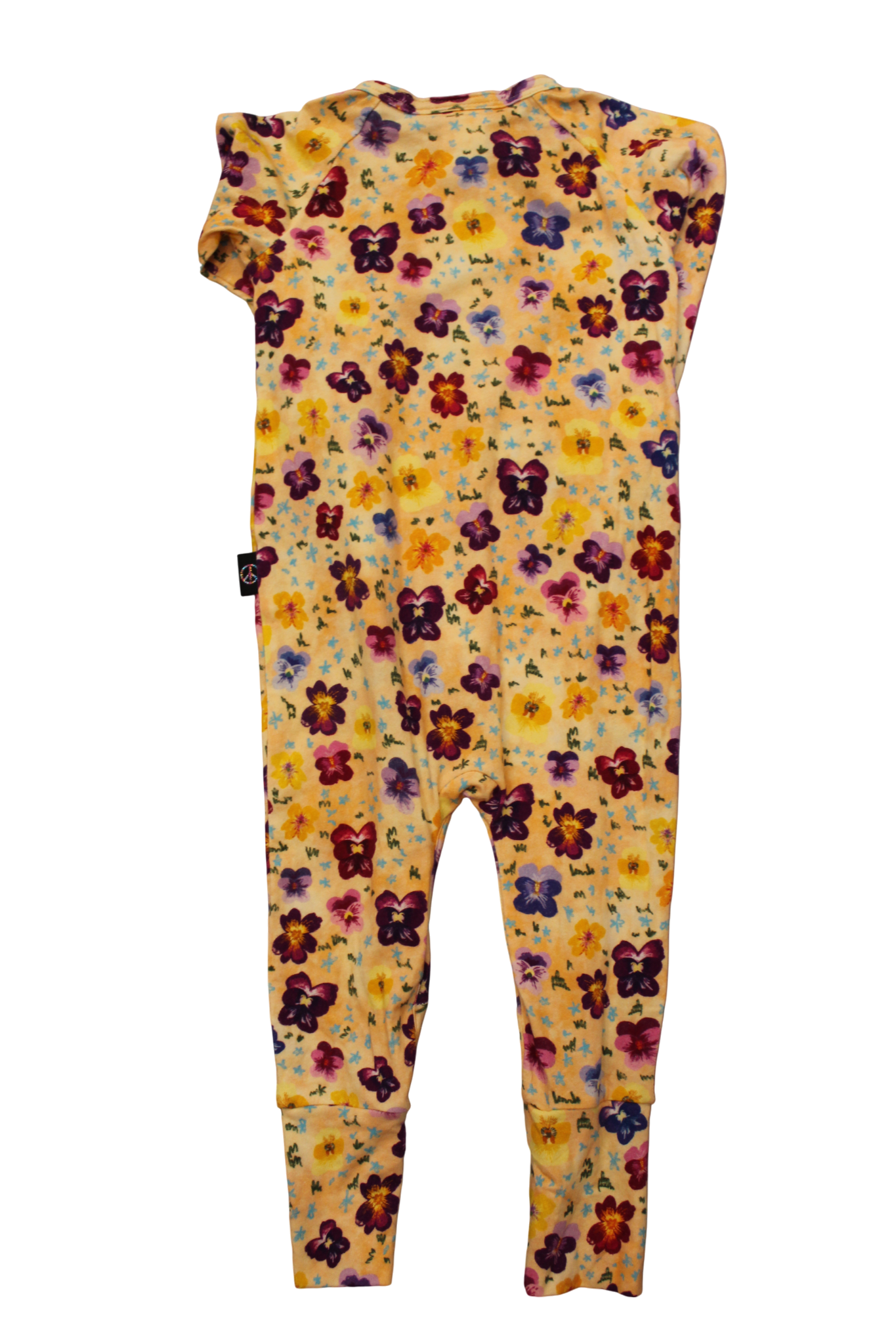 Adorable pansy print jumpsuit crafted from soft organic cotton blended with stretchy spandex for the perfect toddler fit. This one-piece wonder combines comfort with charm, featuring a cheerful floral design that's as sweet as your little one. The breathable fabric keeps them cool and cosy, while the stretch ensures easy movement for crawling, playing, and exploring. Perfect for everyday wear or special occasions!