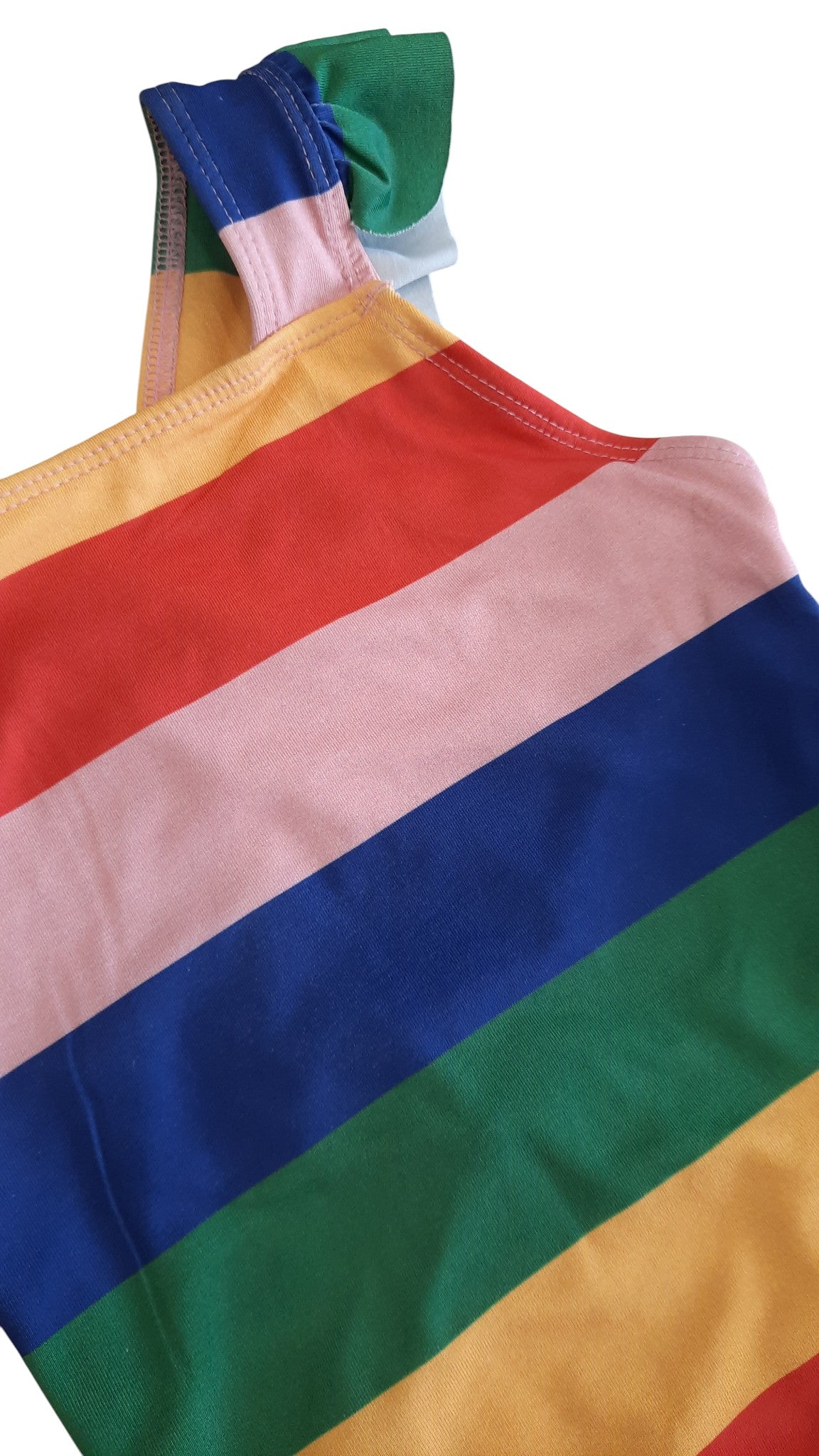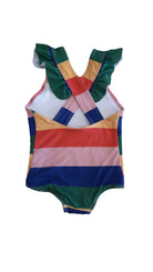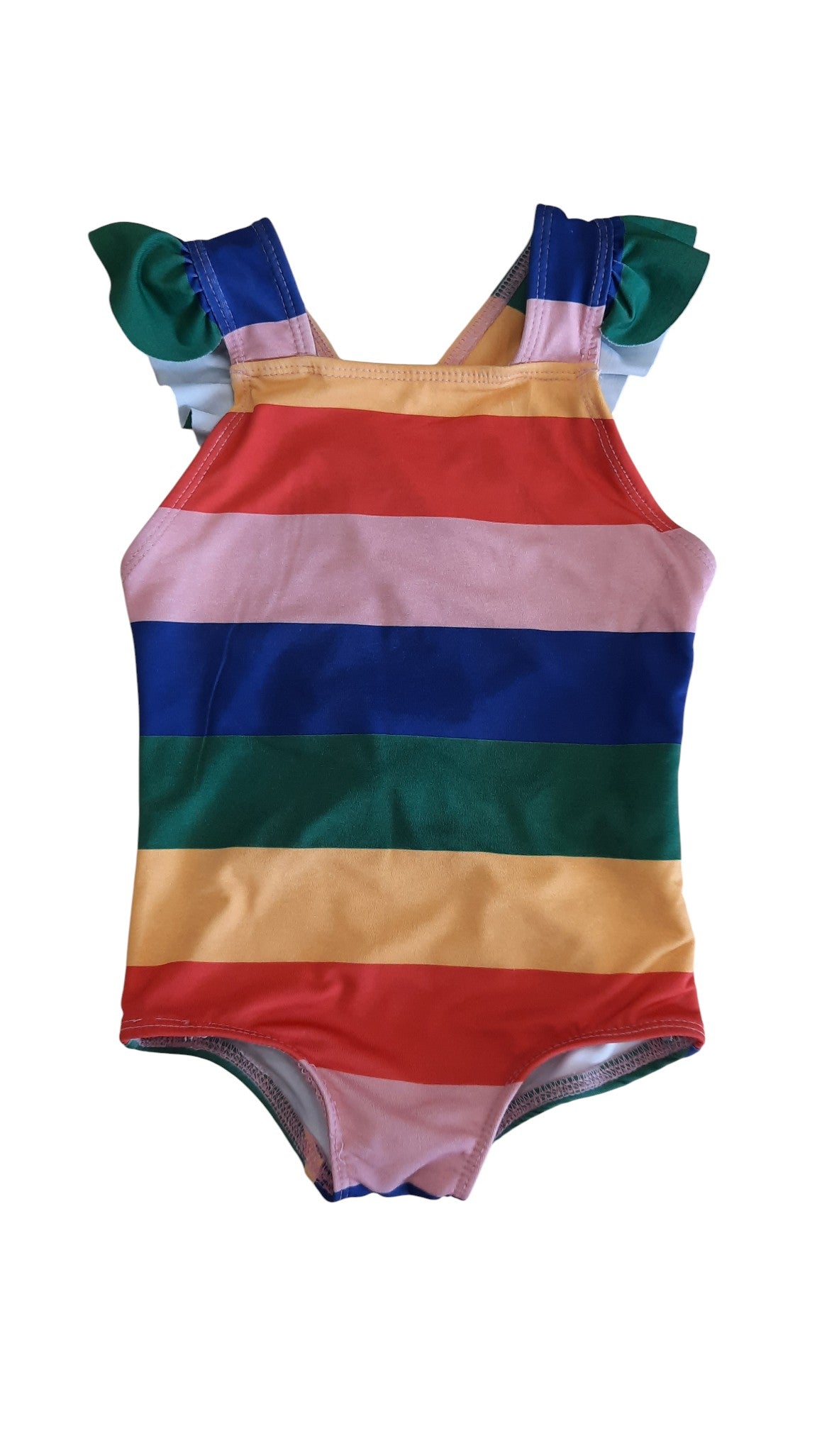 Kip & Co cross-back swimsuit in colourful stripes, size 2. Polyester/spandex.