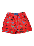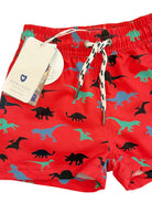 Bright red Korango Boardshorts with a fun dino print, perfect for toddlers. Features a drawstring waist and mesh lining for comfort and easy movement. Made from stretchy polyester and elastane. Size 1- Brand new with tags.