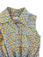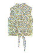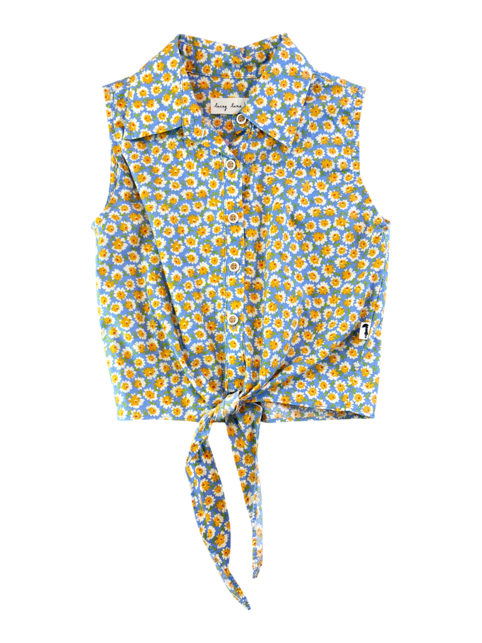 This Lacey Lane sleeveless button-up shirt features a dainty blue and yellow floral print and an adorable tie detail at the hem. Made from 100% cotton, this cute top is lightweight and perfect for summer.