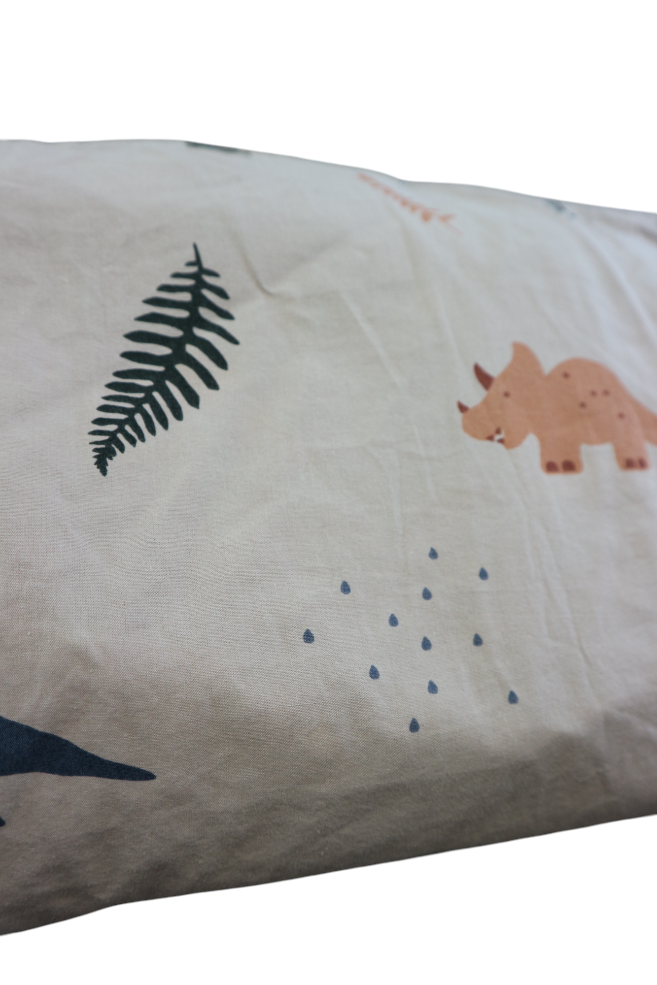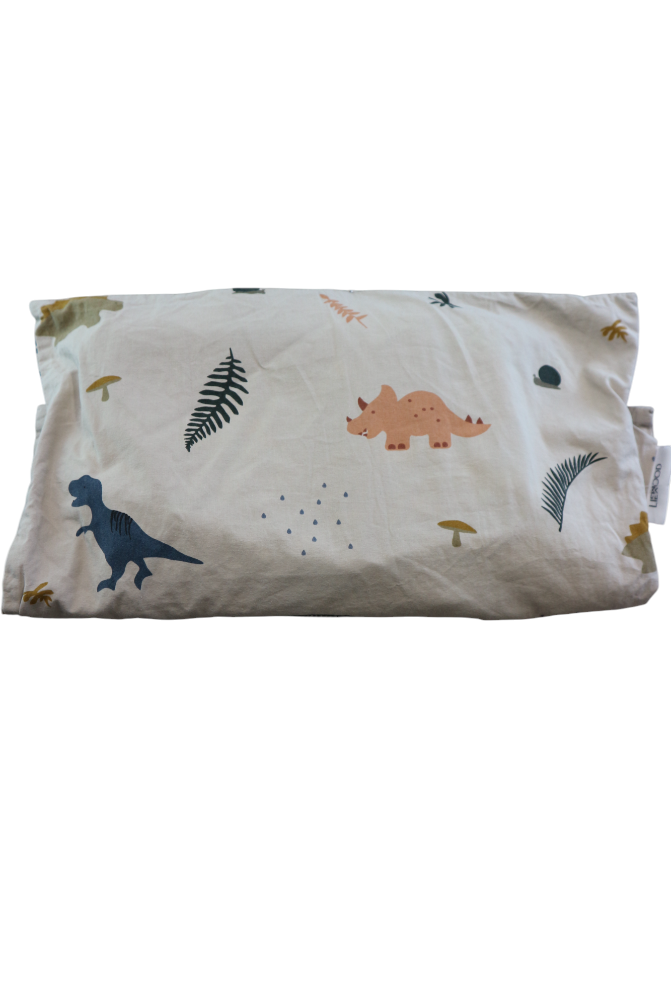 Liewood taupe with dino print doona cover in cot size with matching cushion cover.