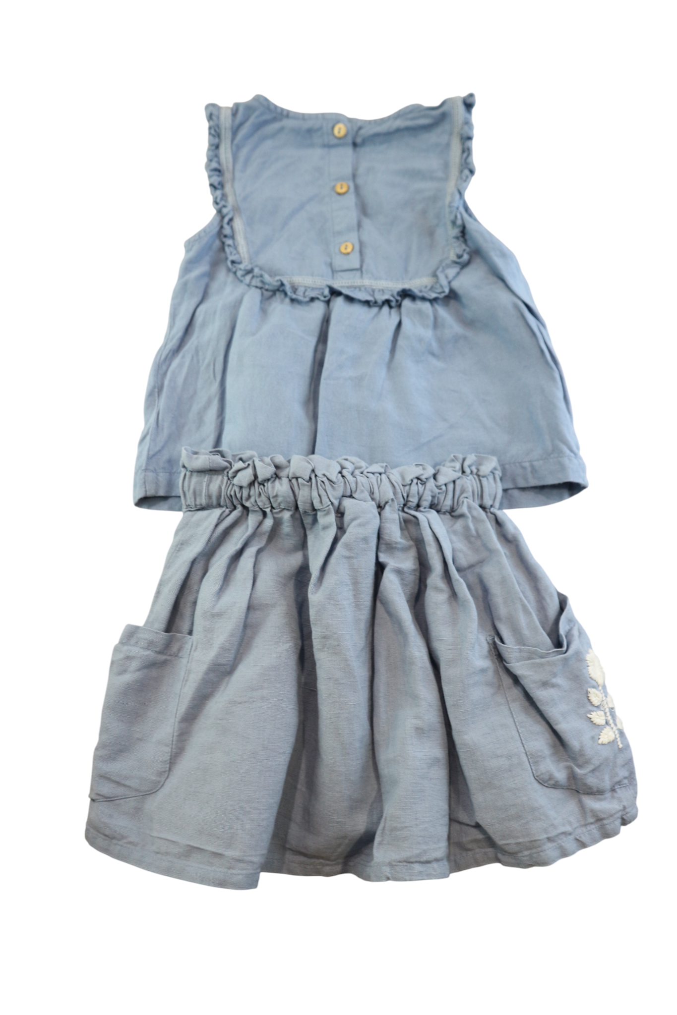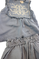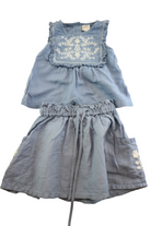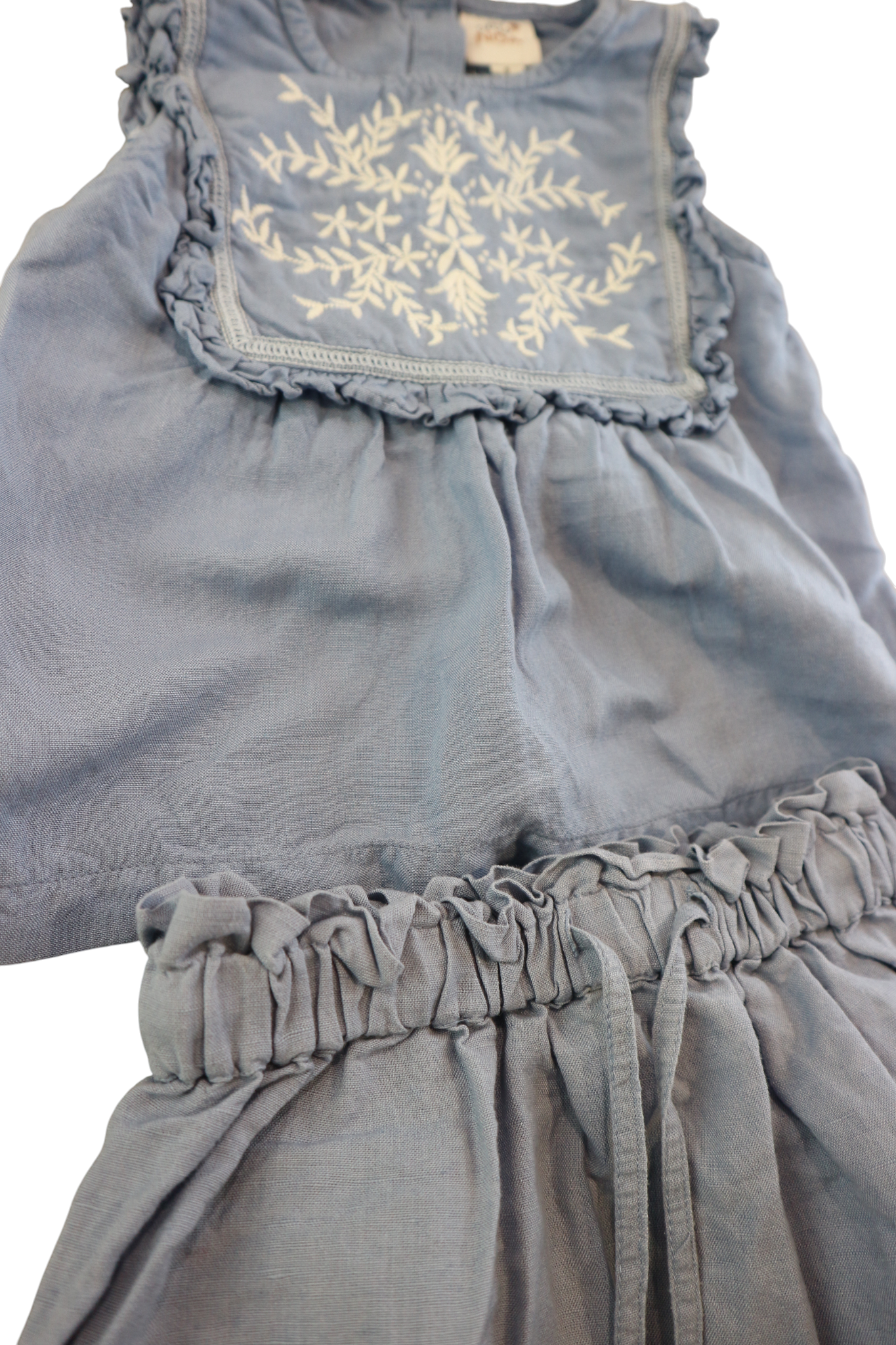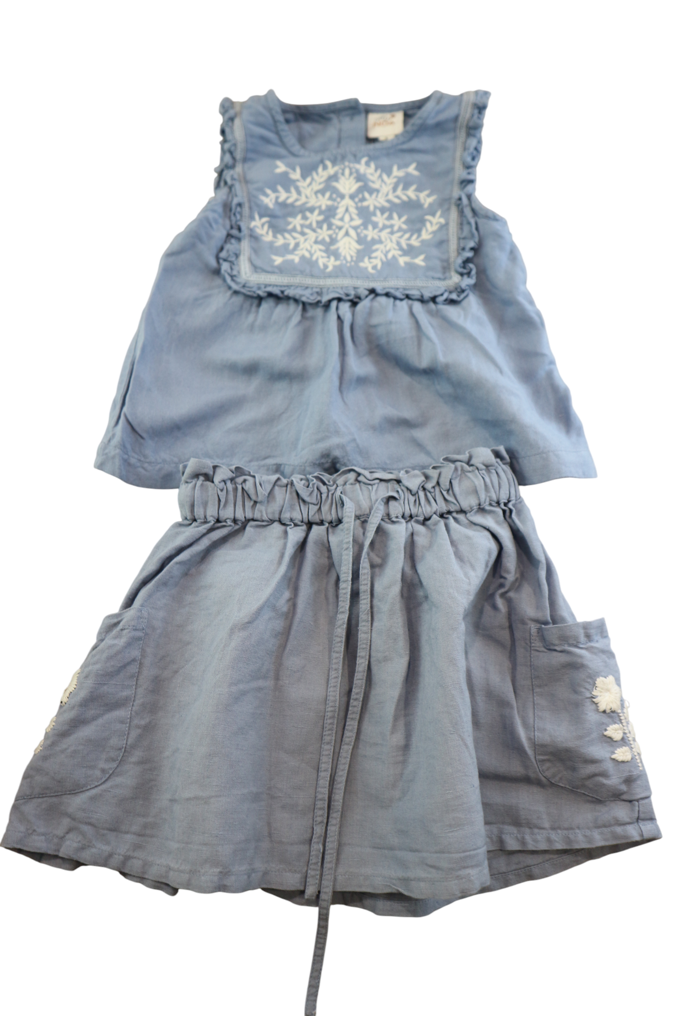 Little Noa top and skirt set in blue with white embroidery feature, size 6. Viscose/linen.