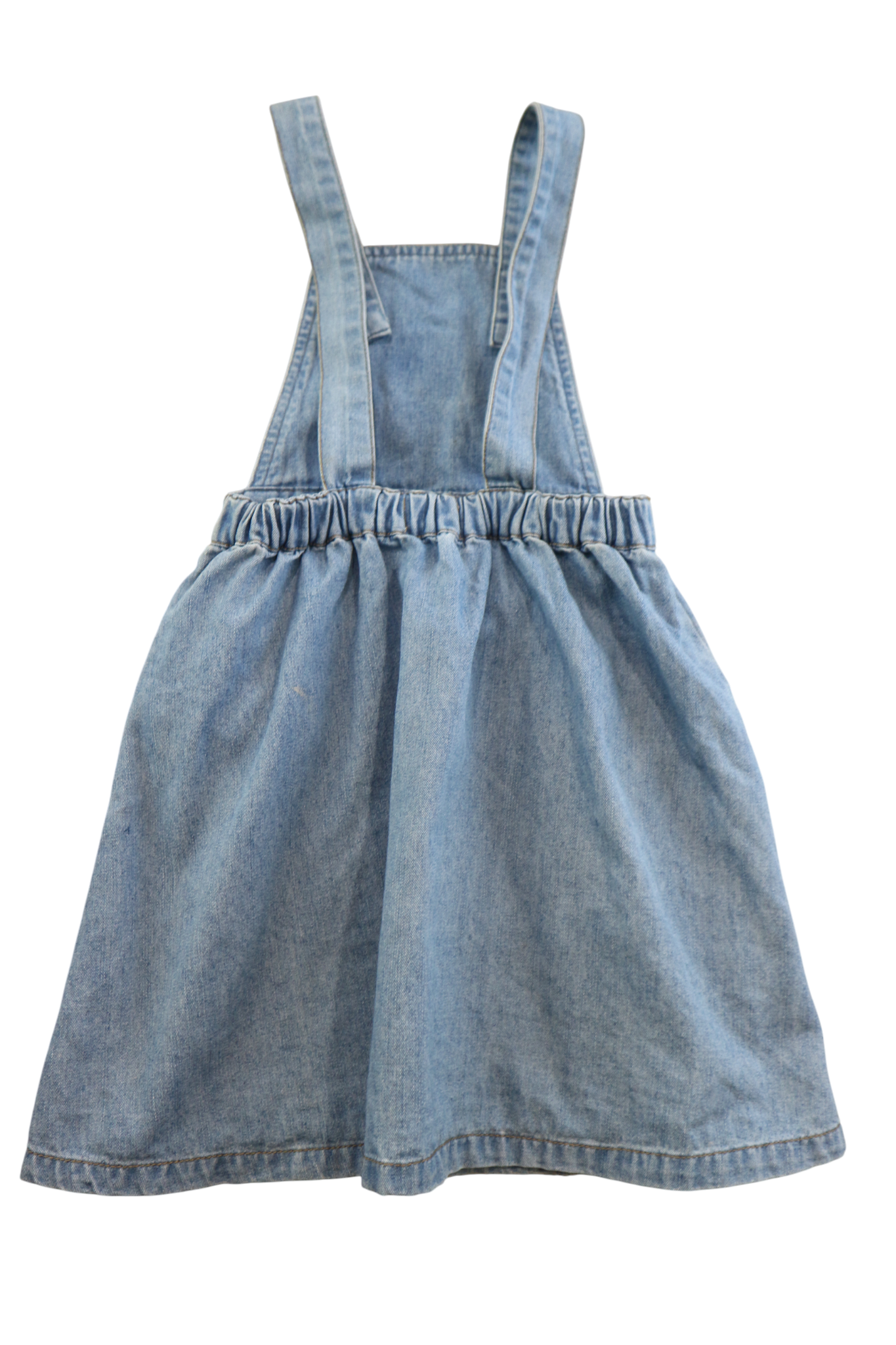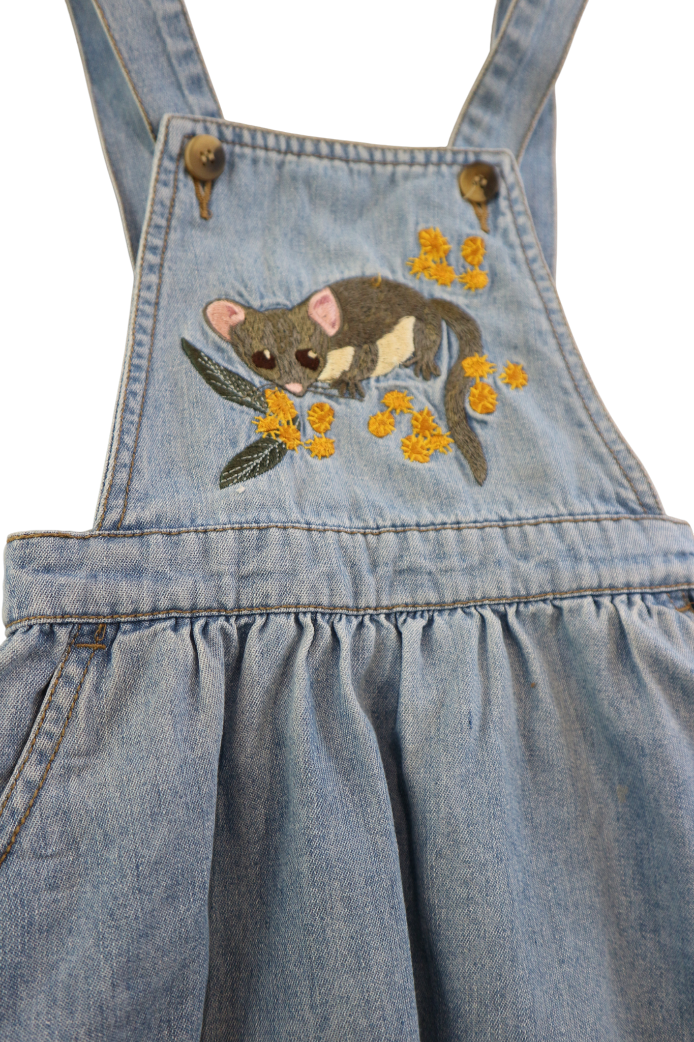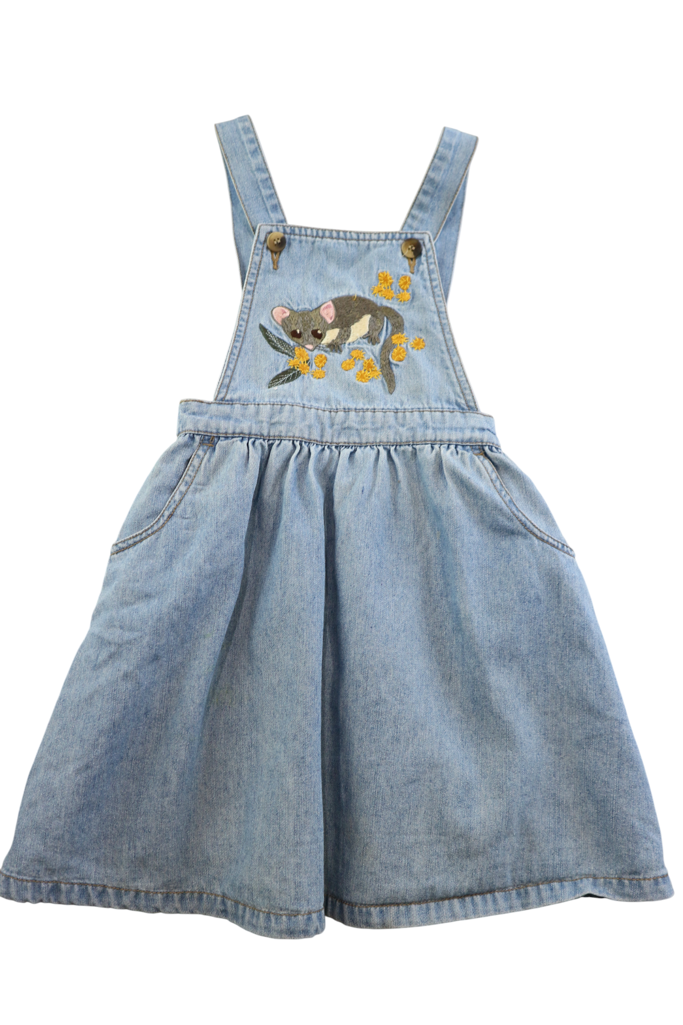 Little Princess Highway pinafore in blue denim with embroidered possum print, size 3. 100% cotton.