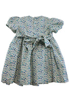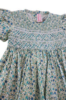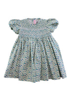 Meleze blue floral tie back dress with smocking, size 12m (0). 100% woven cotton.