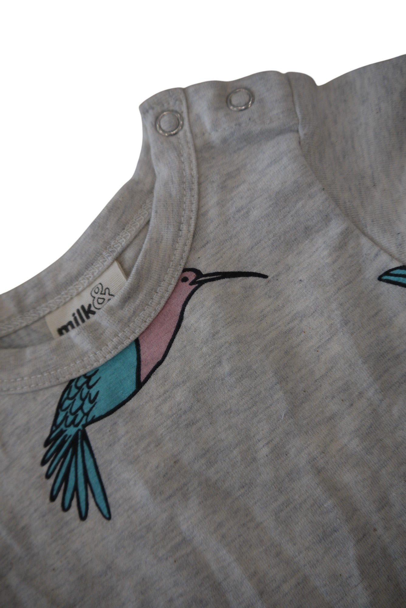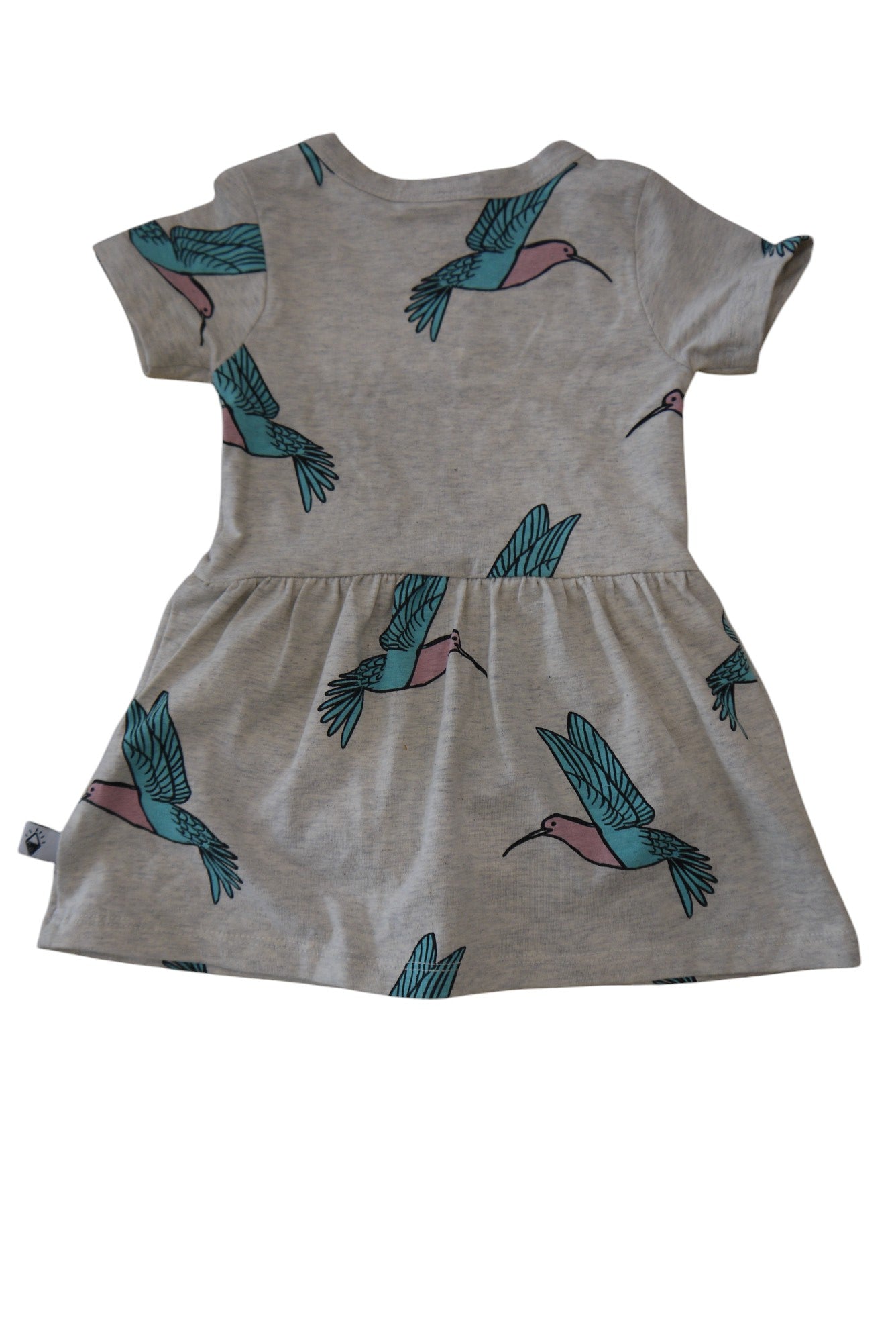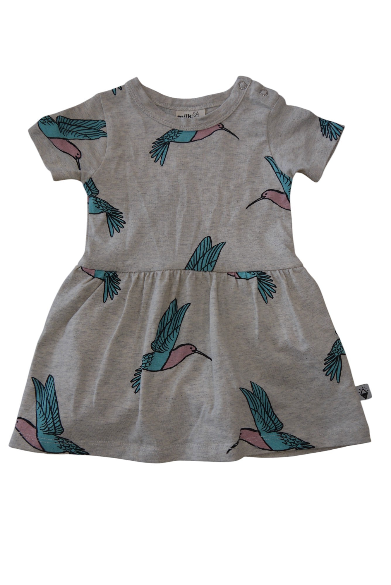 Step into the wild side with the Milky & Masuki Dress! Made with a soft cotton/elastane blend, this baby dress features a playful bird print on a hersey and grey fabric. Perfect for the little fashionista in your life! Very good condition.