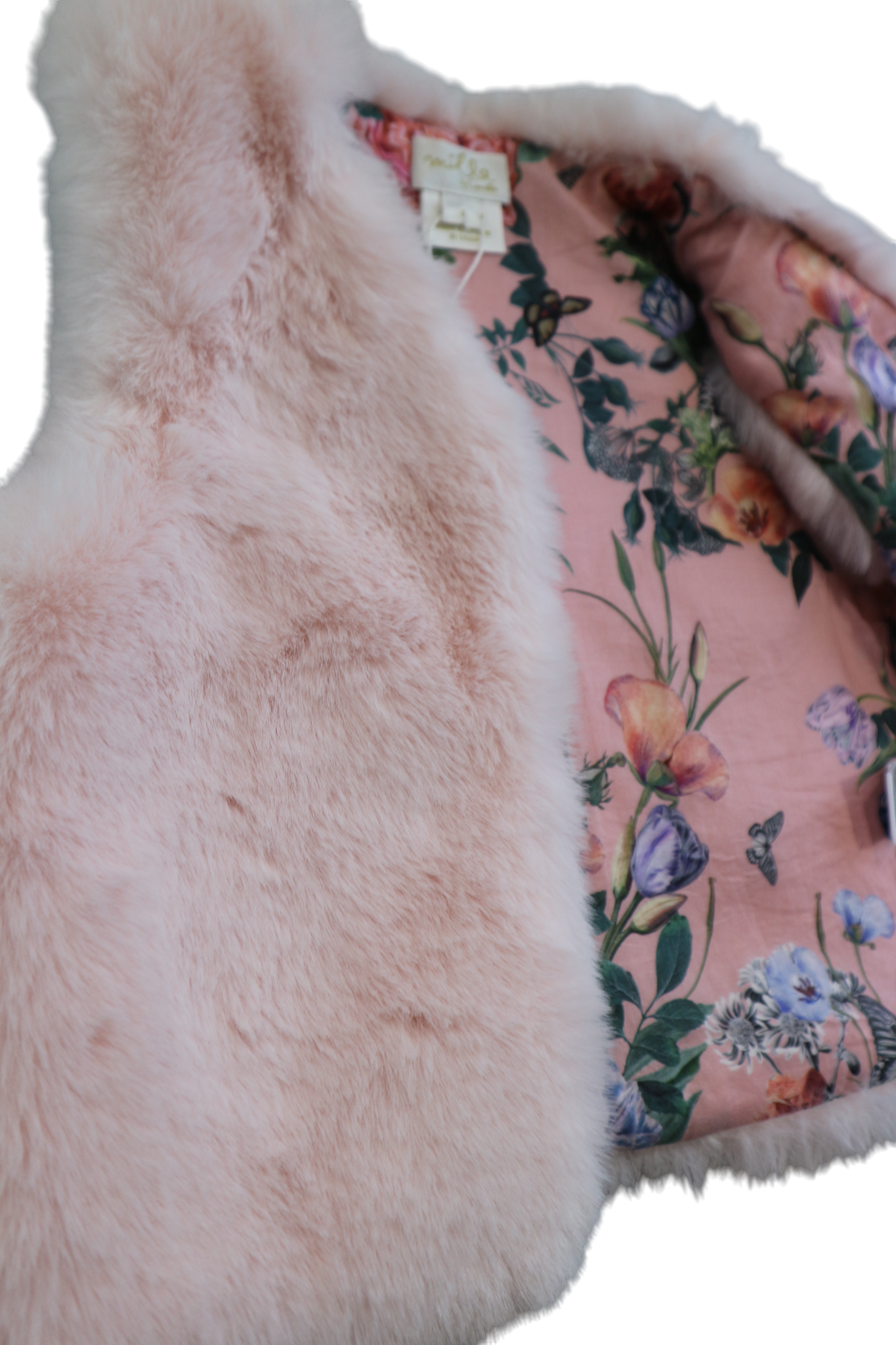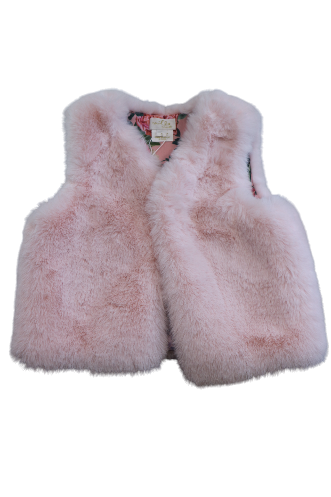 Milla by Camilla faux fur pink vest with pink floral lining, size 4. Polyester with cotton lining.