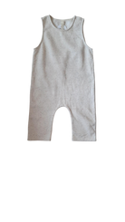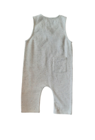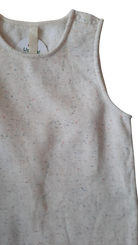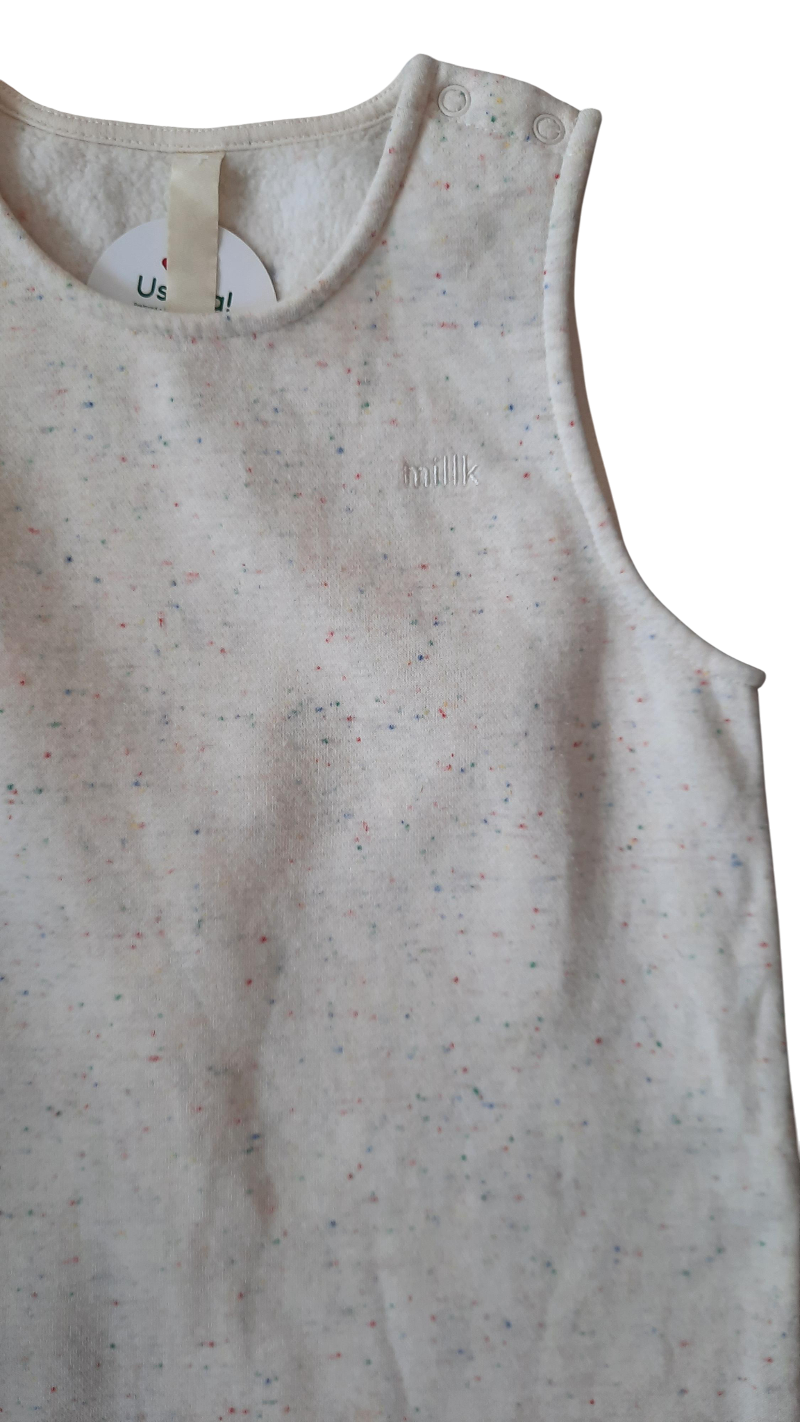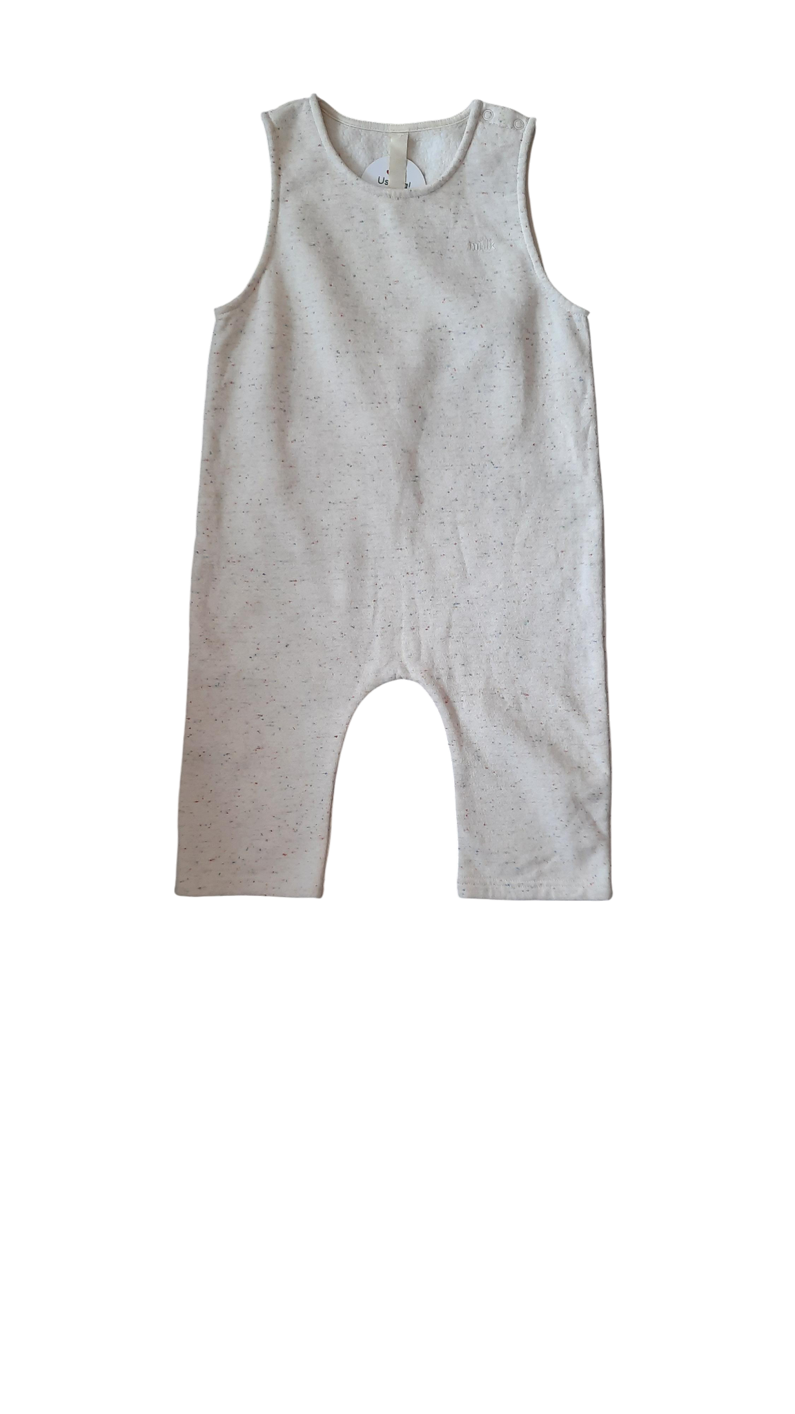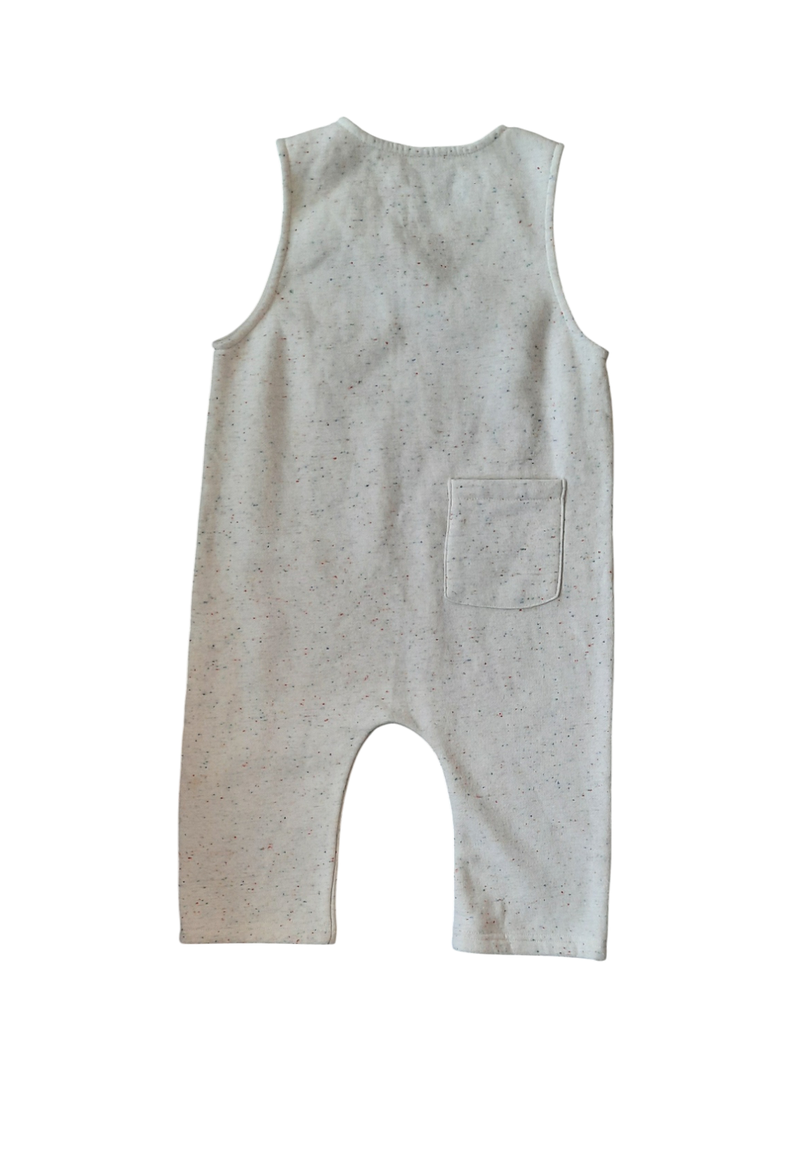 Comfy, cosy jumpsuit with spectled dot fabric. Double popper shoulder opening, loose fit, and wide armhole. Cool single pocket design on back and fleece lining. Mid-weight fabric with bound neck and armholes.