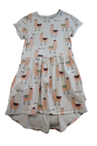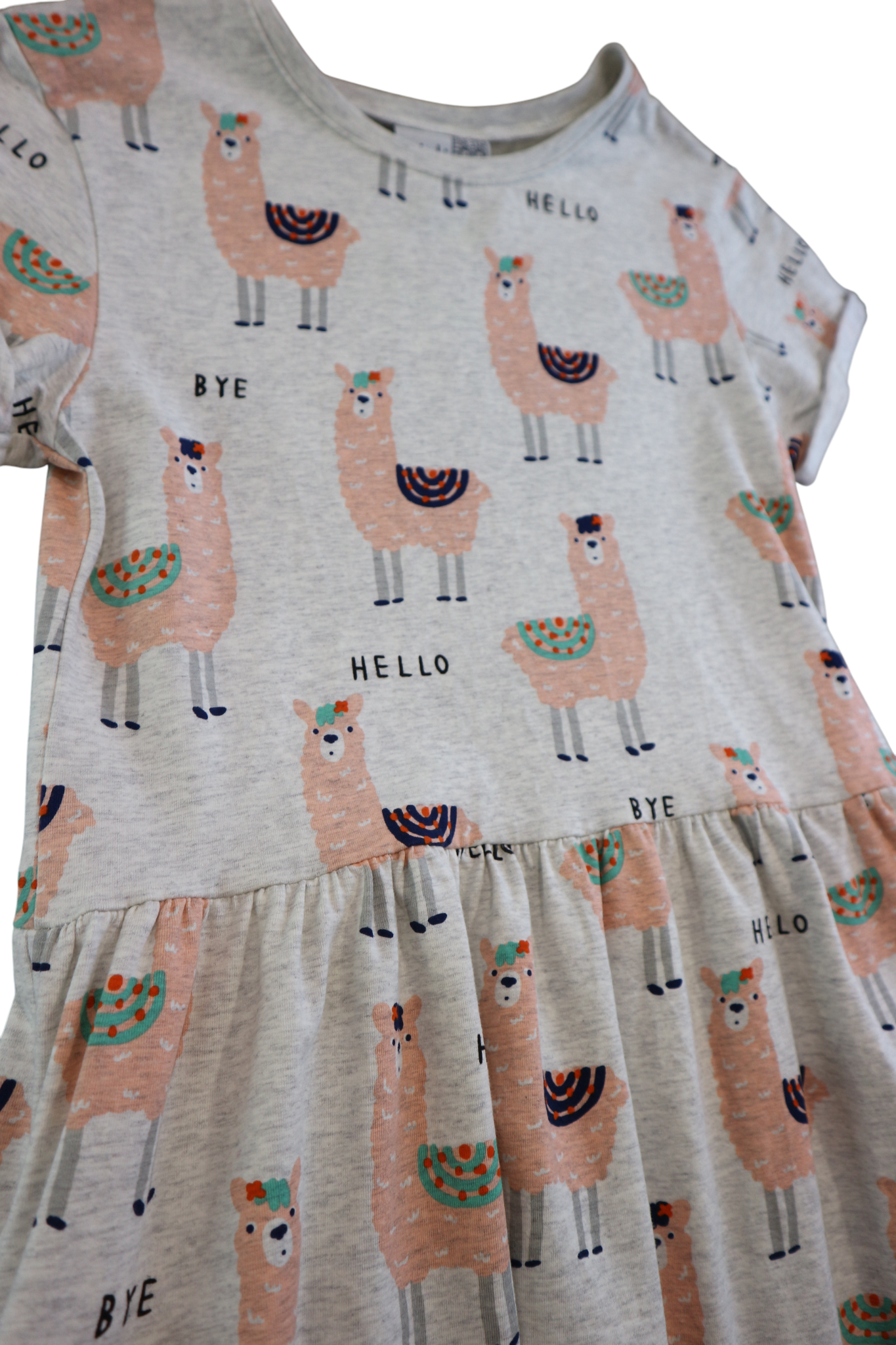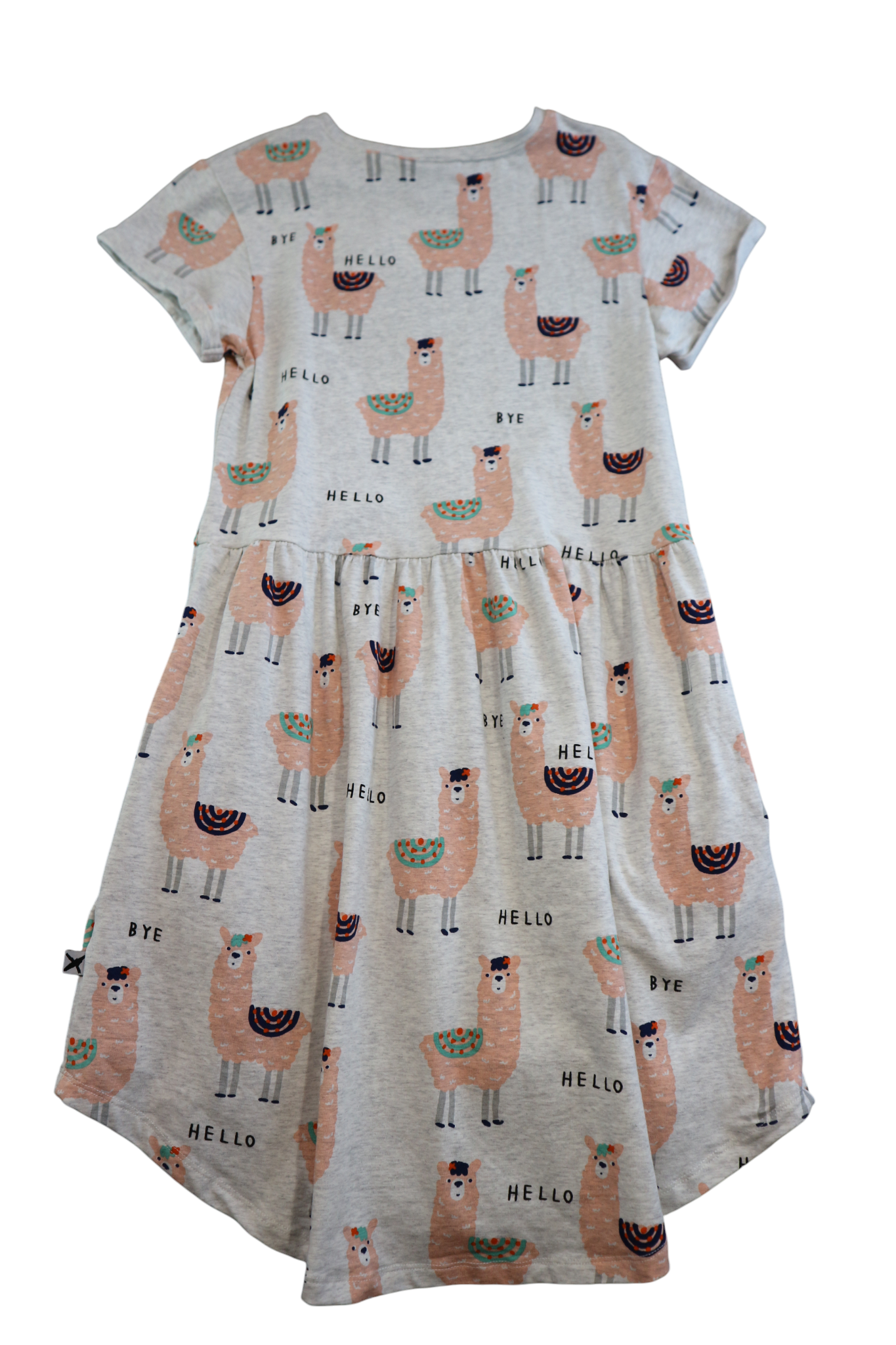 Minti grey marle dress with all-over llama print, size 10. Side pockets. Cotton/elastane.
