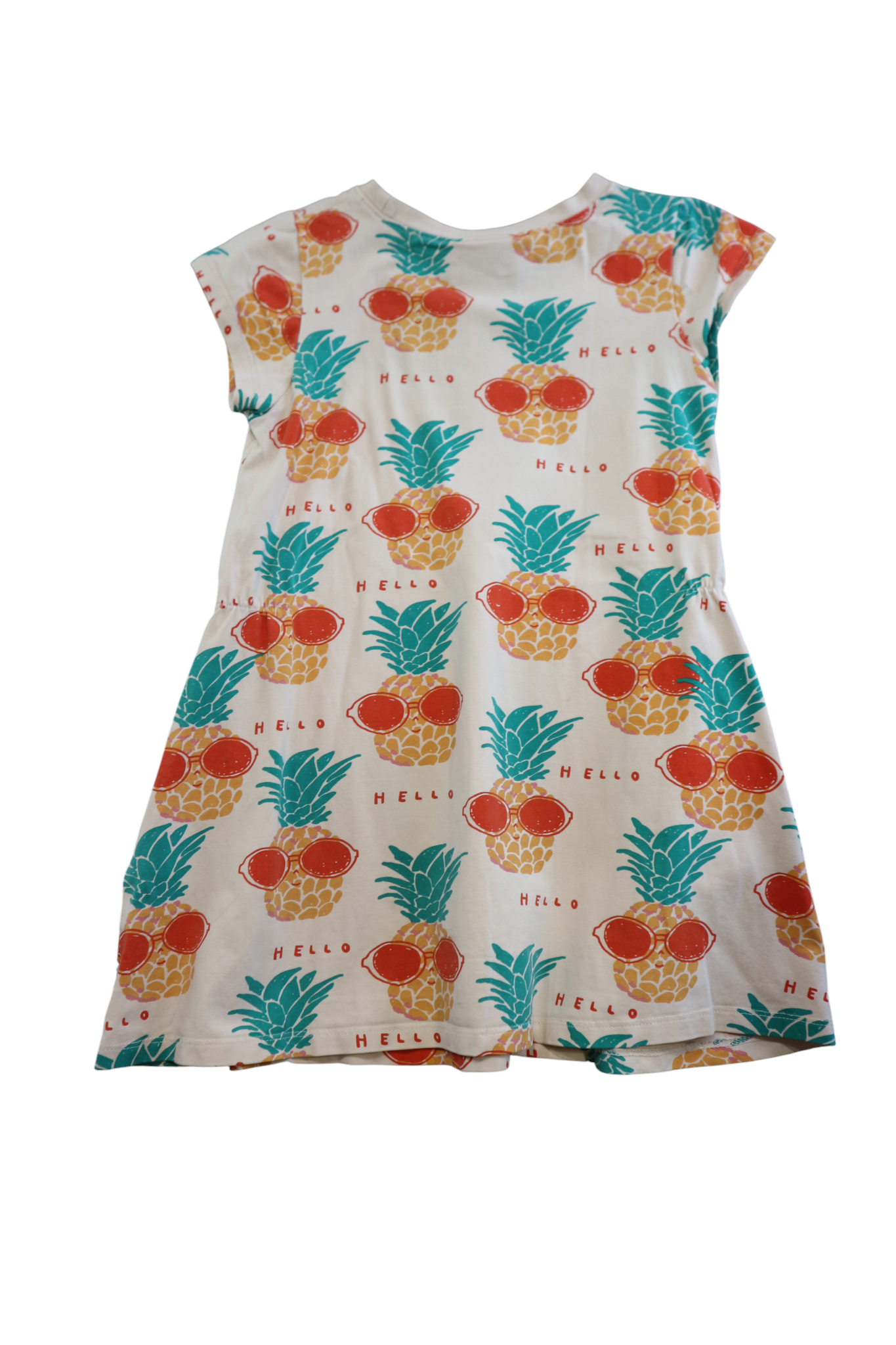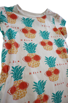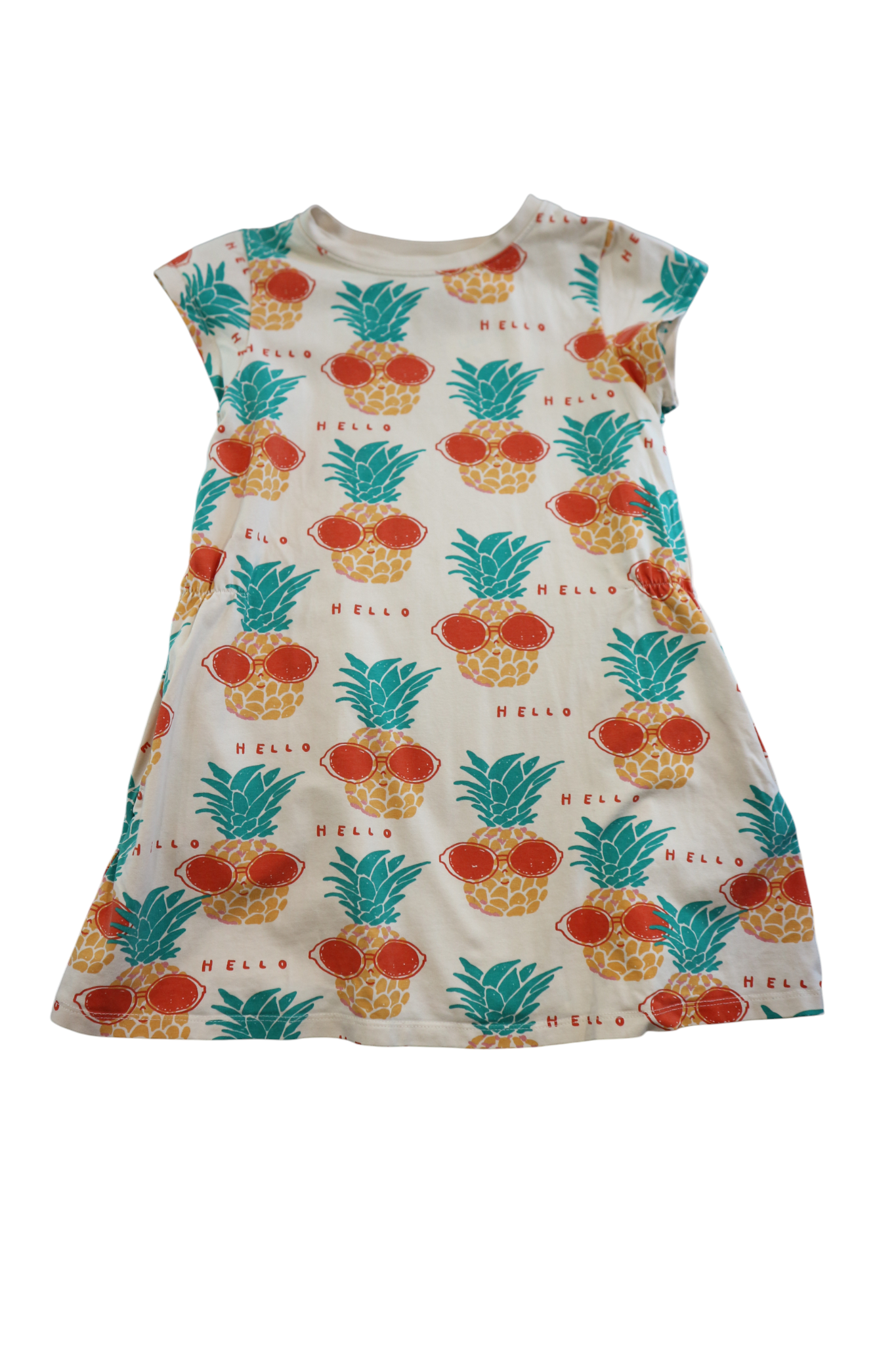 Minti 'Hello' pineapple print pink dress in size 6. Includes side pockets. Cotton/elastane.