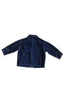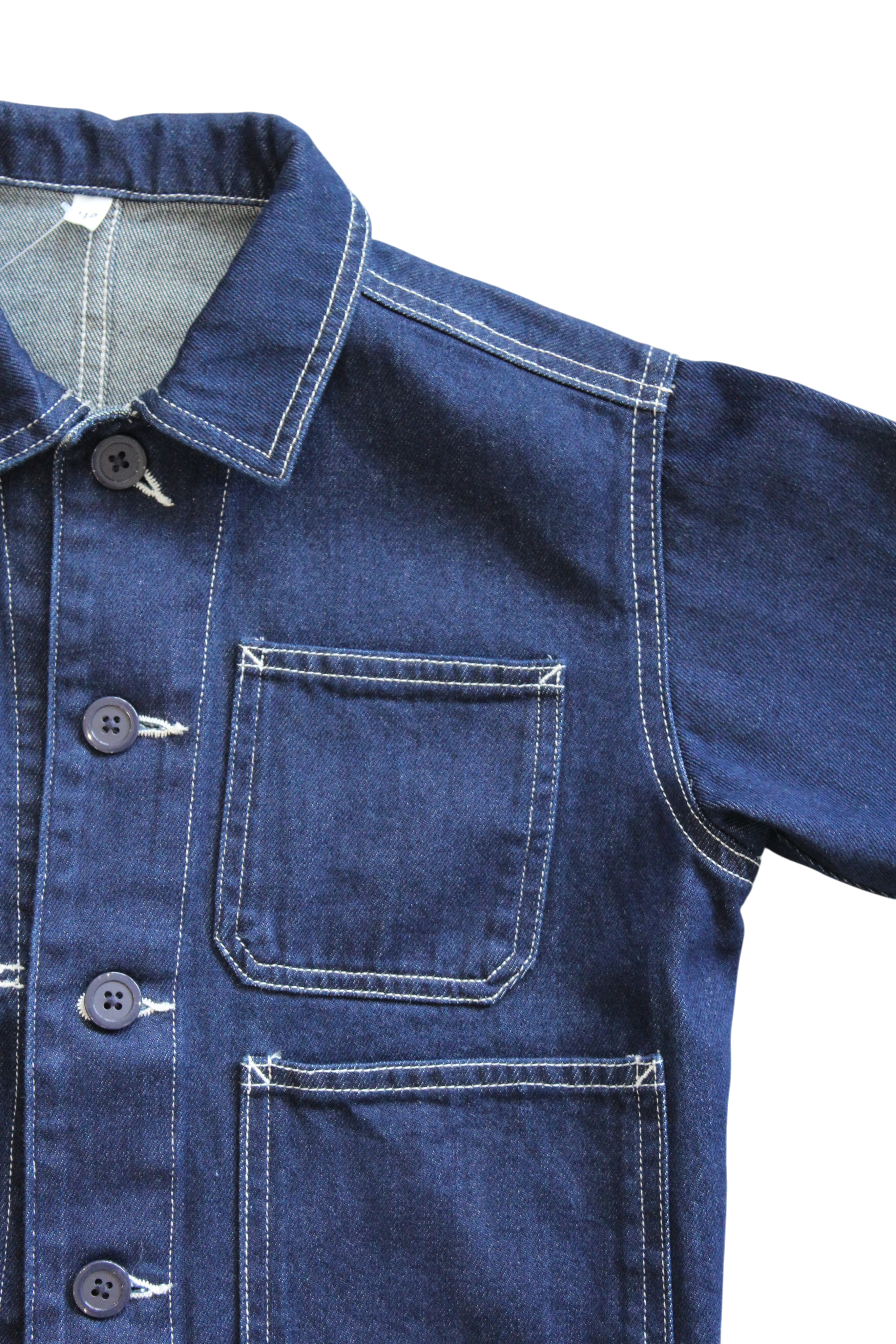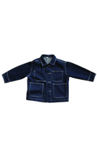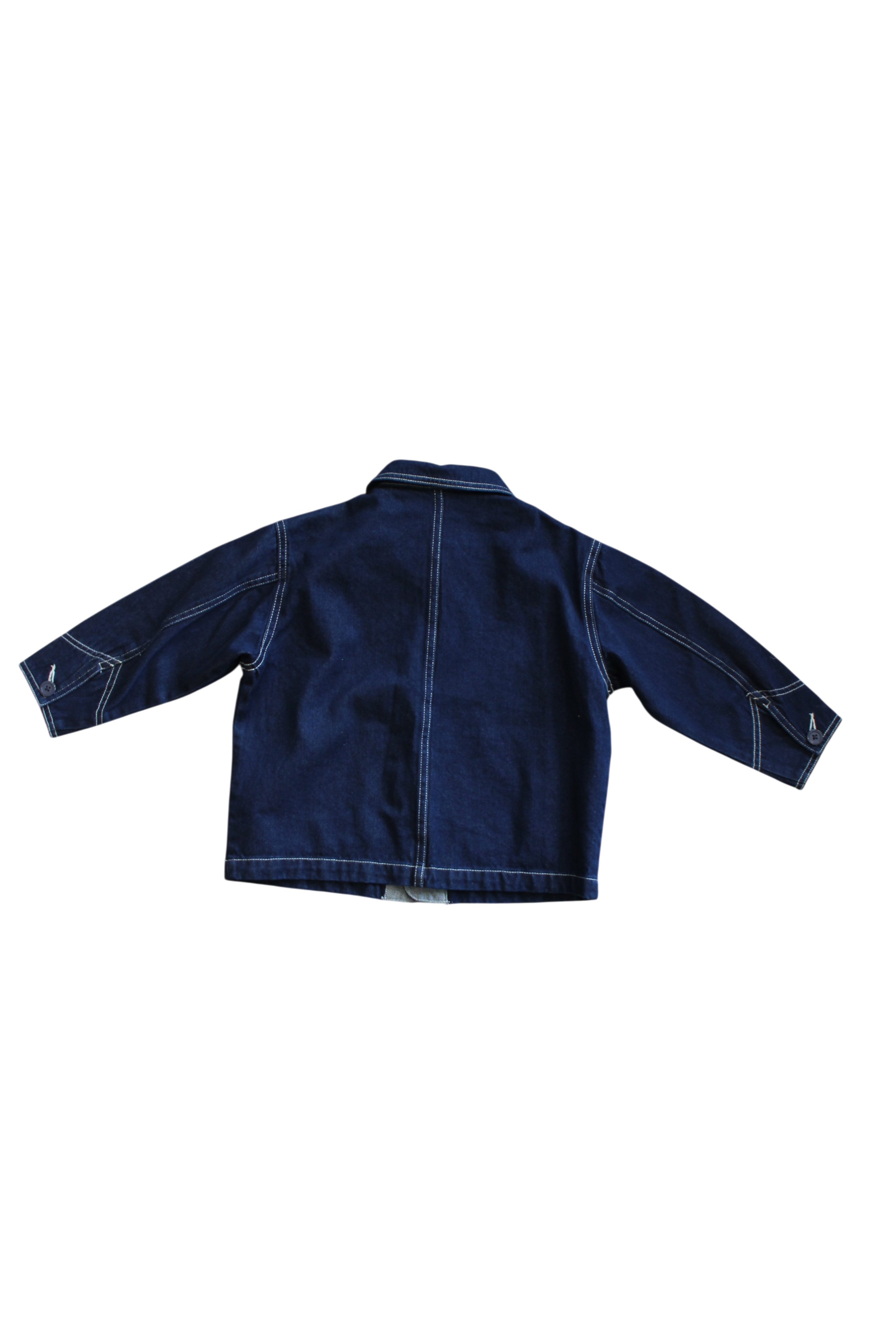 Mid-weight dark denim button-up jacket. With cool detailing, white stitching, and a four-pocket design on the front. short boxy fit with sleeve buttons and classic collar.